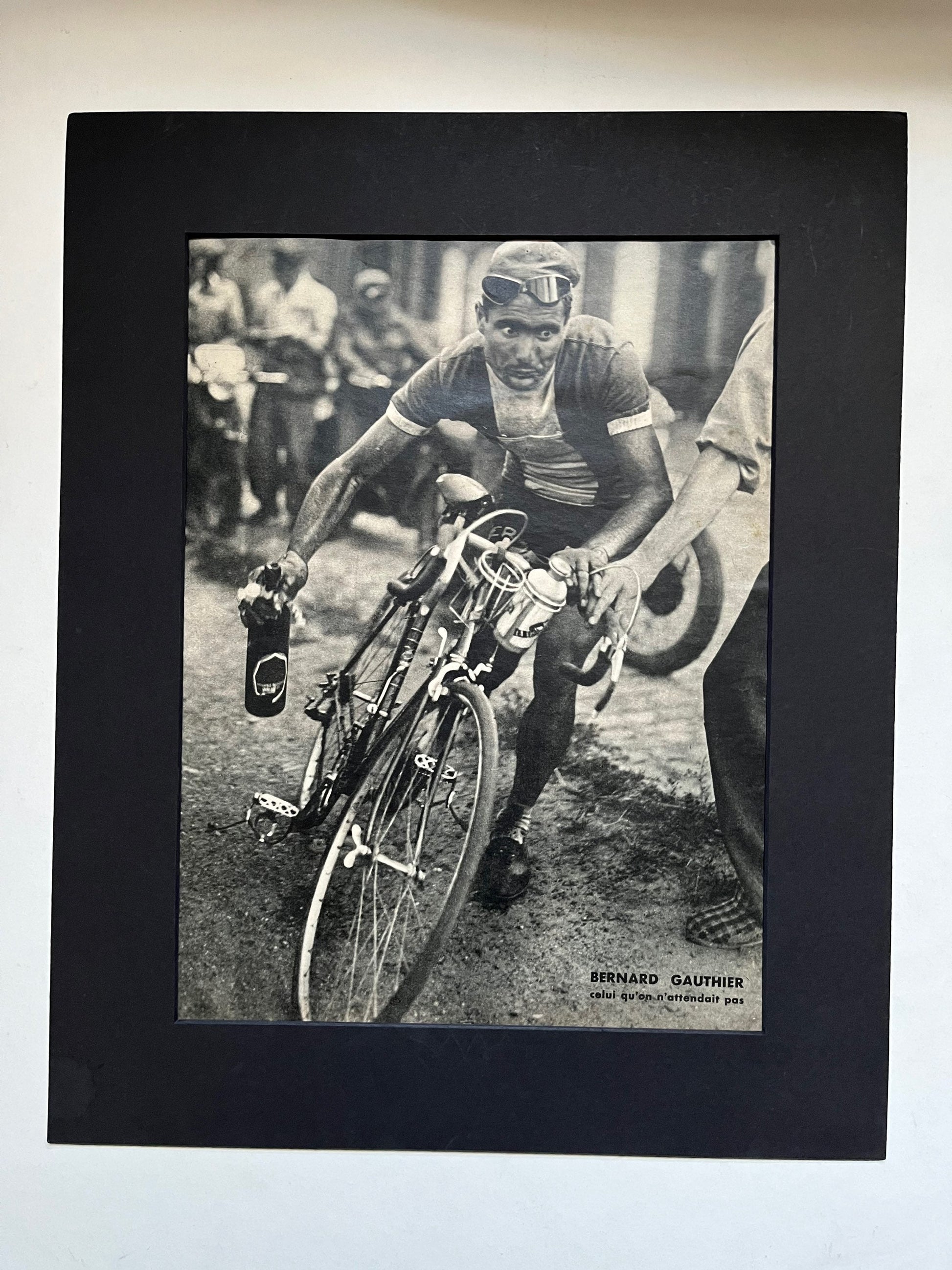 Iconic and very rare Original 1950 French cycling magazine print showing rider Bernard Gauthier wheeling his bike.