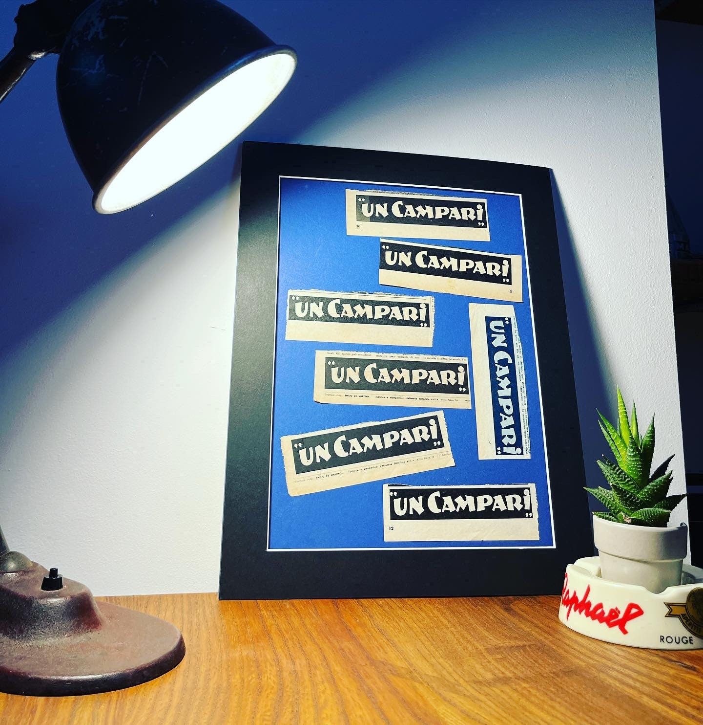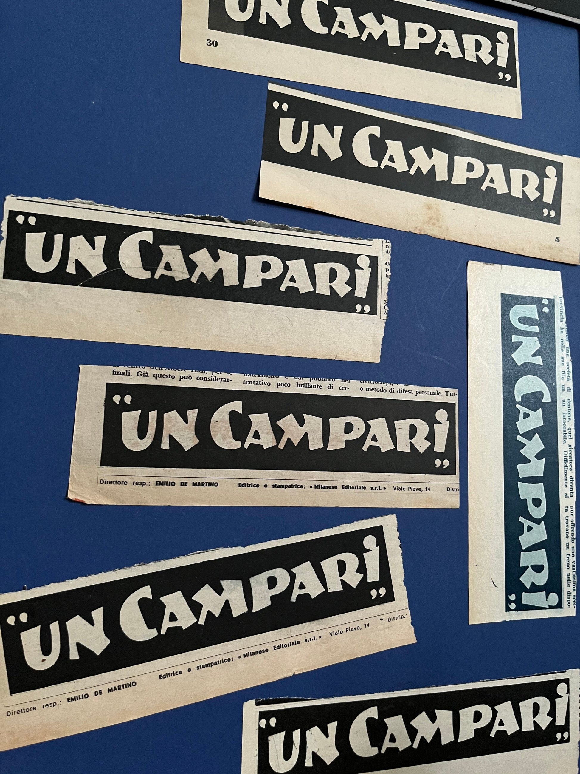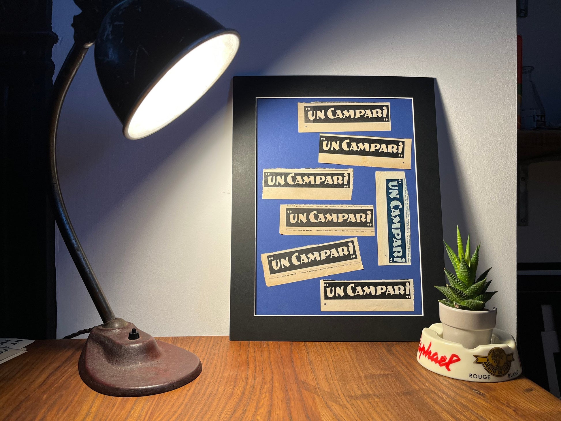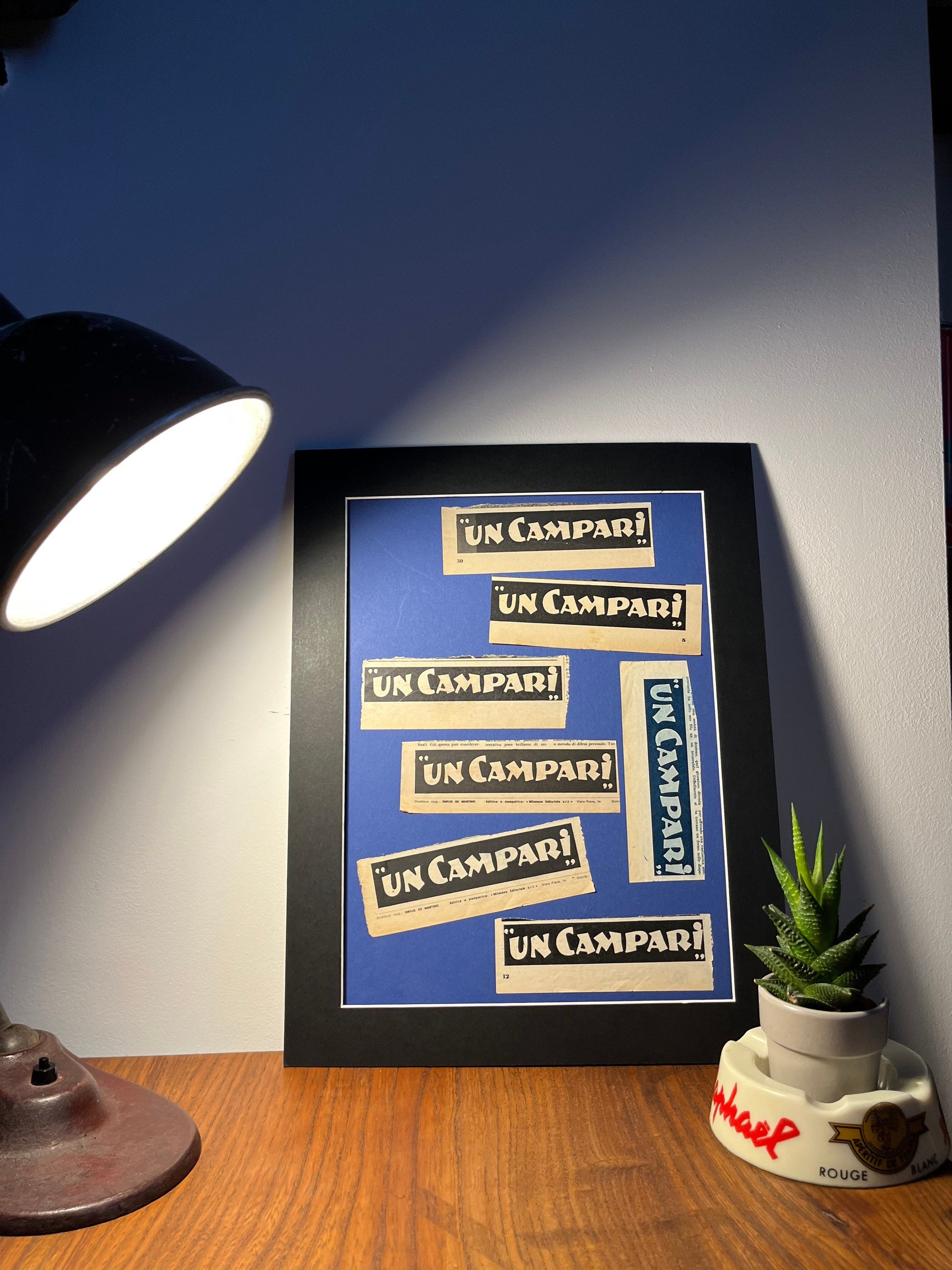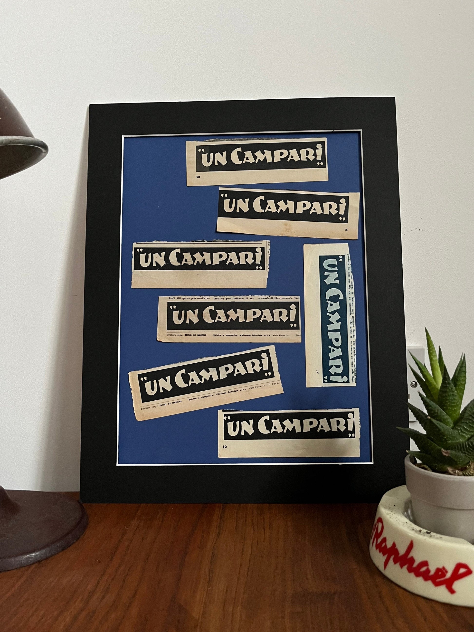 Eight Original 1950s Campari advertisement logos cut and mounted onto blue card and ready for framing. This is an original print and not a scanned copy.. A superb piece of artwork and an excellent gift