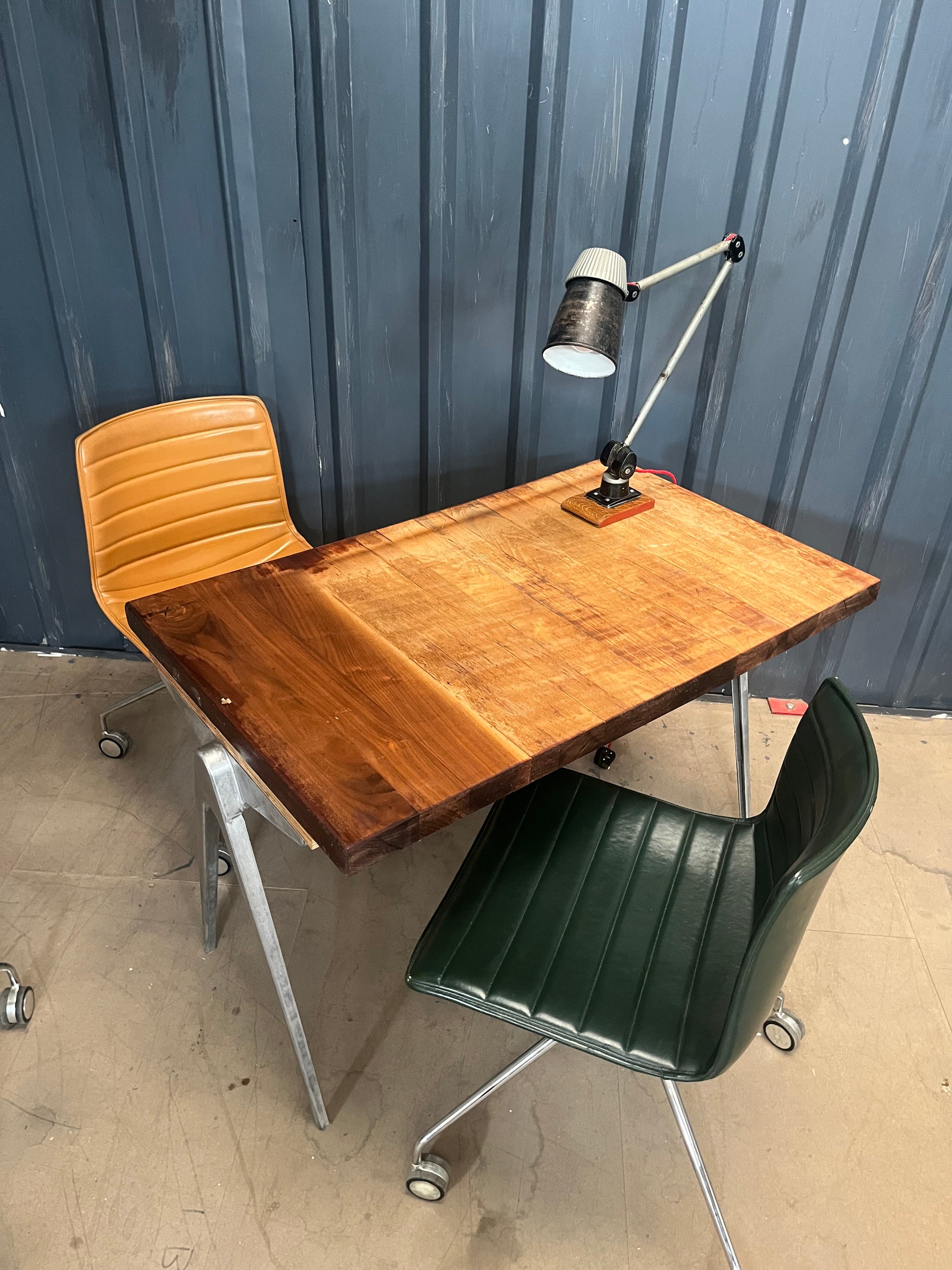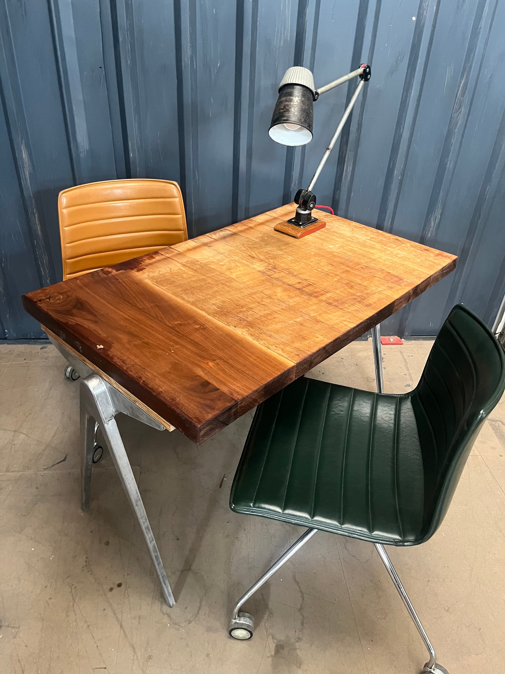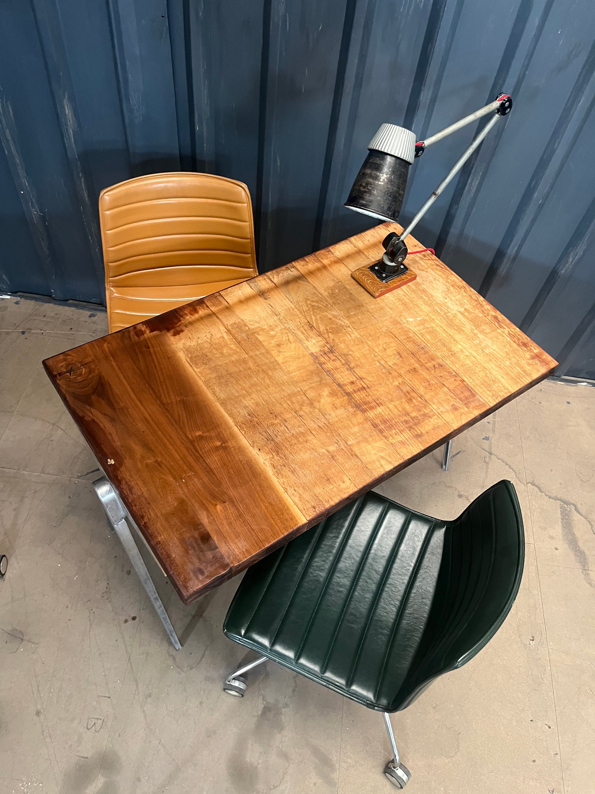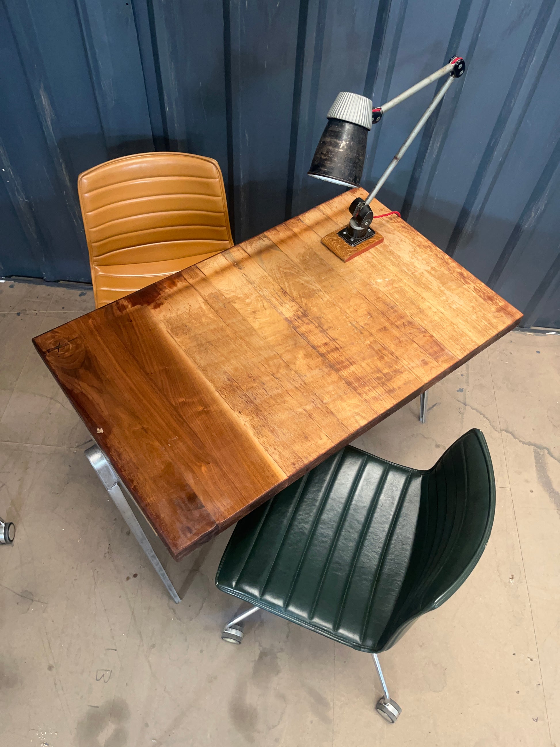 1950s James Leonard compass leg Desk with reclaimed oak top