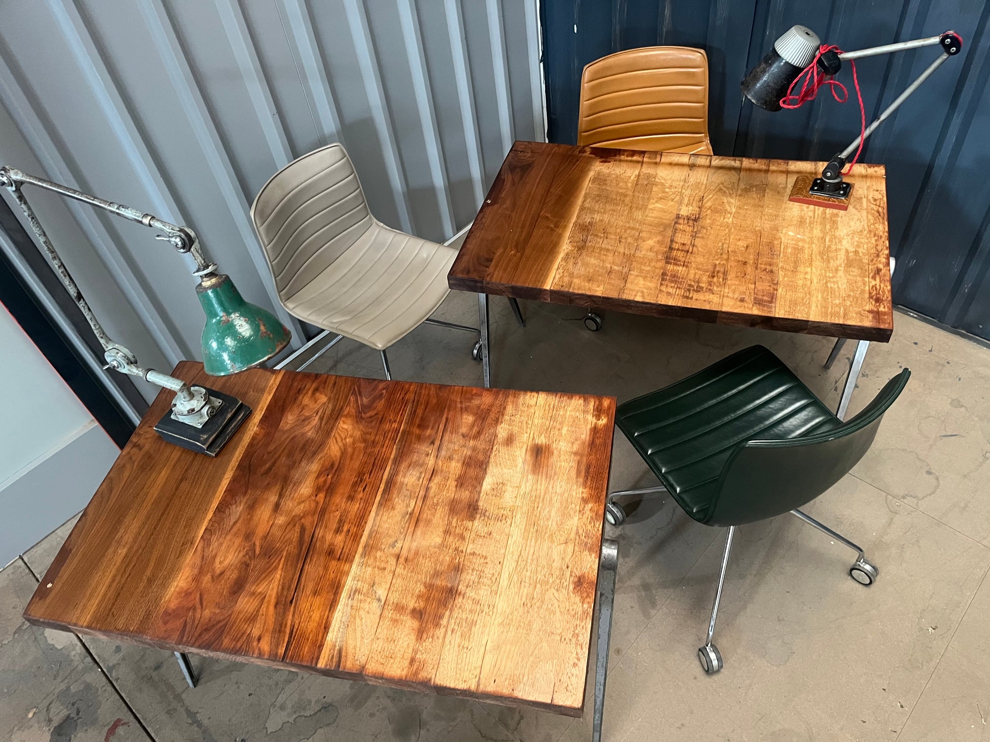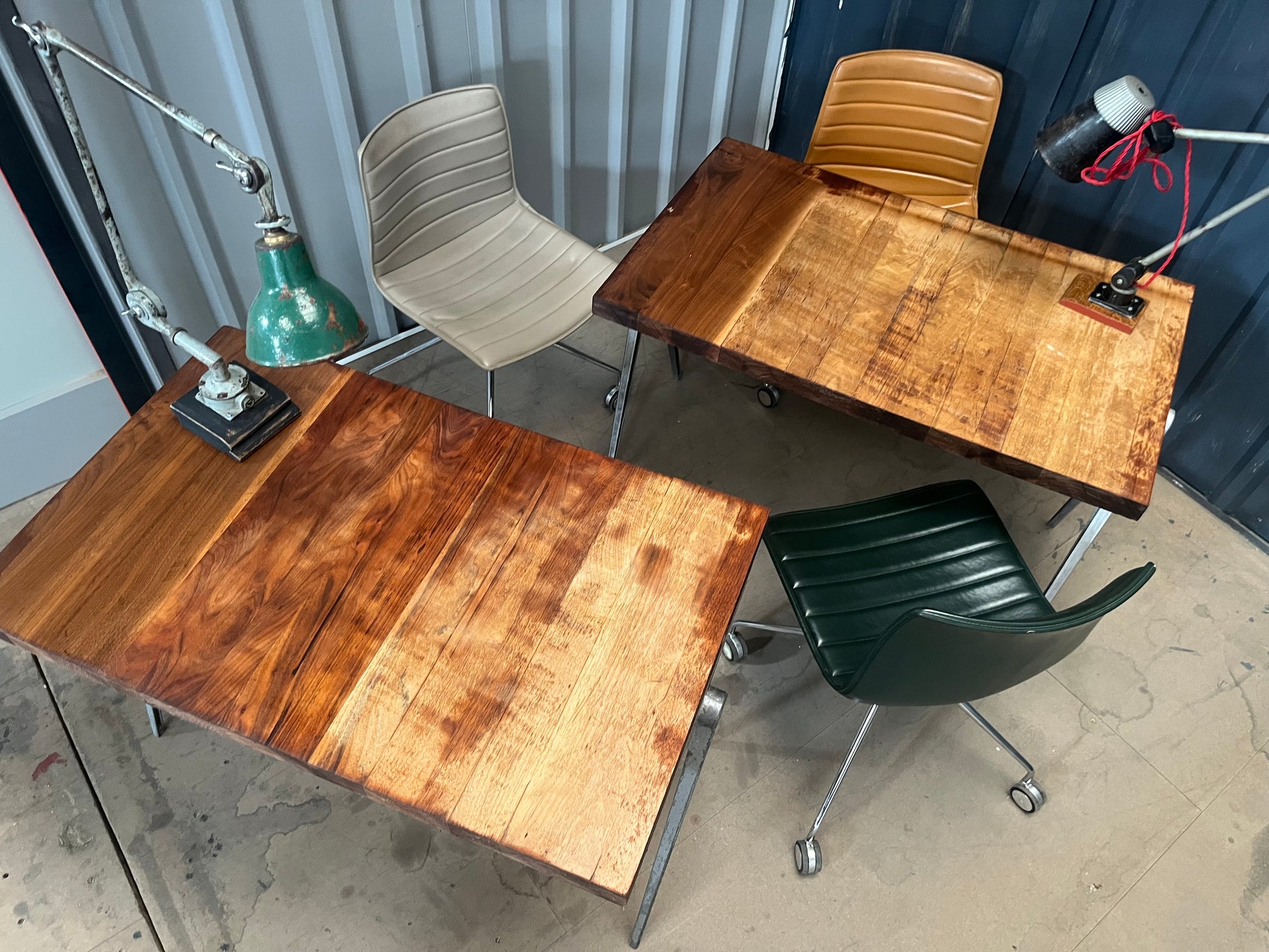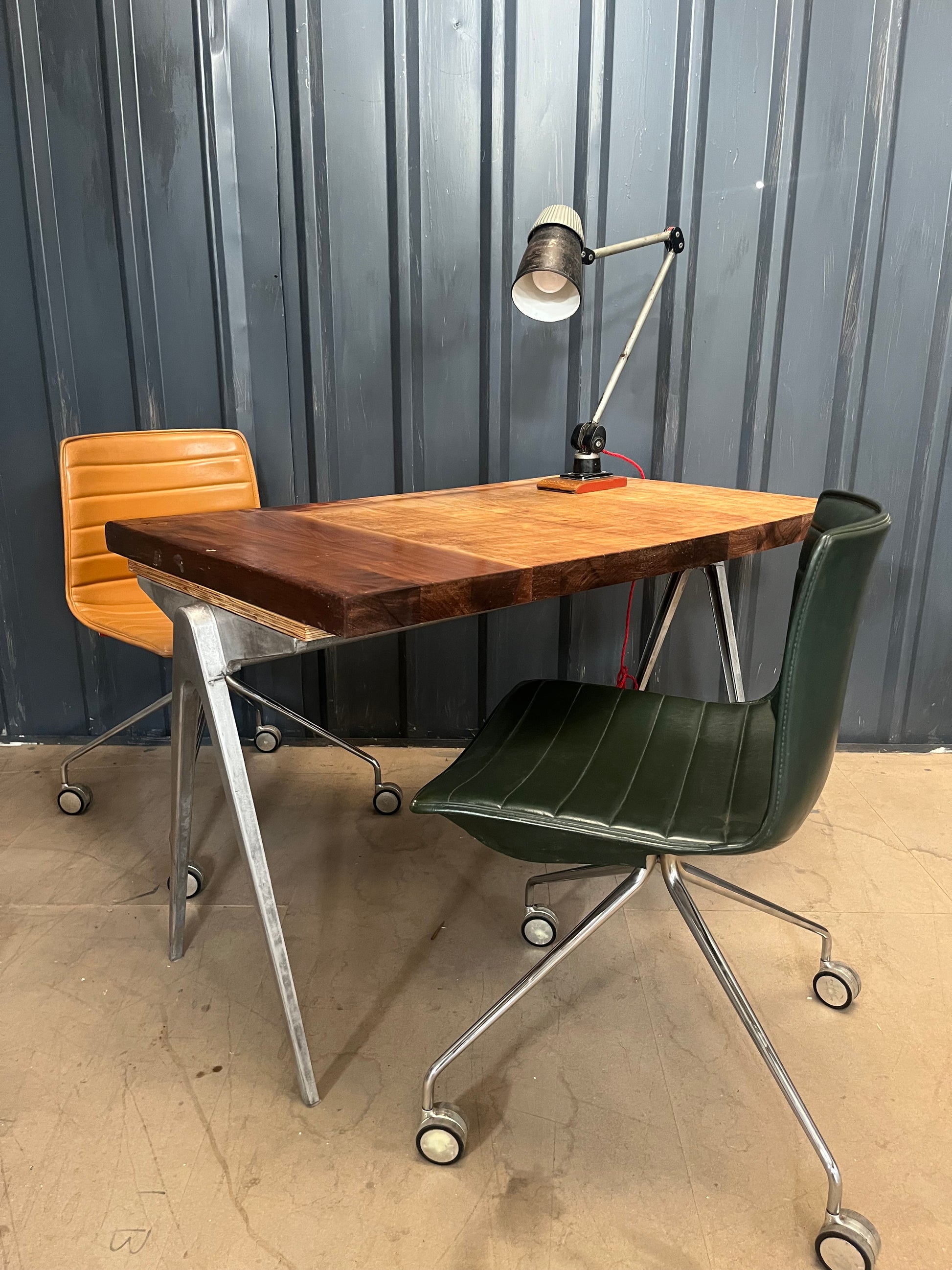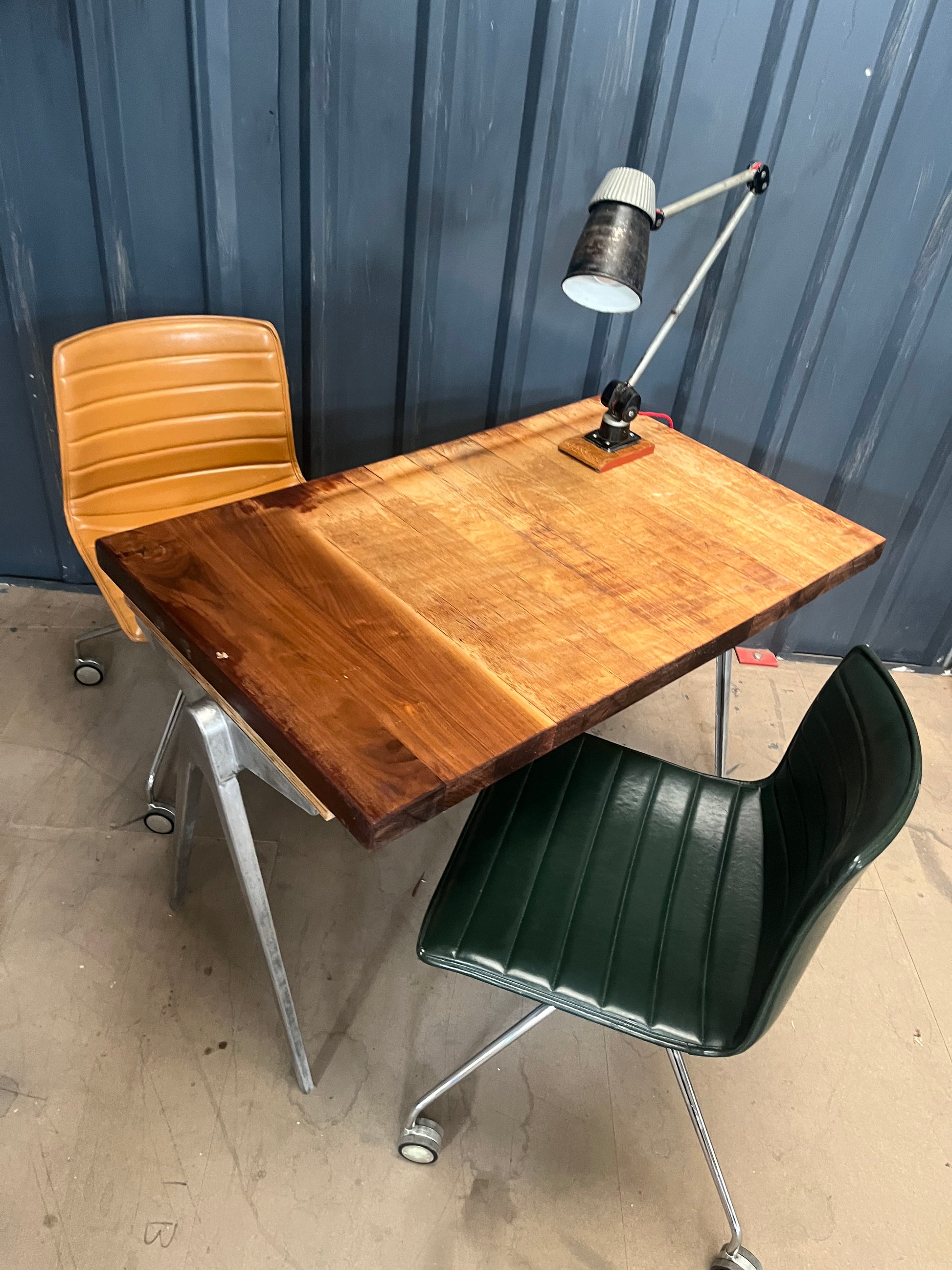 1950s James Leonard compass leg Desk with reclaimed oak top