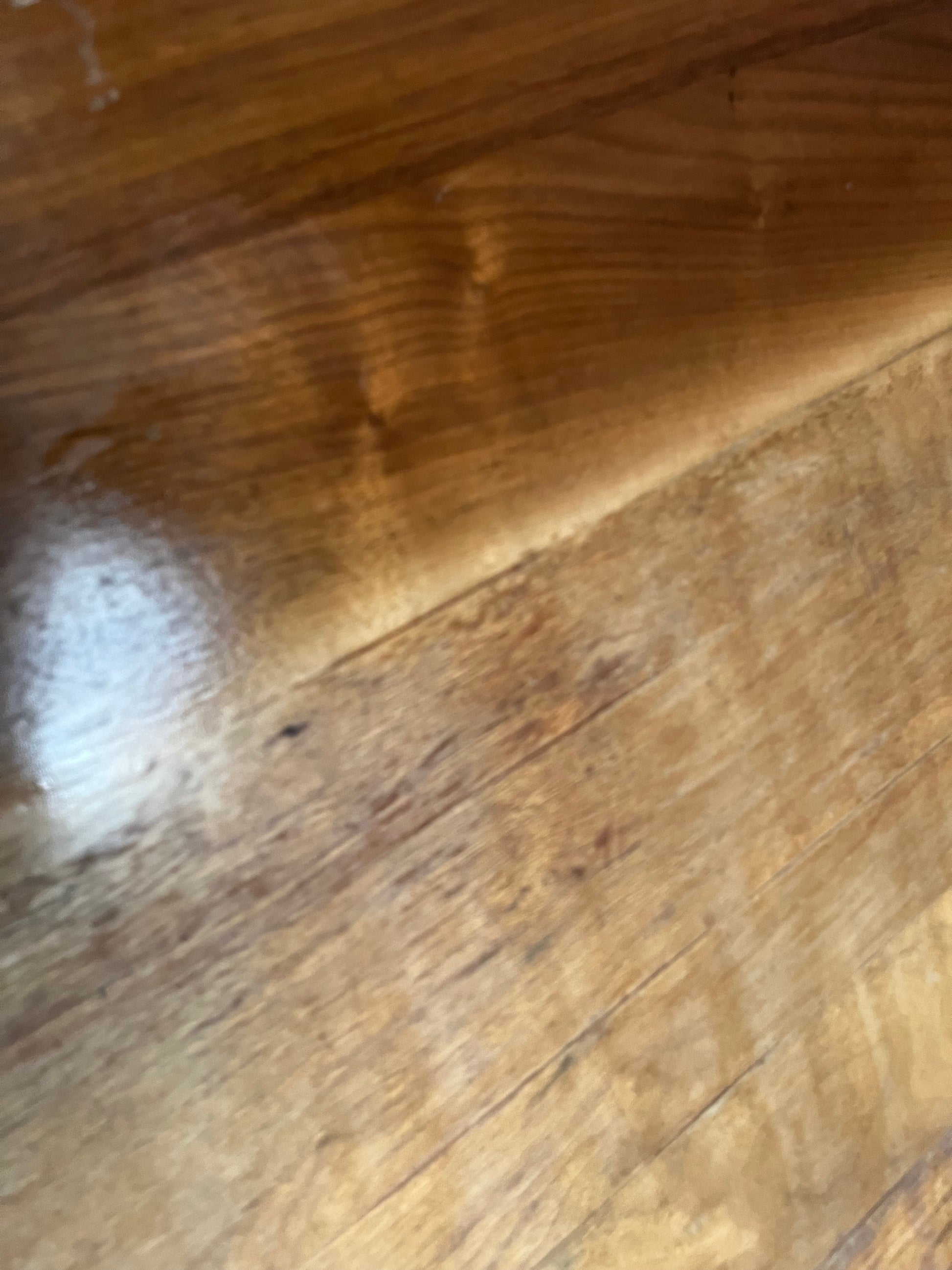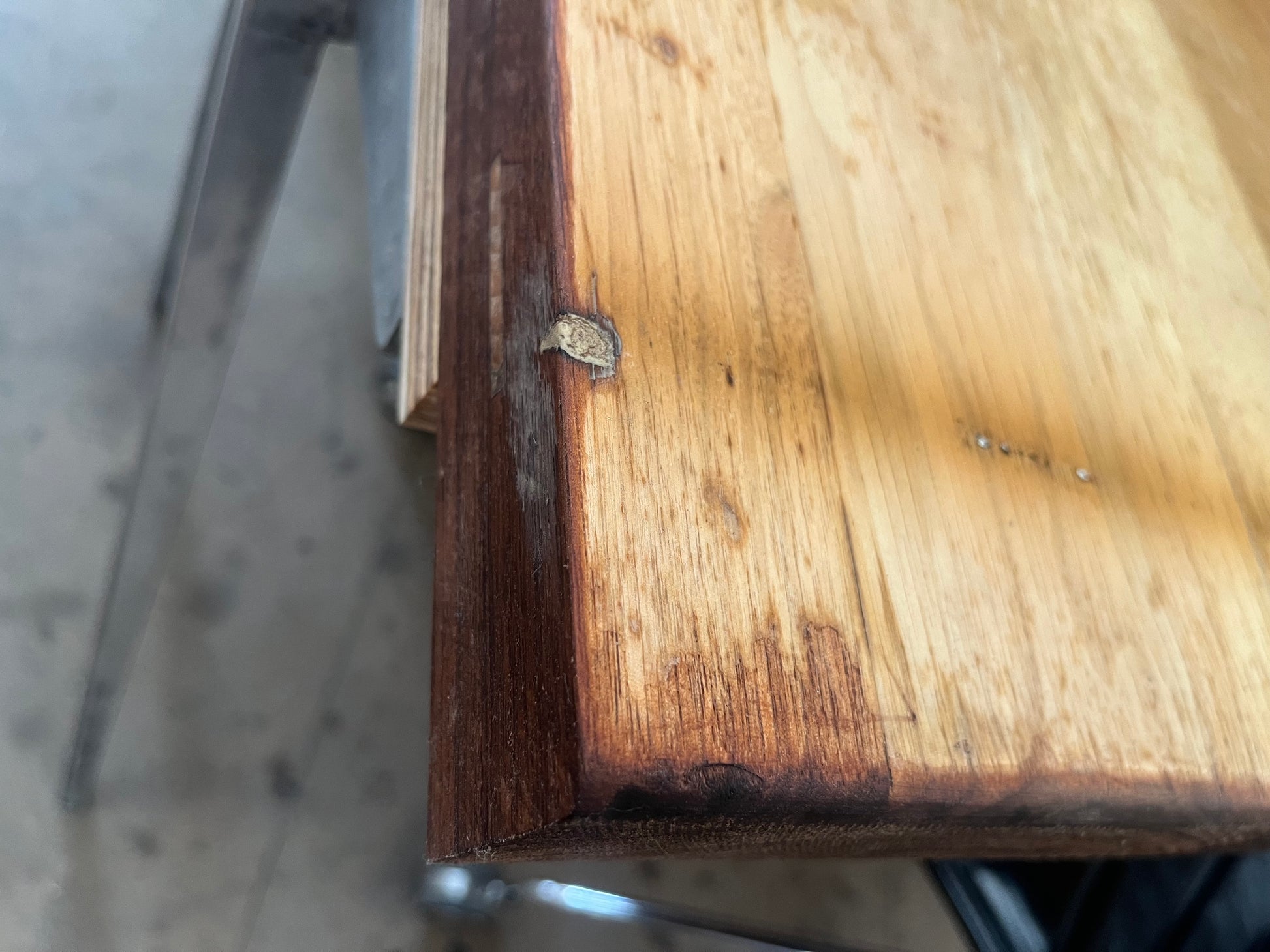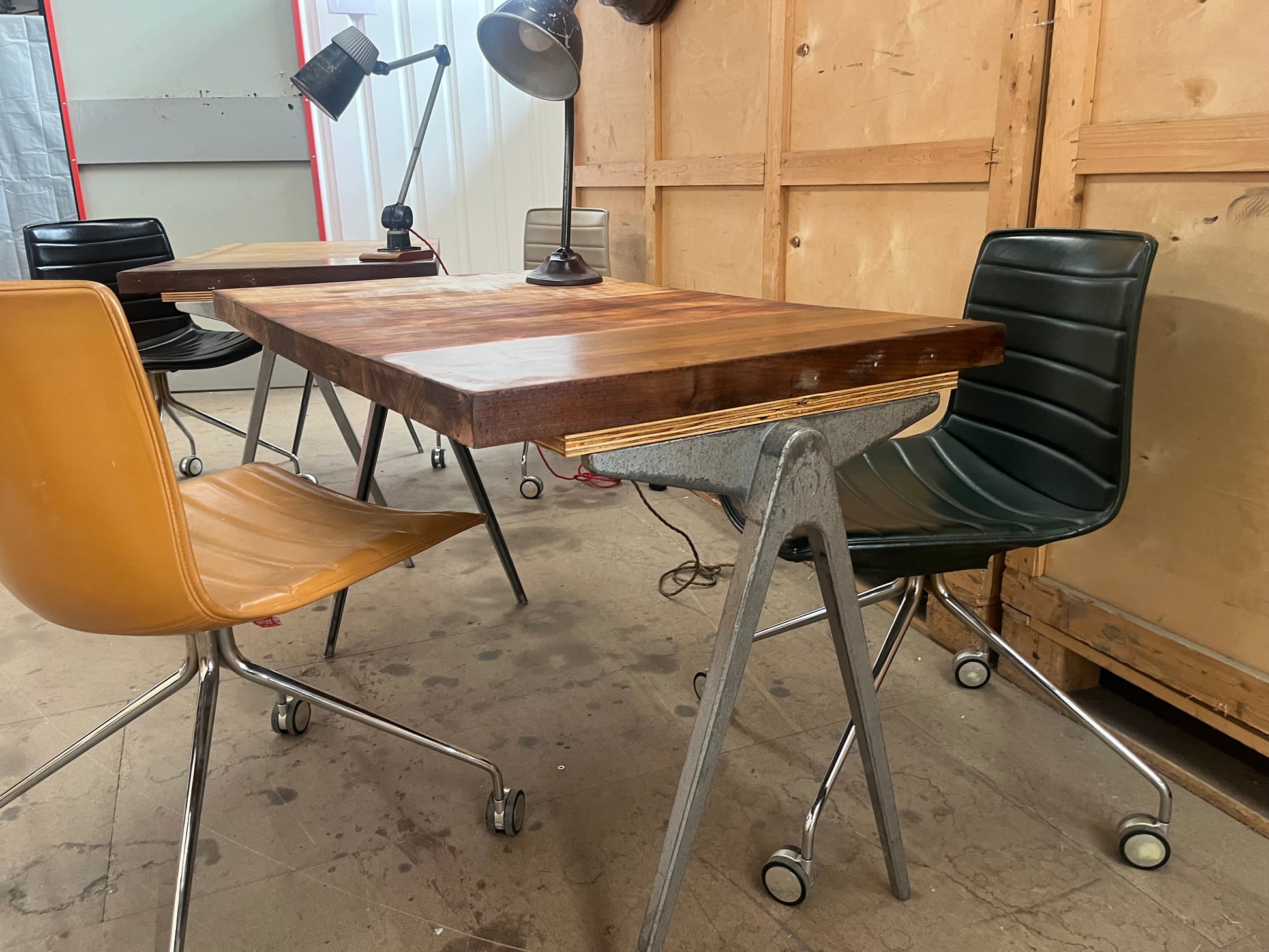 Two tables are available. They have been fitted with reclaimed oak which was originally a shop counter. The wood has been lightly cleaned and oiled and left unrestored for a rustic authentic antique finish. There are blemishes, ageing and a slight irregularity in the top which adds to its charm. The cast alloy compass legs have been lightly stripped and hand polished to highlight their form and aesthetic.