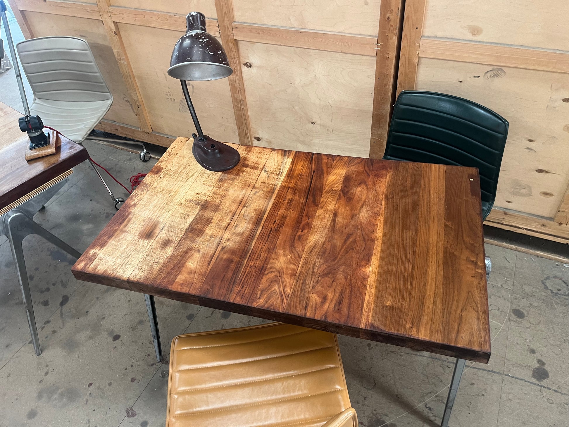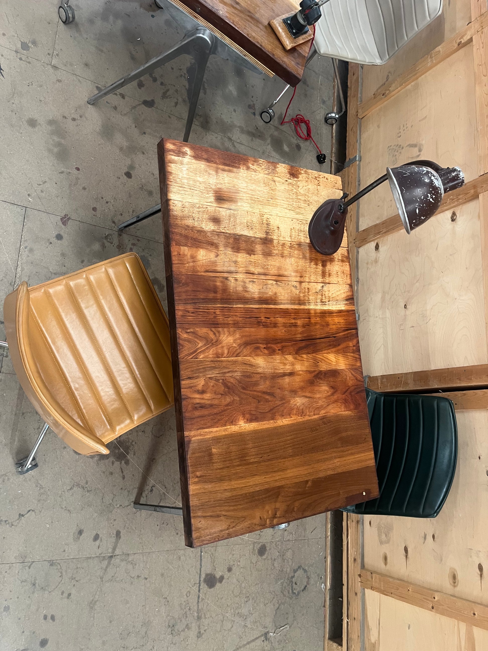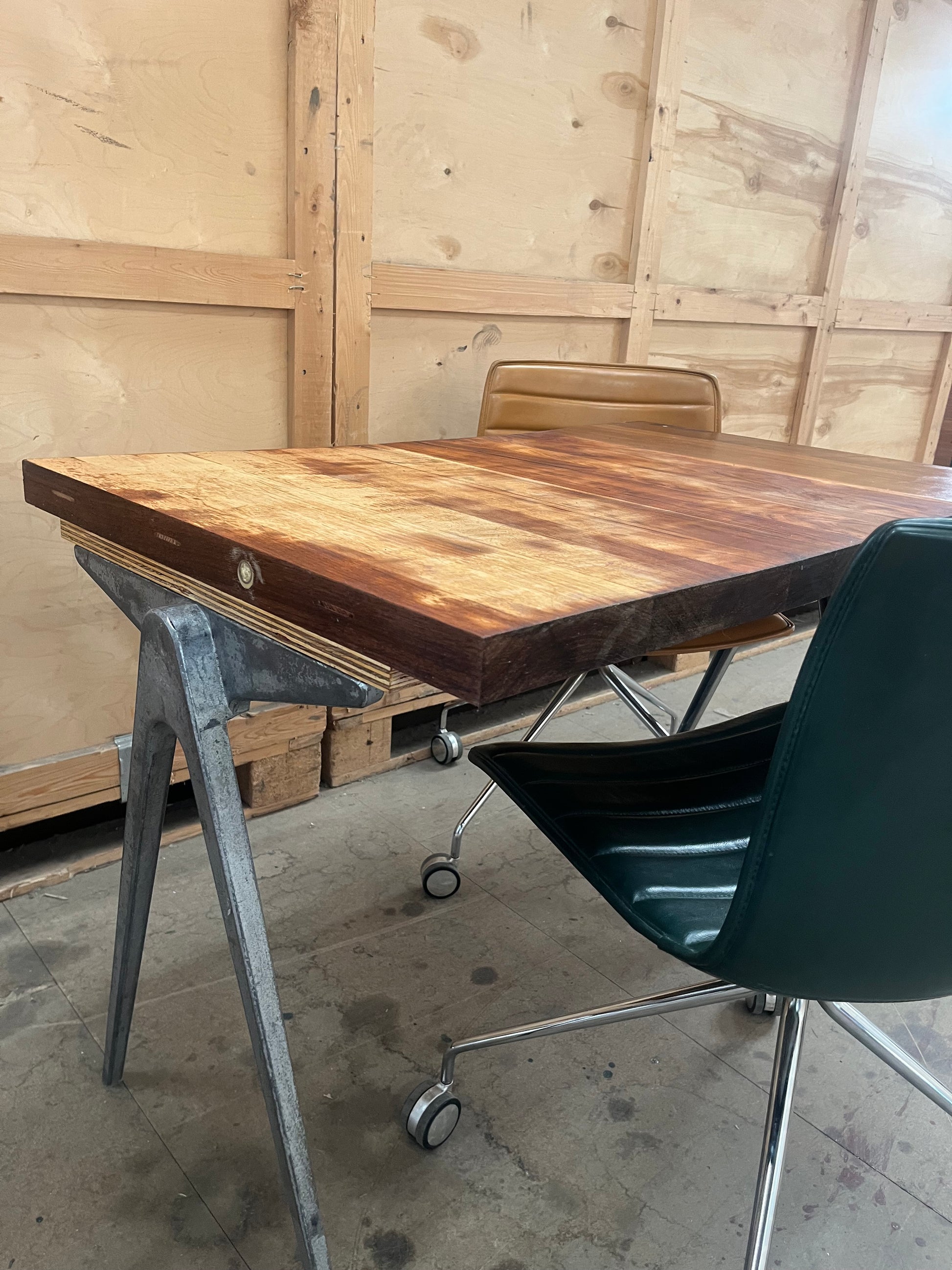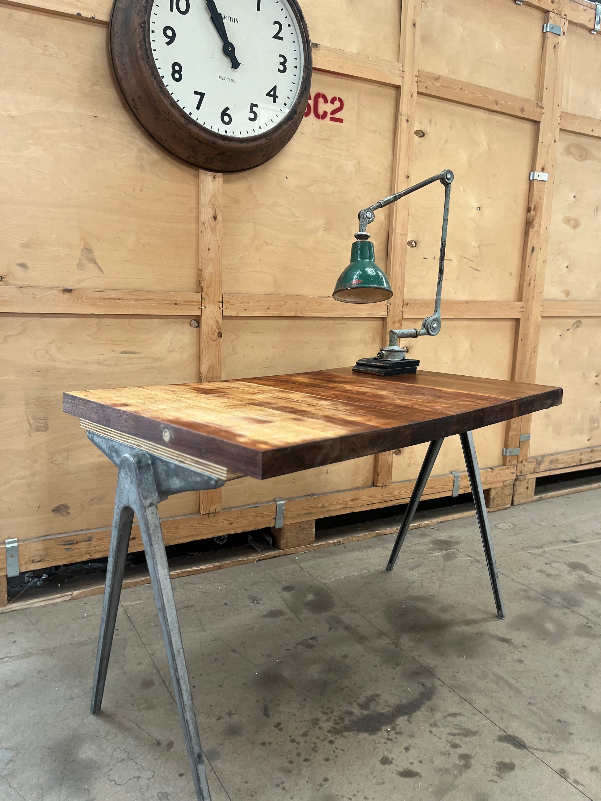 1950s James Leonard compass leg Desk with reclaimed oak top