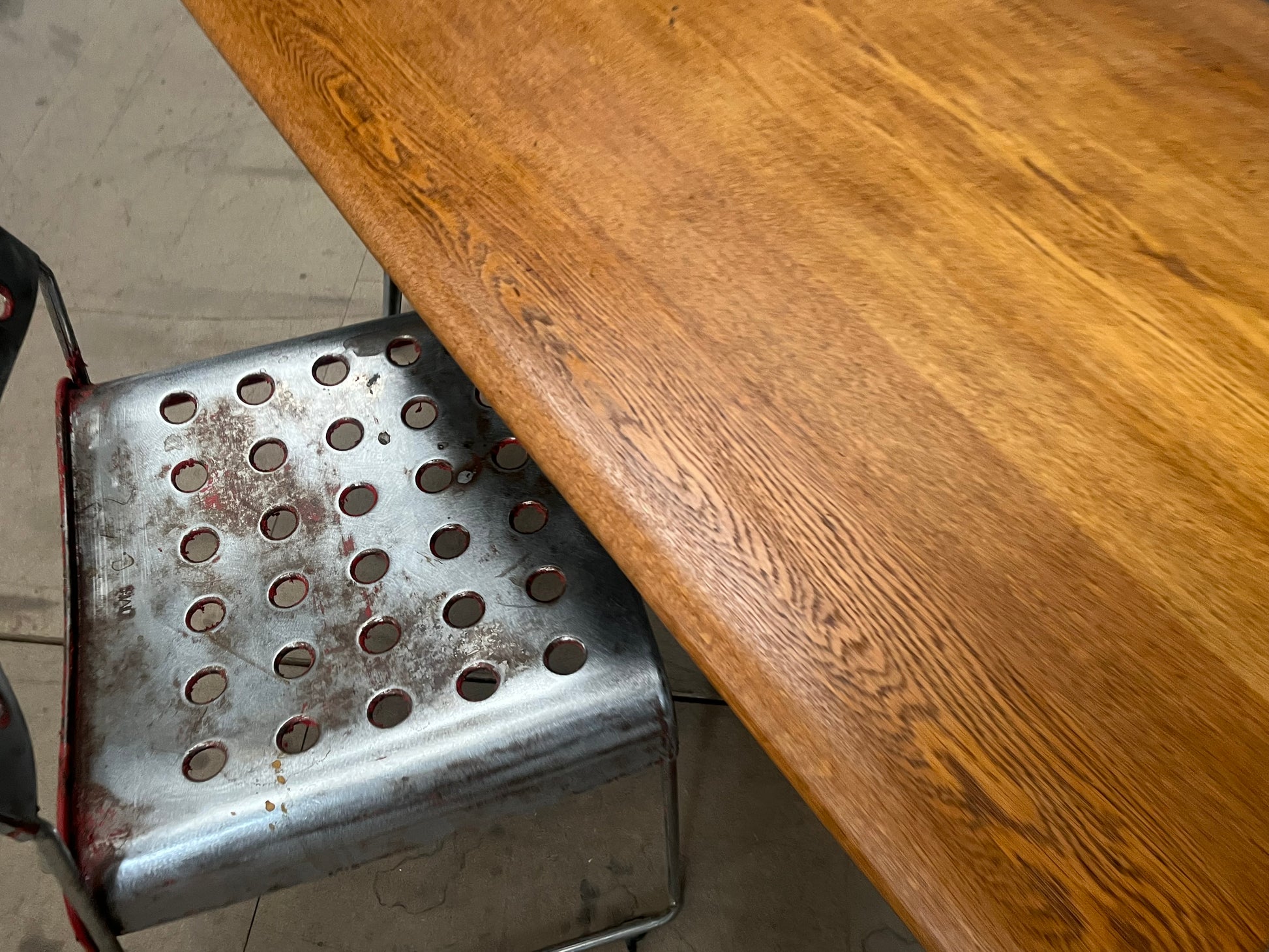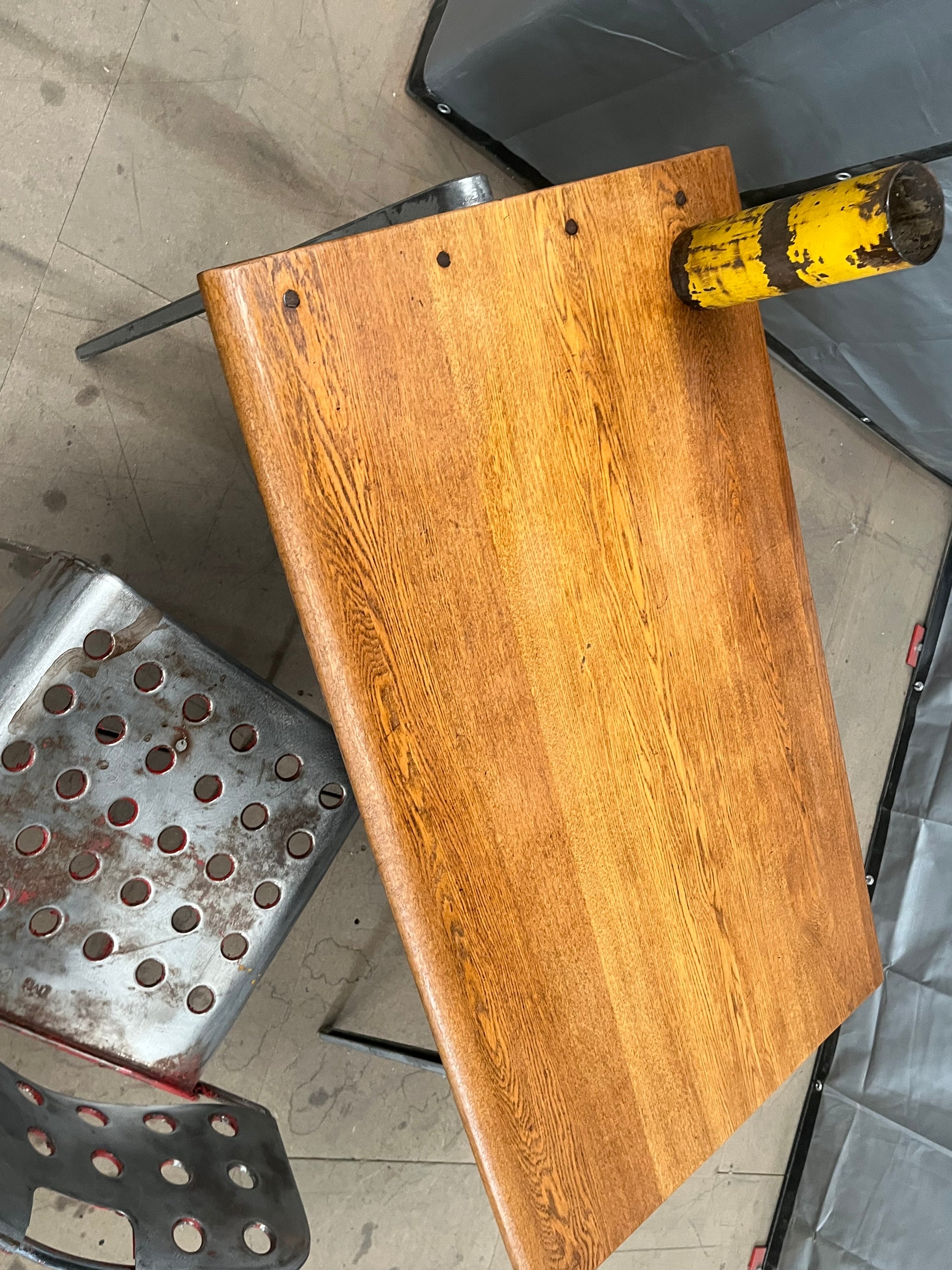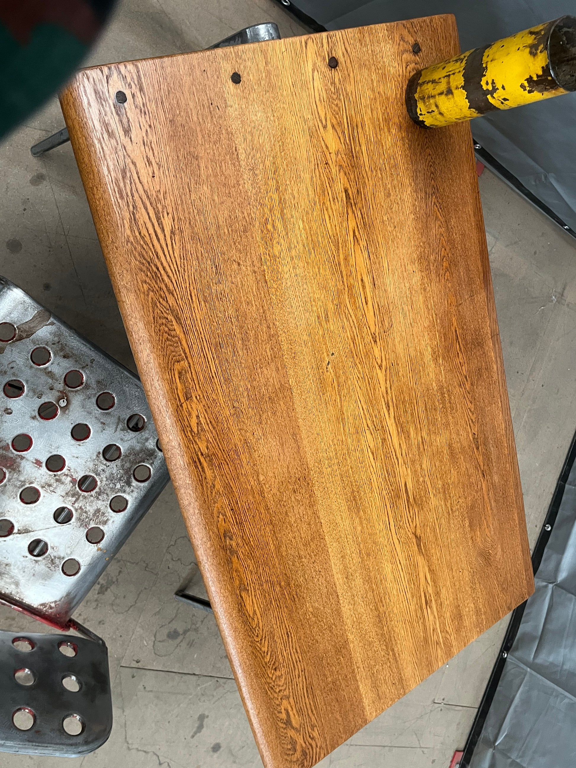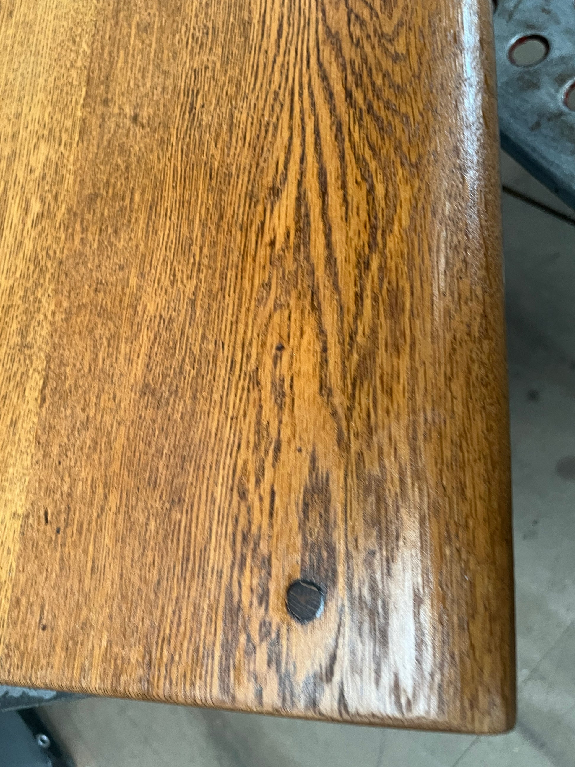 The elm top has been stripped and sanded and treated with oil and wax. The grain is truly beautiful.