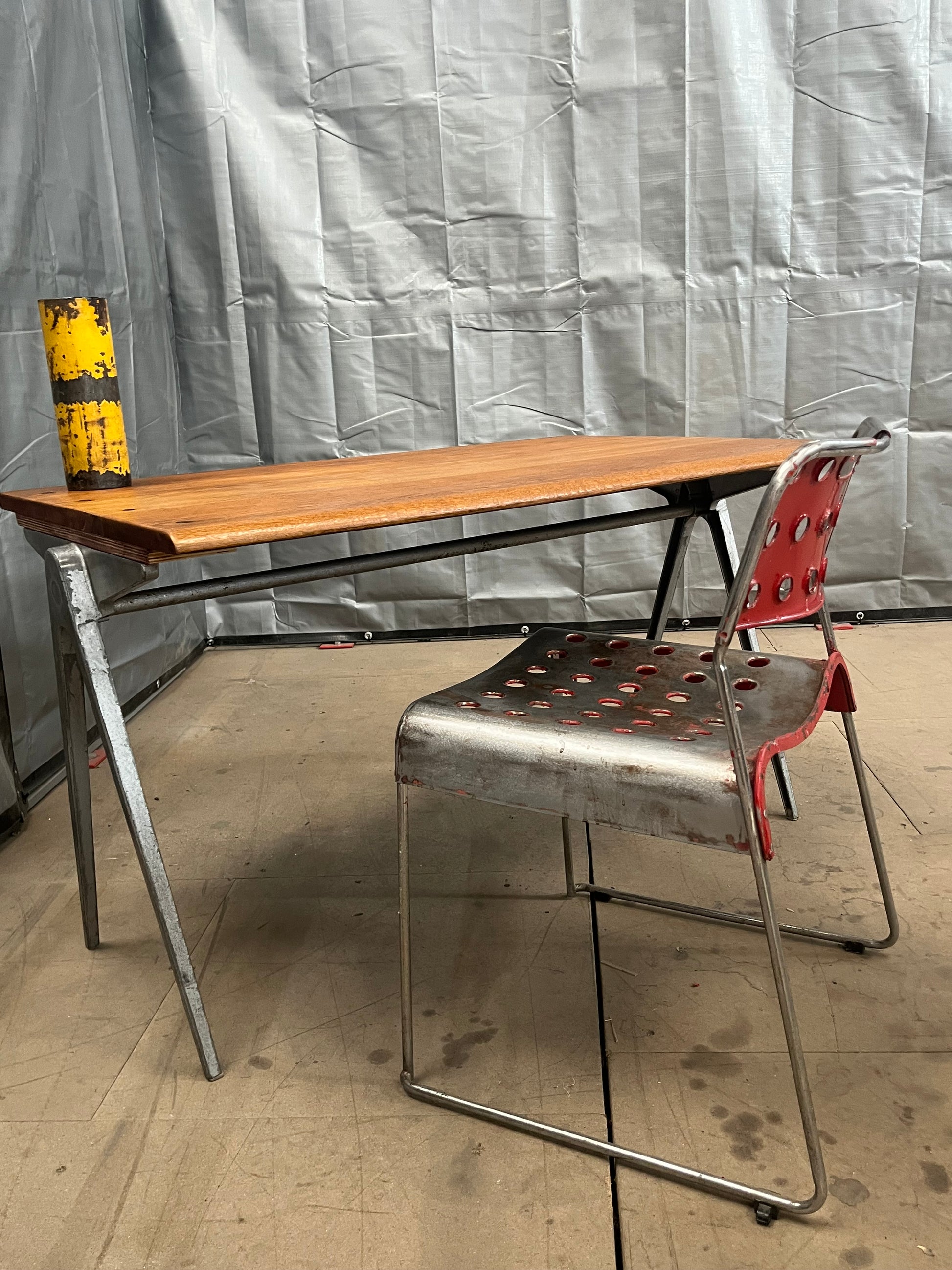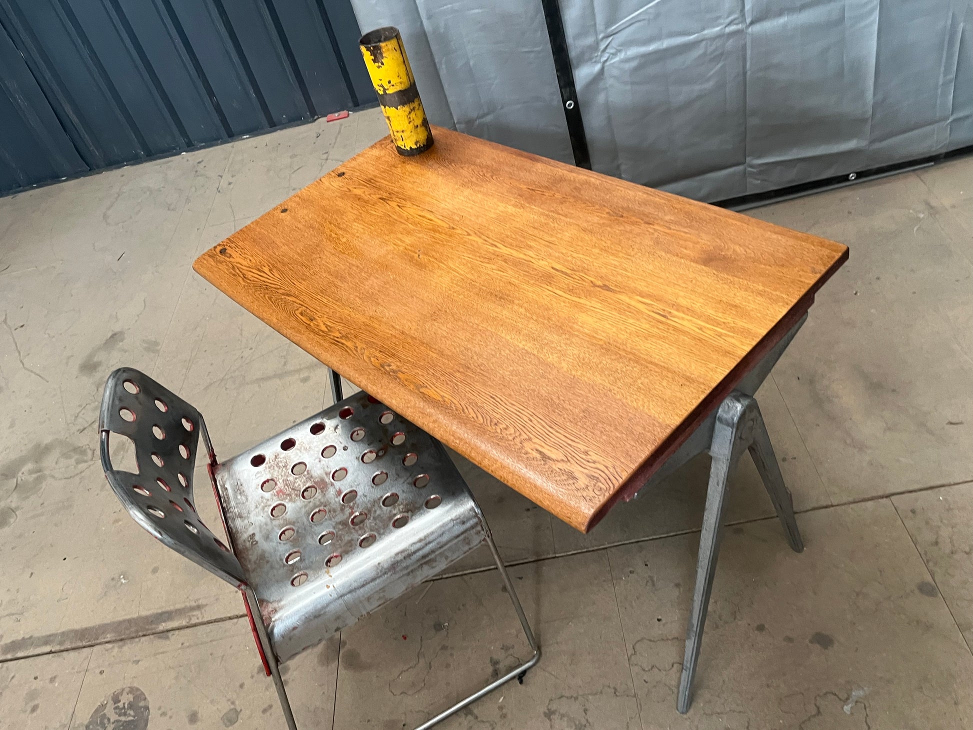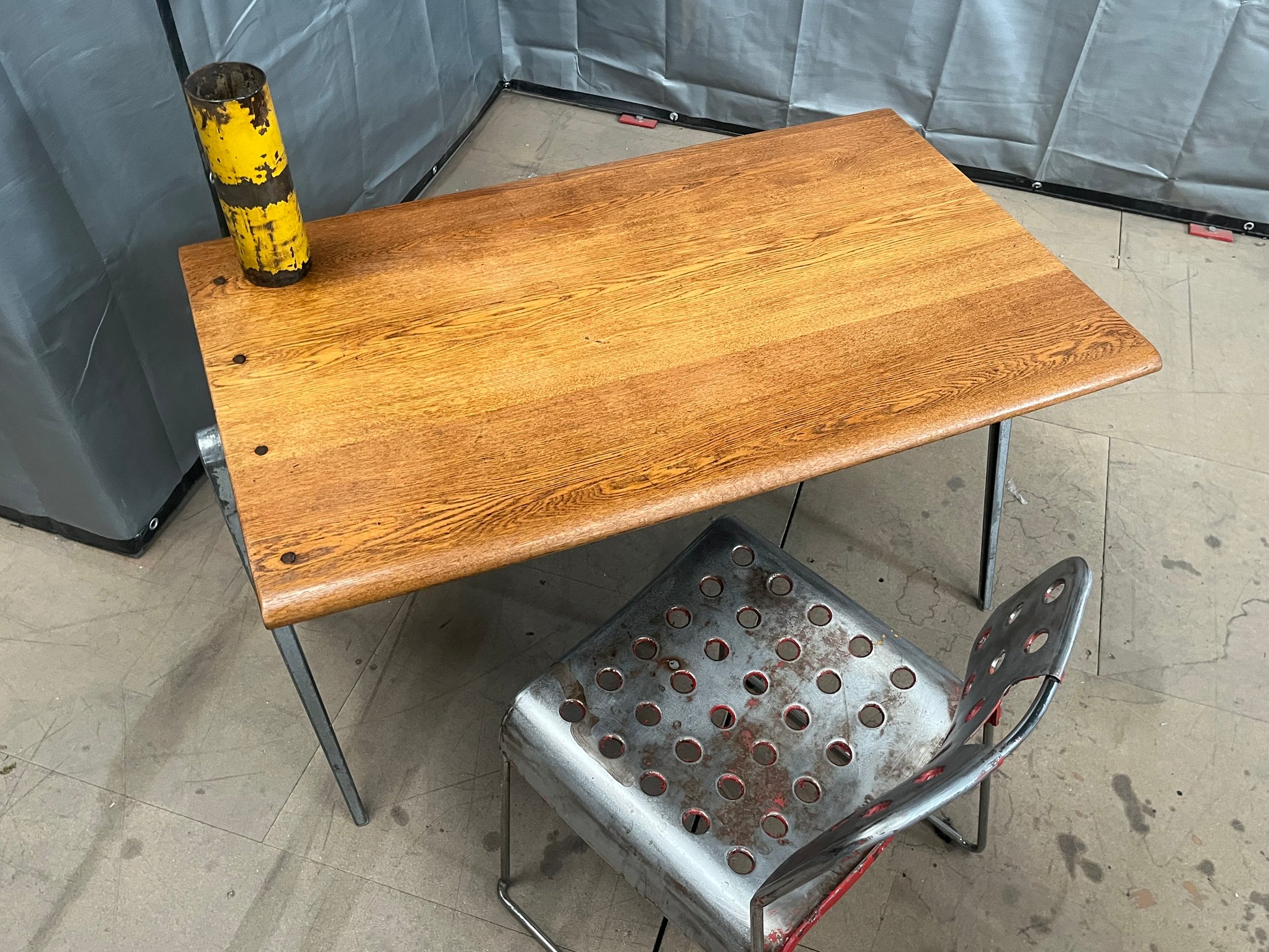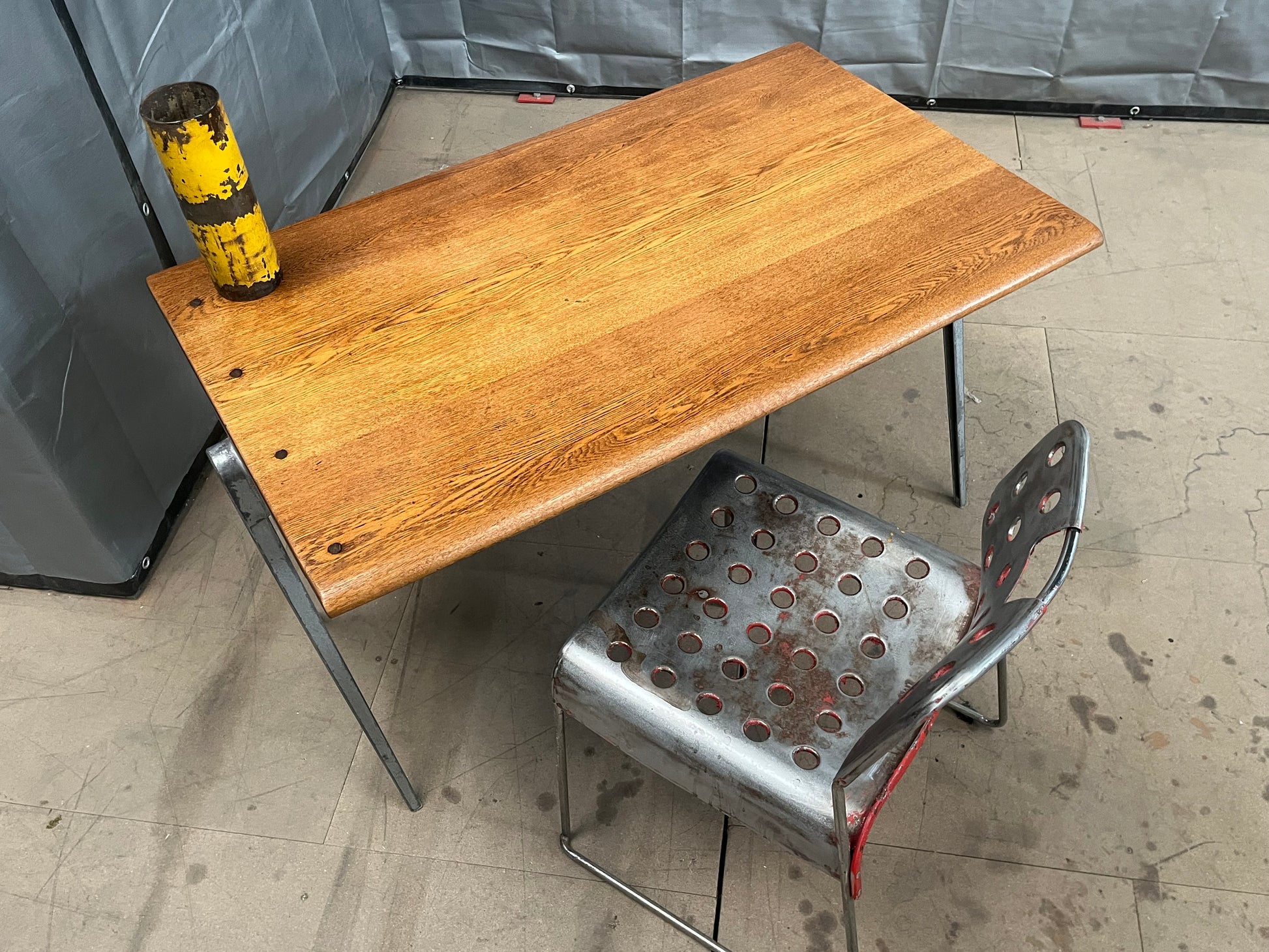 1950s James Leonard compass leg Desk with reclaimed elm top