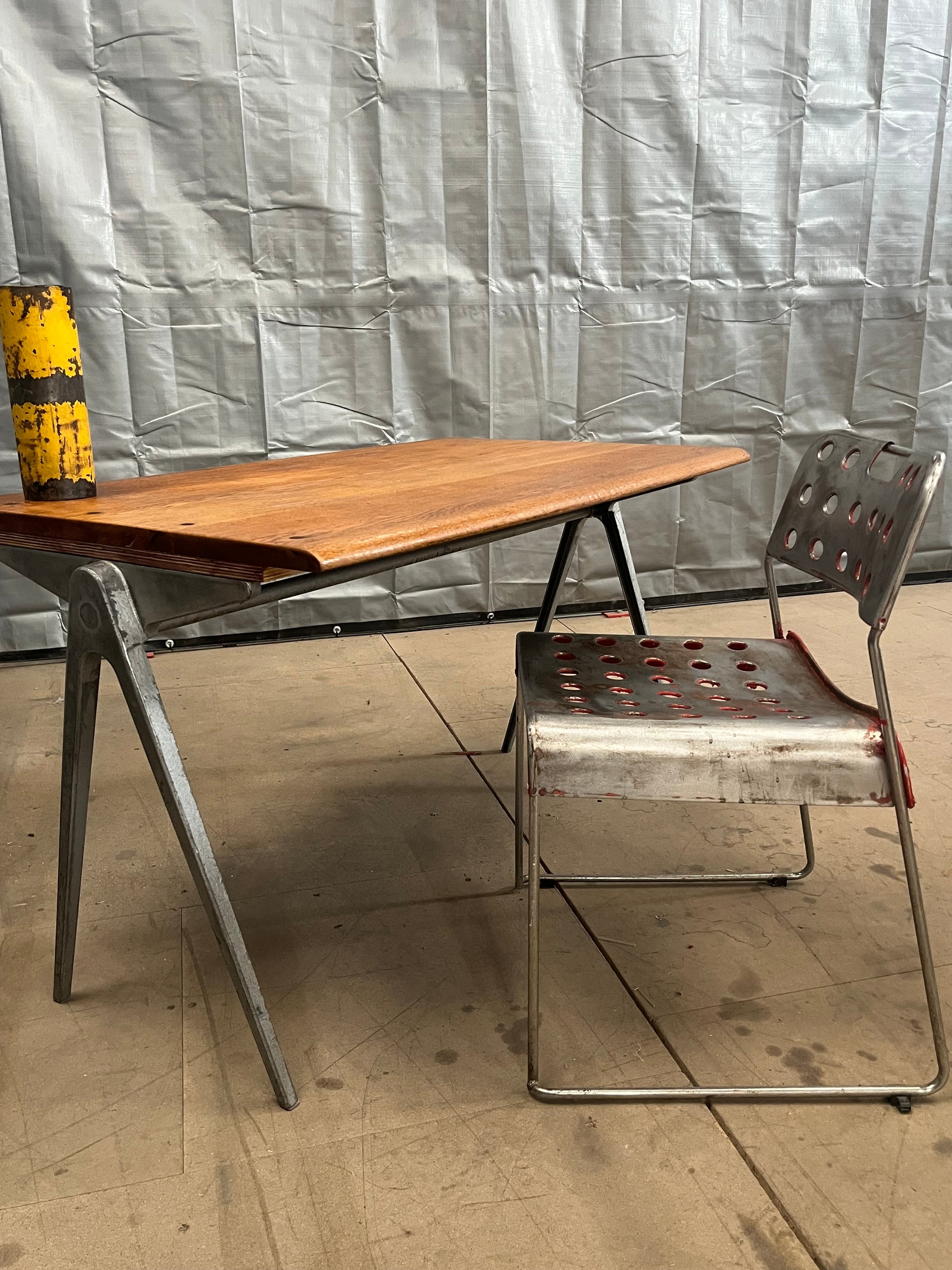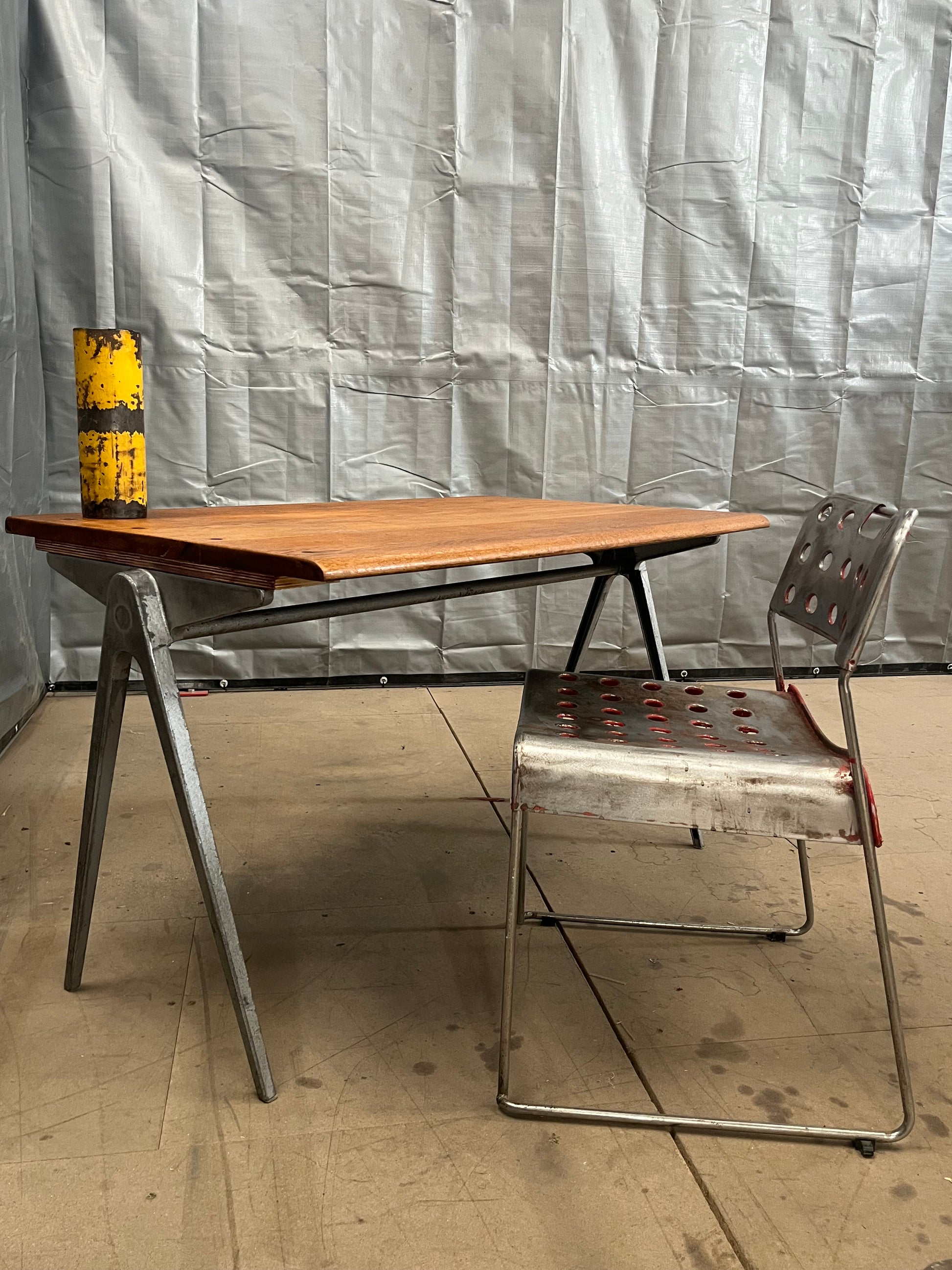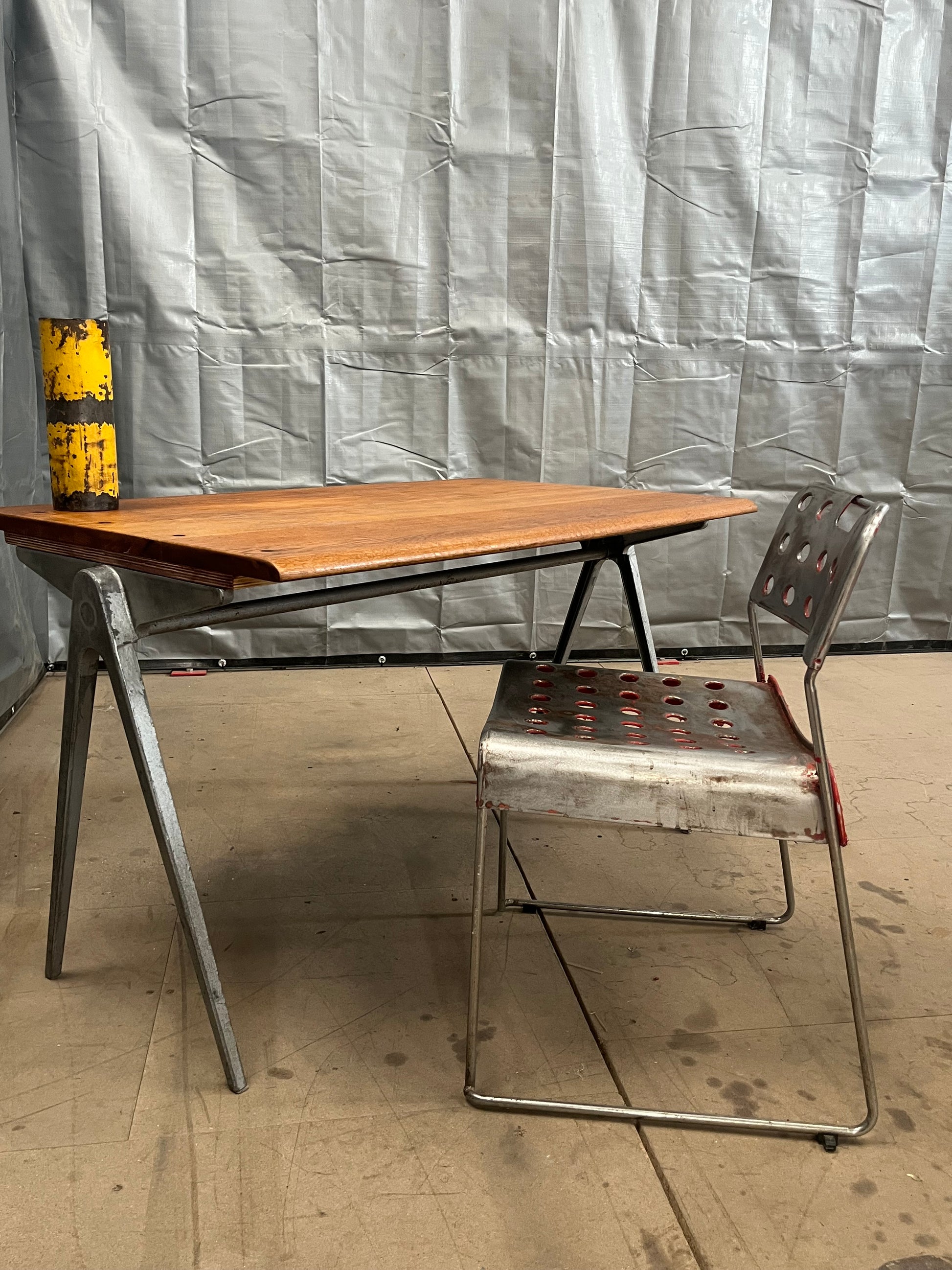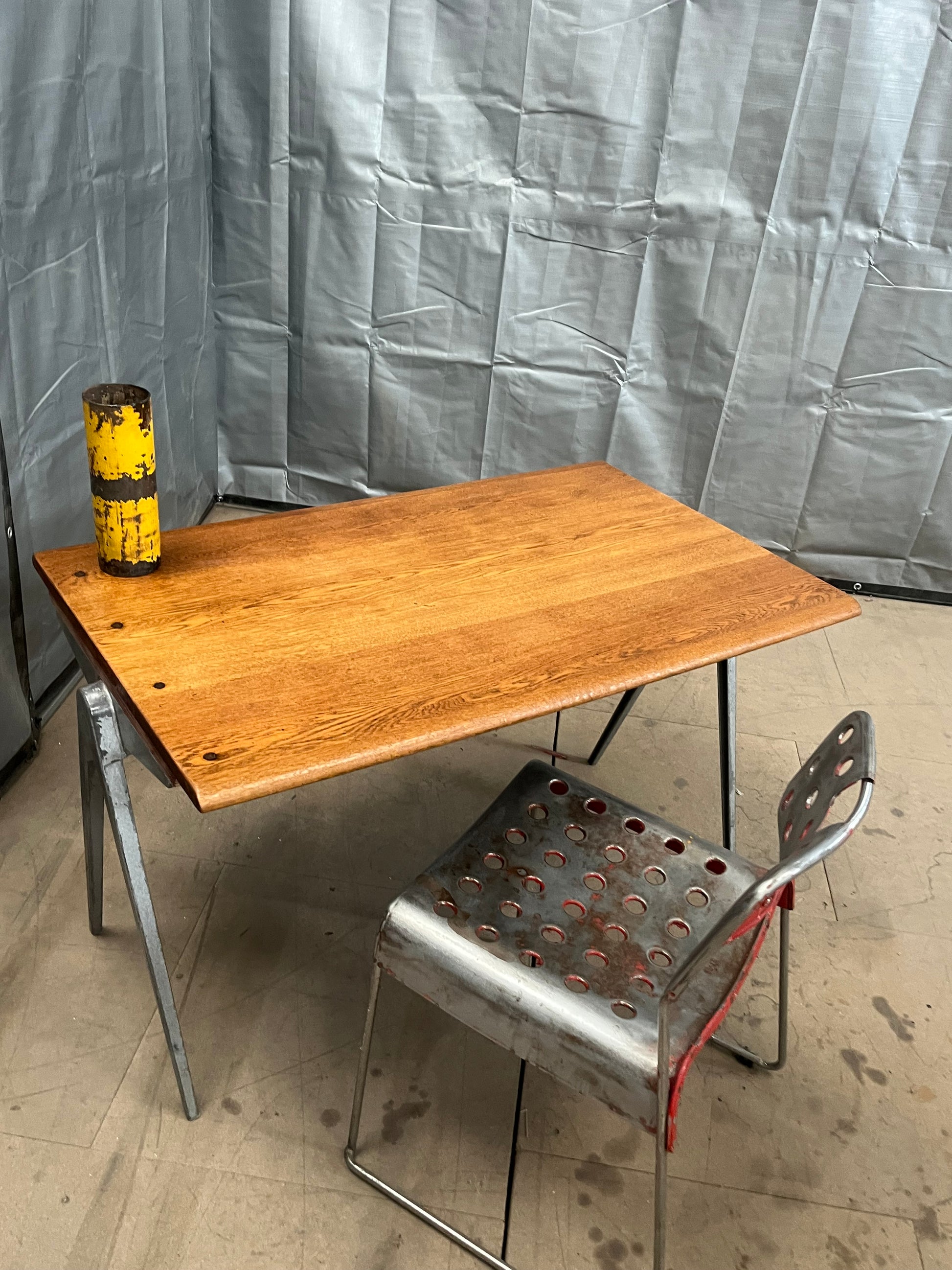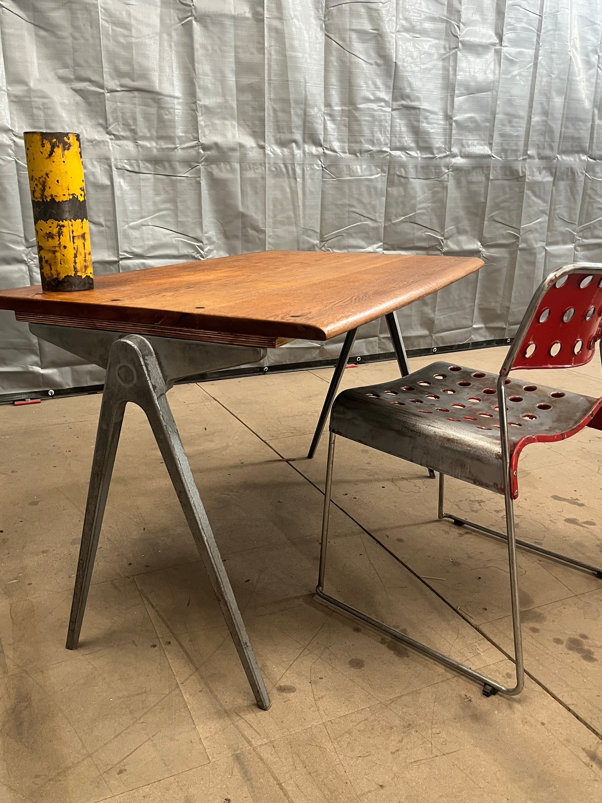 1950s James Leonard compass leg Desk with reclaimed elm top