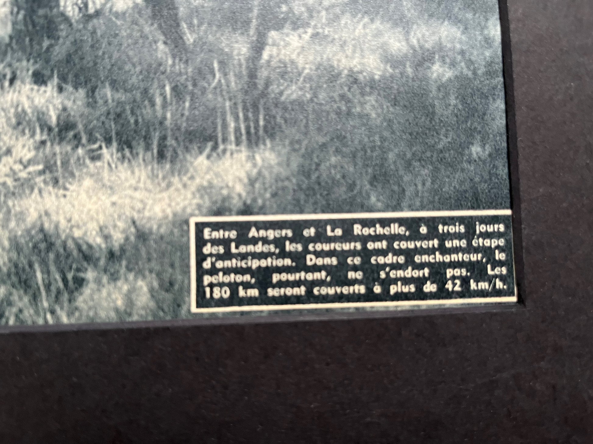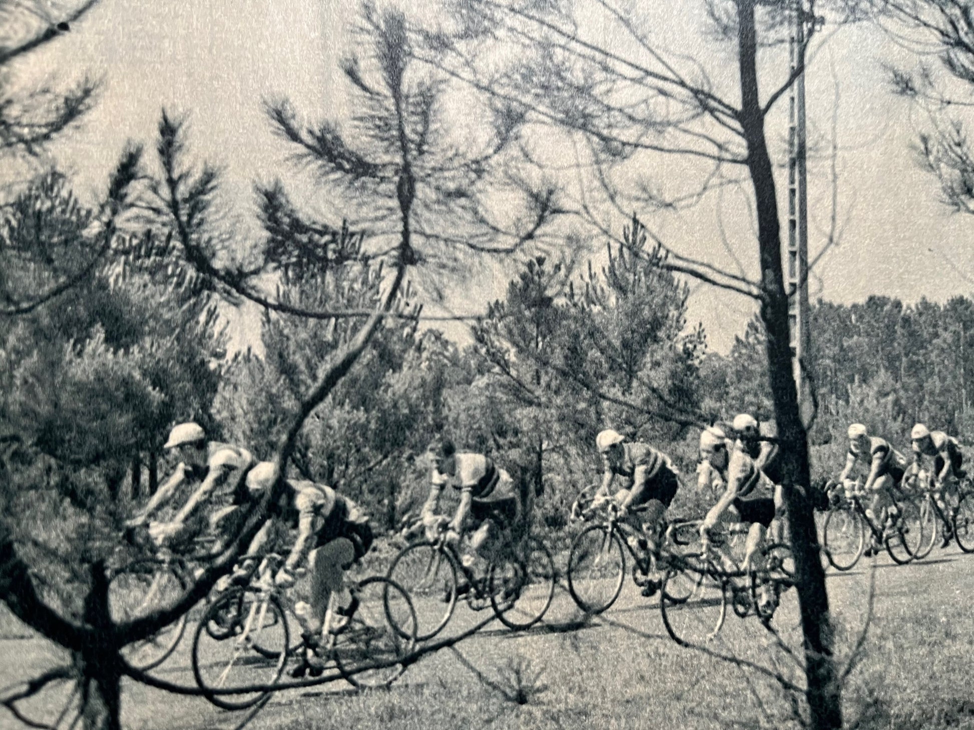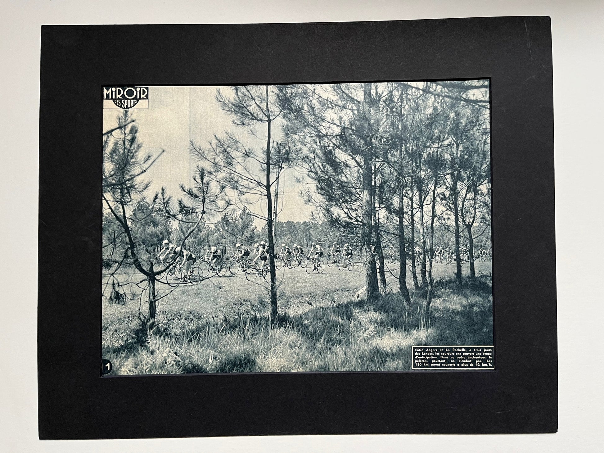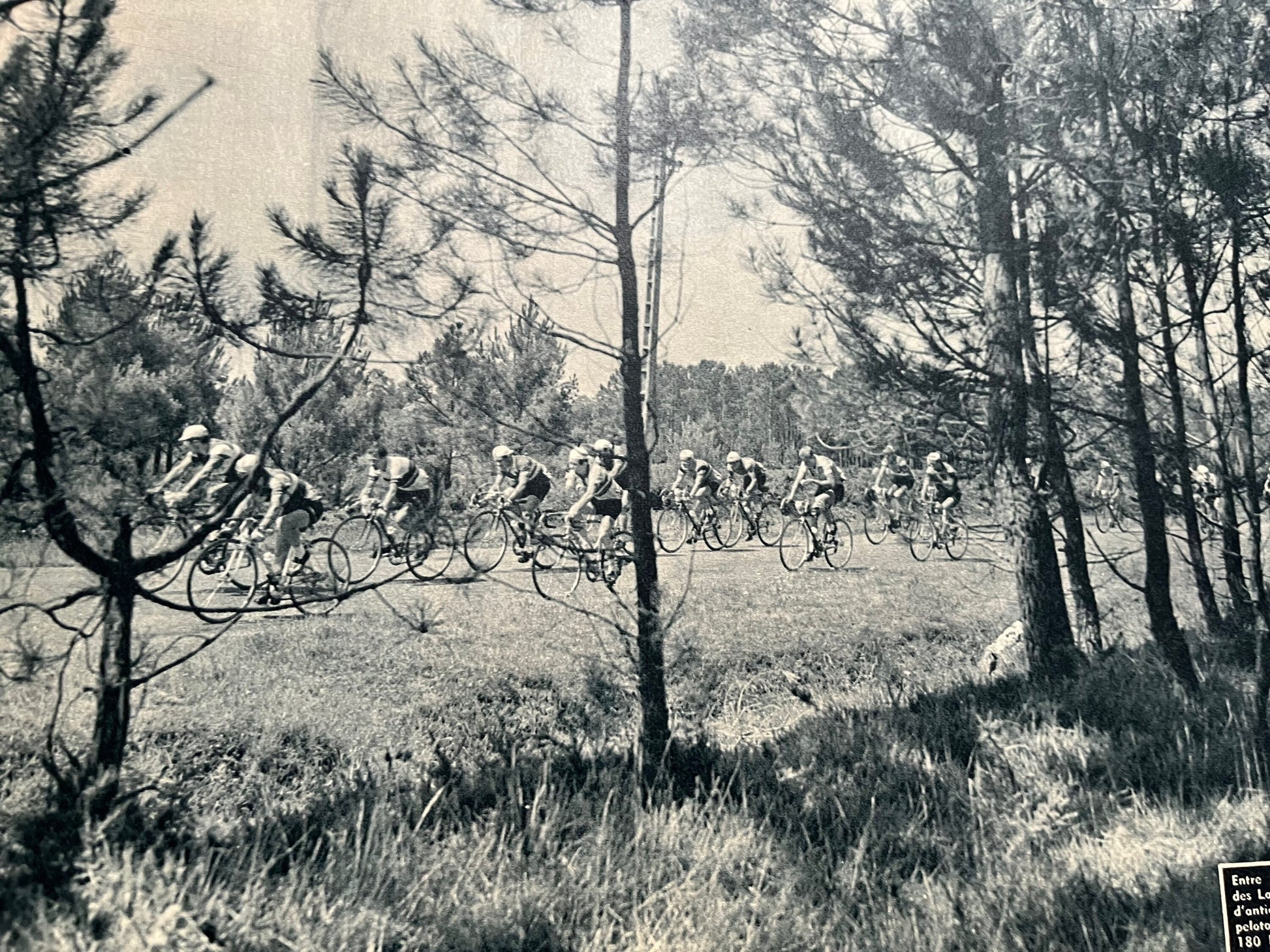 Iconic and very rare Original late 1950s French cycling magazine print showing riders in a forest in Angers / La Rochelle.