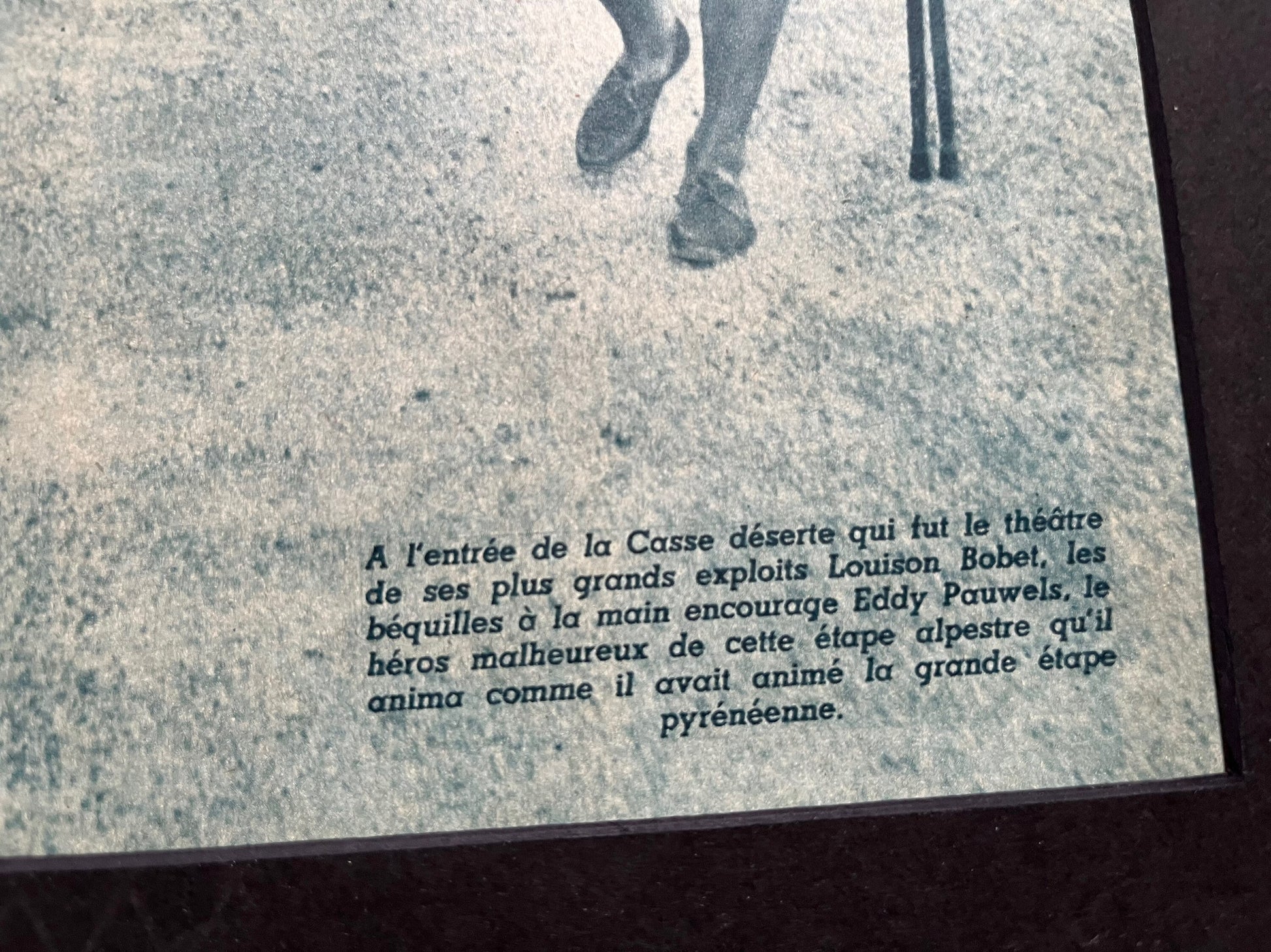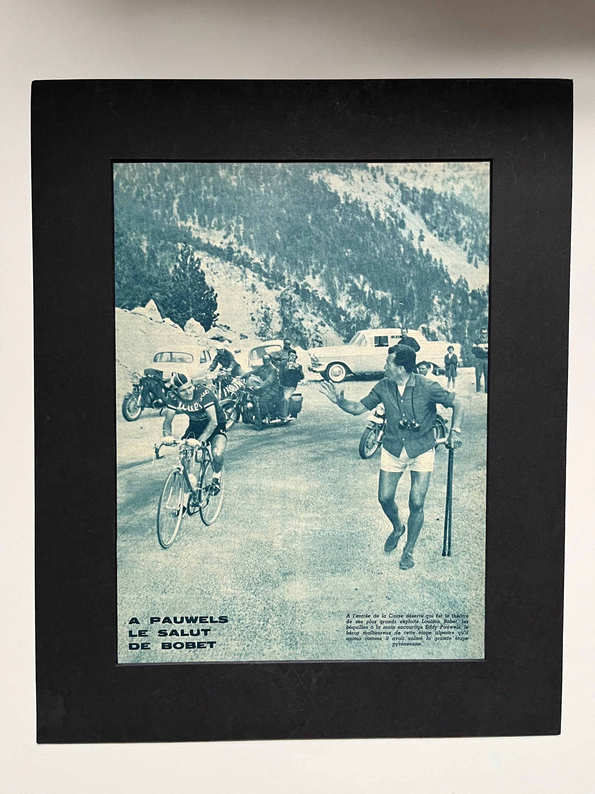 Iconic and very rare Original late 1950s French cycling magazine print showing Eddy Pauwells climbing with retired Louison Bobet giving him support. A stunning image..