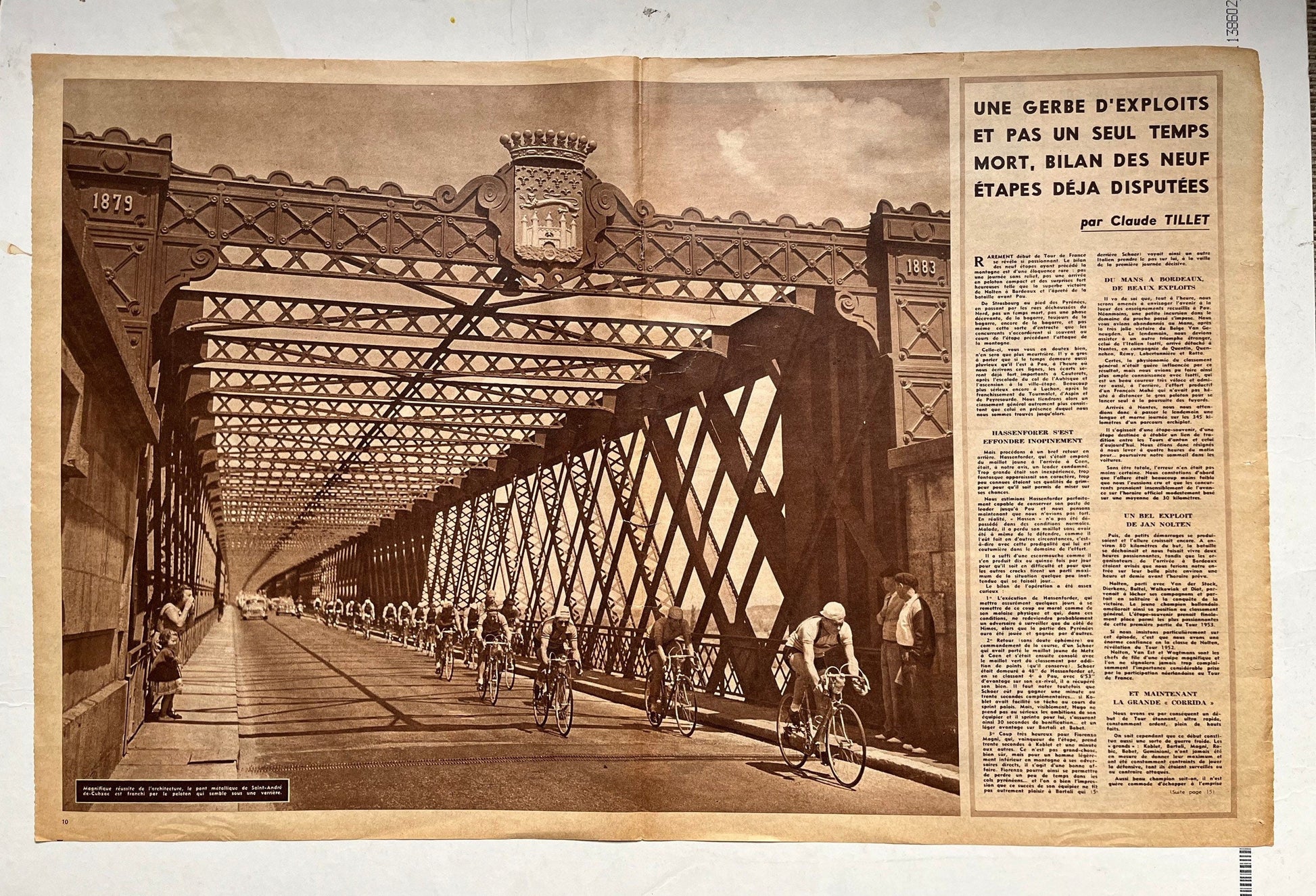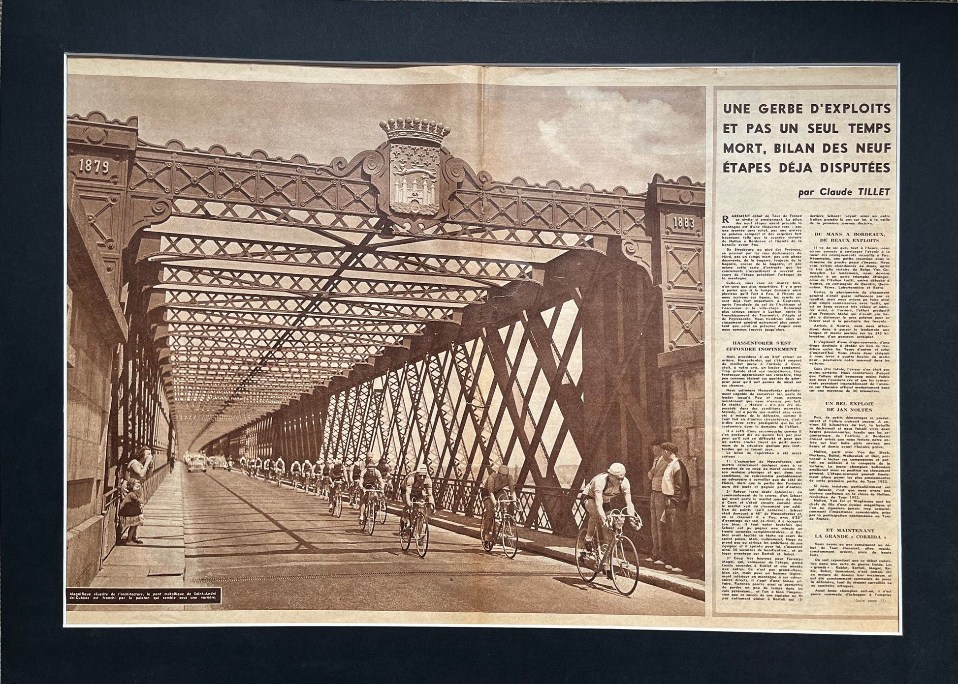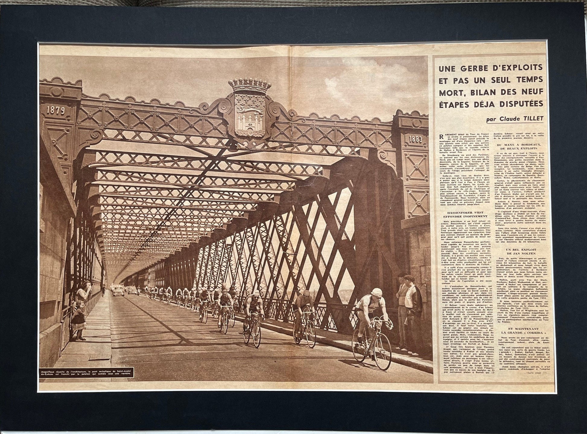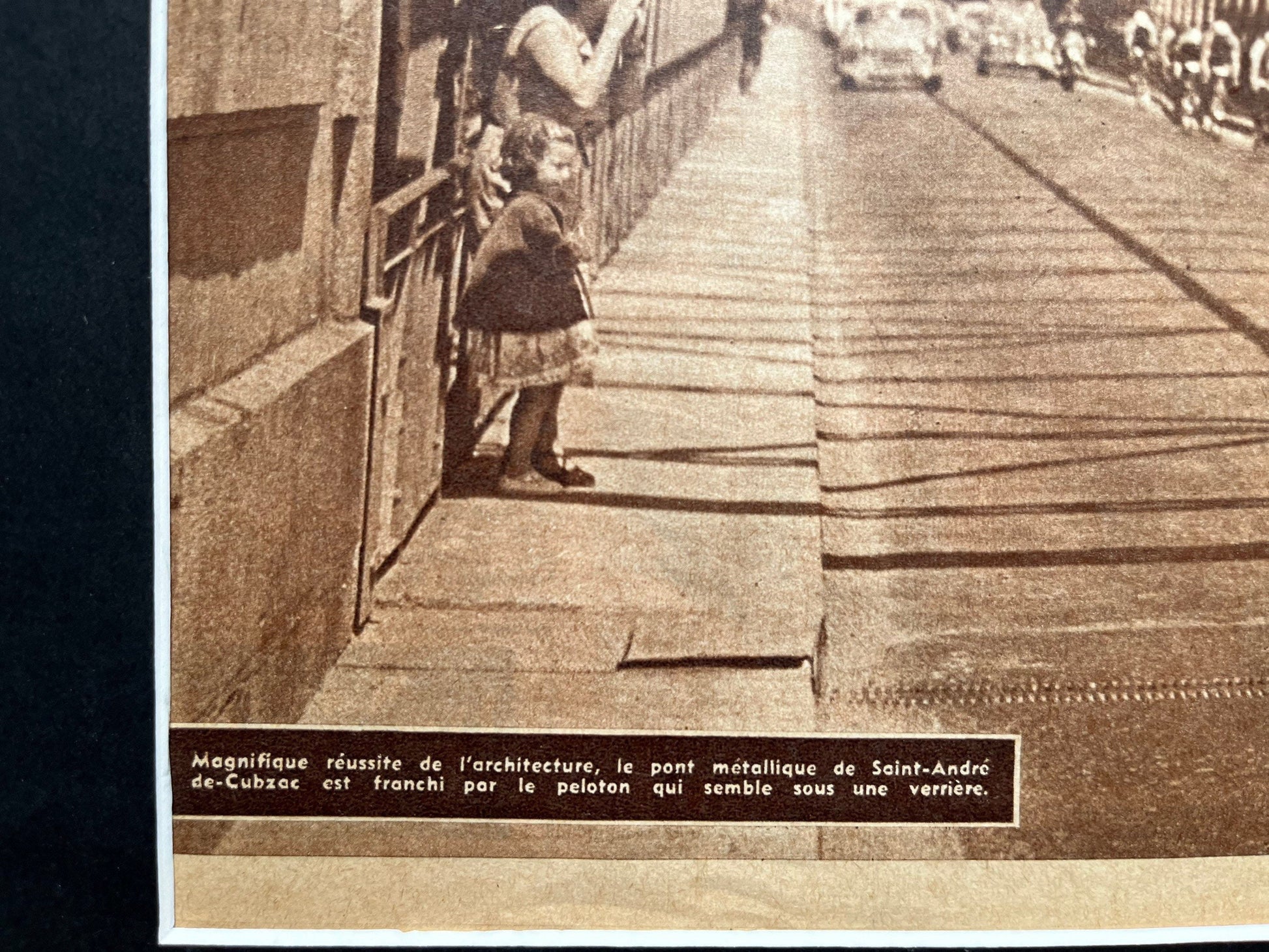 An awesome image! Very rare original c1950s french cycling magazine print of the Tour de France crossing the well known road bridge in Saint-André-de-Cubzac around 1959. Would look excellent mounted and framed.