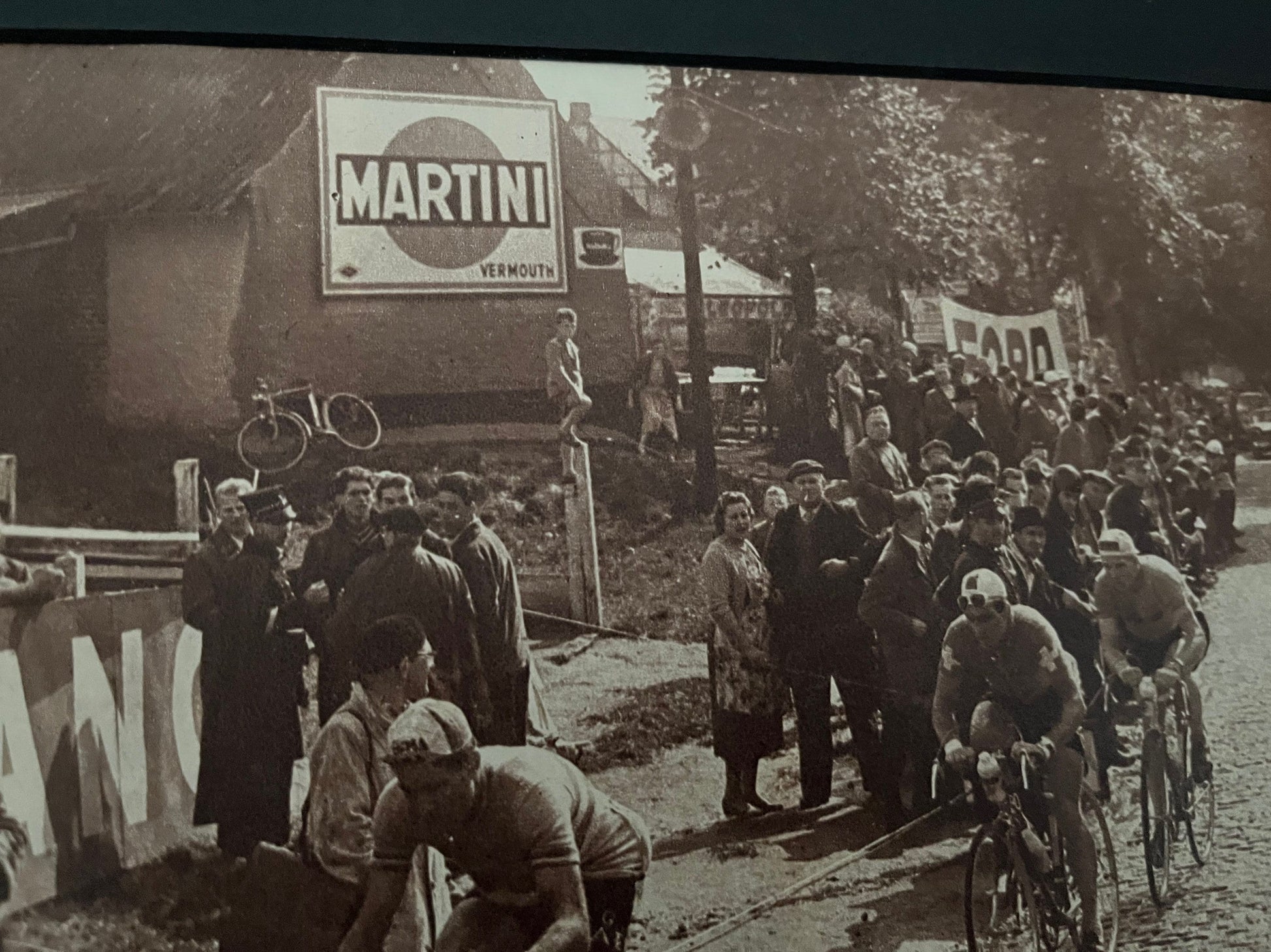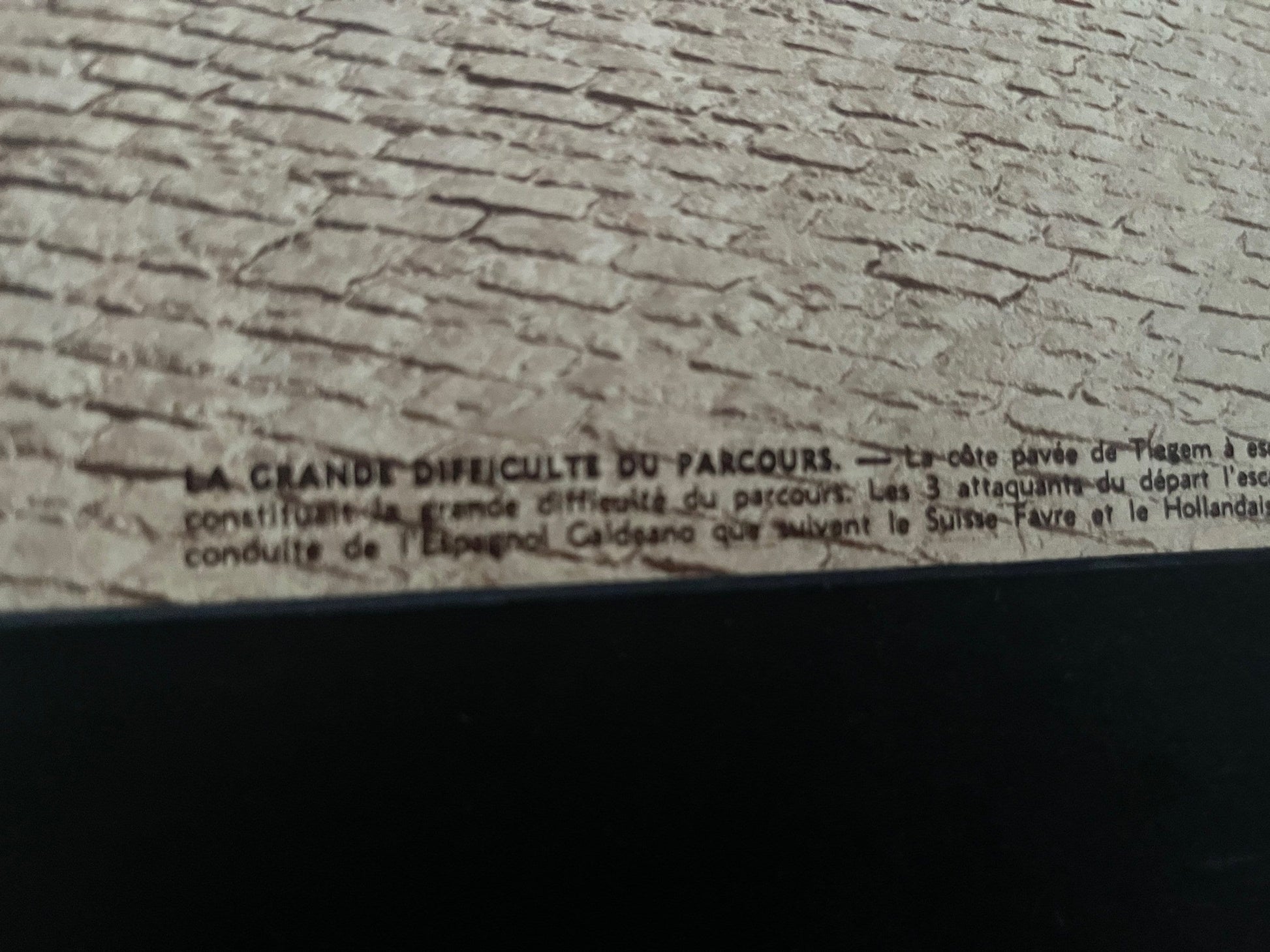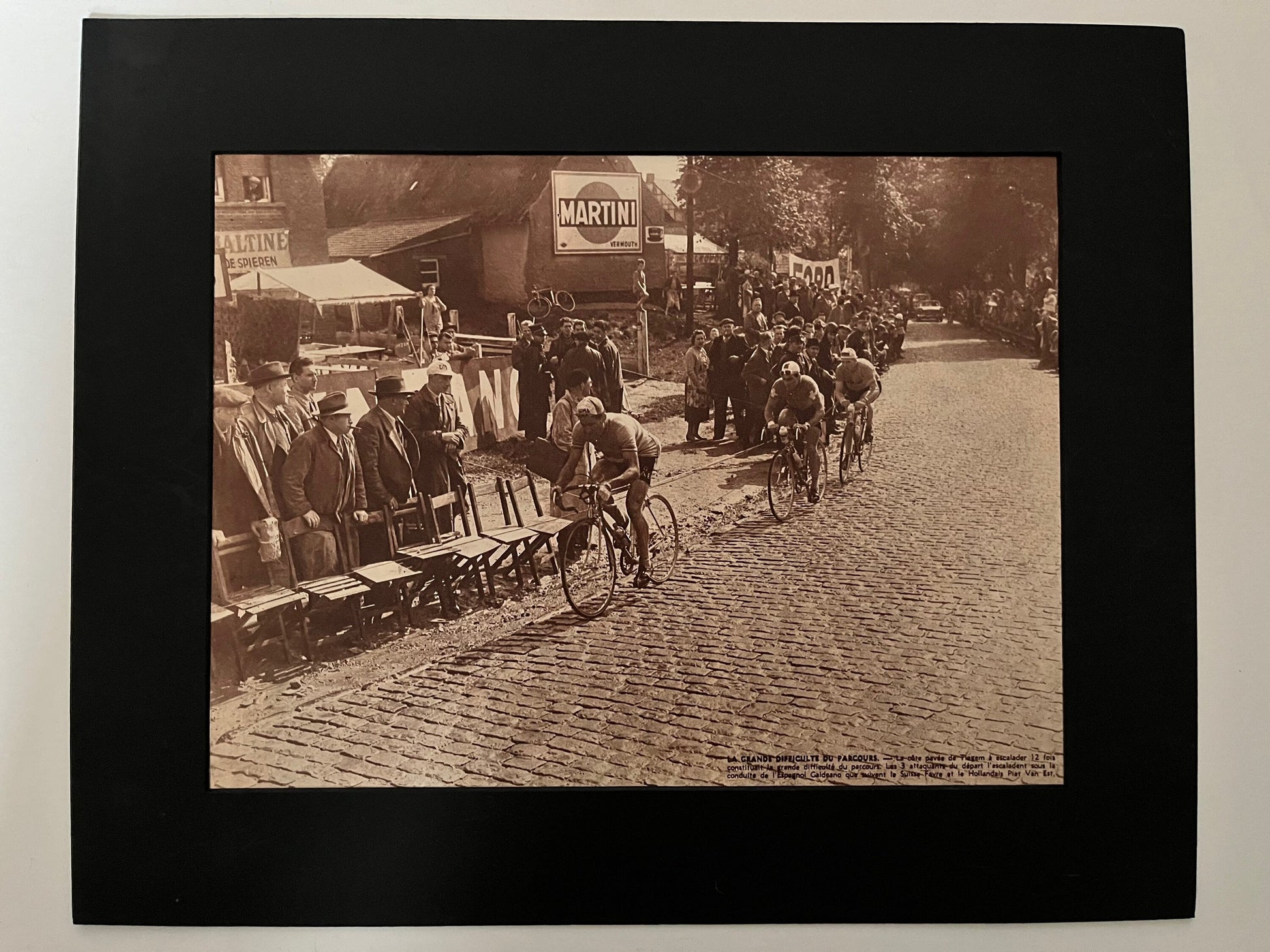 Iconic and very rare Original 1950s French cycling magazine print showing riders in a french street with Martini advertising in the background.