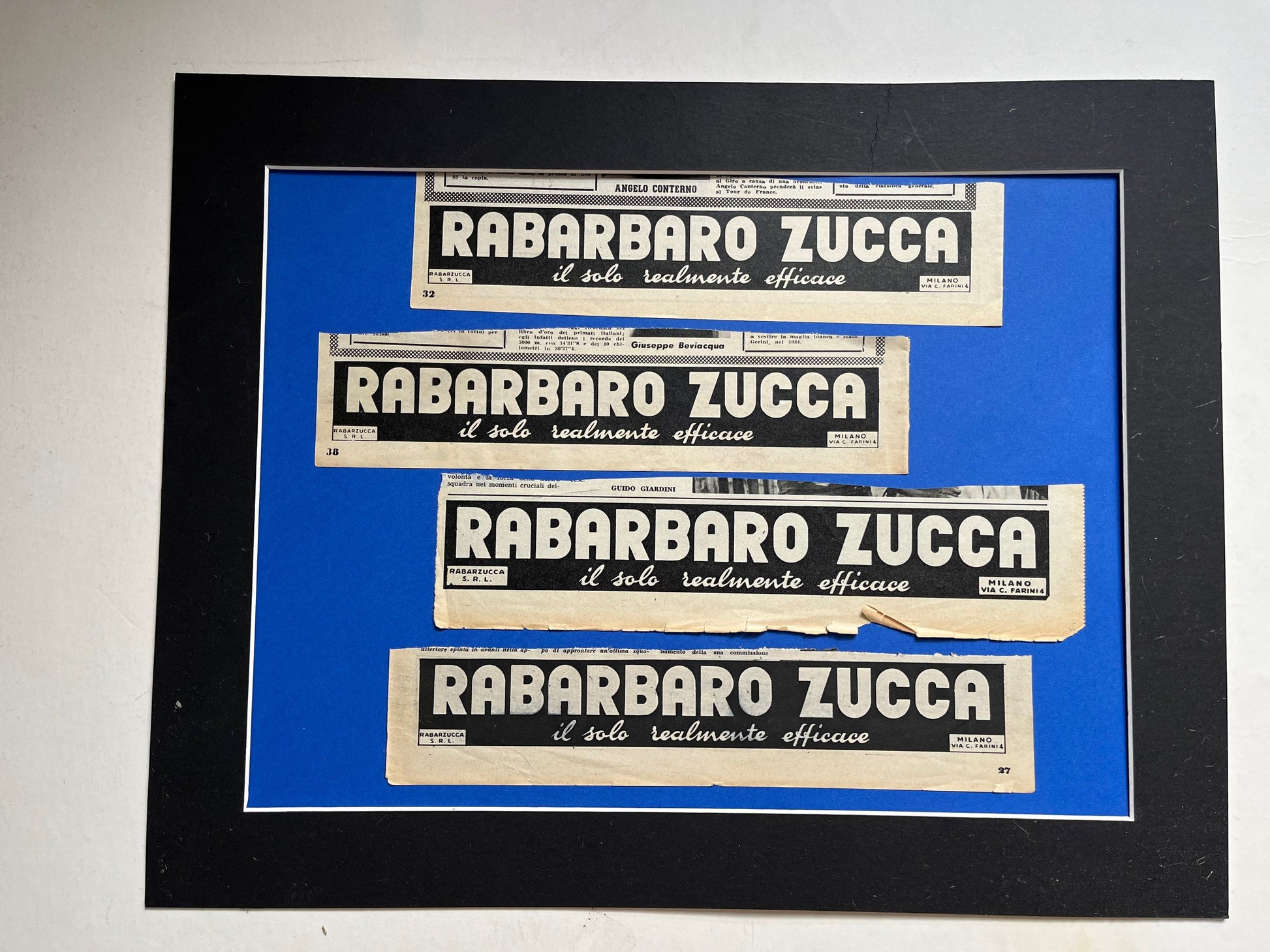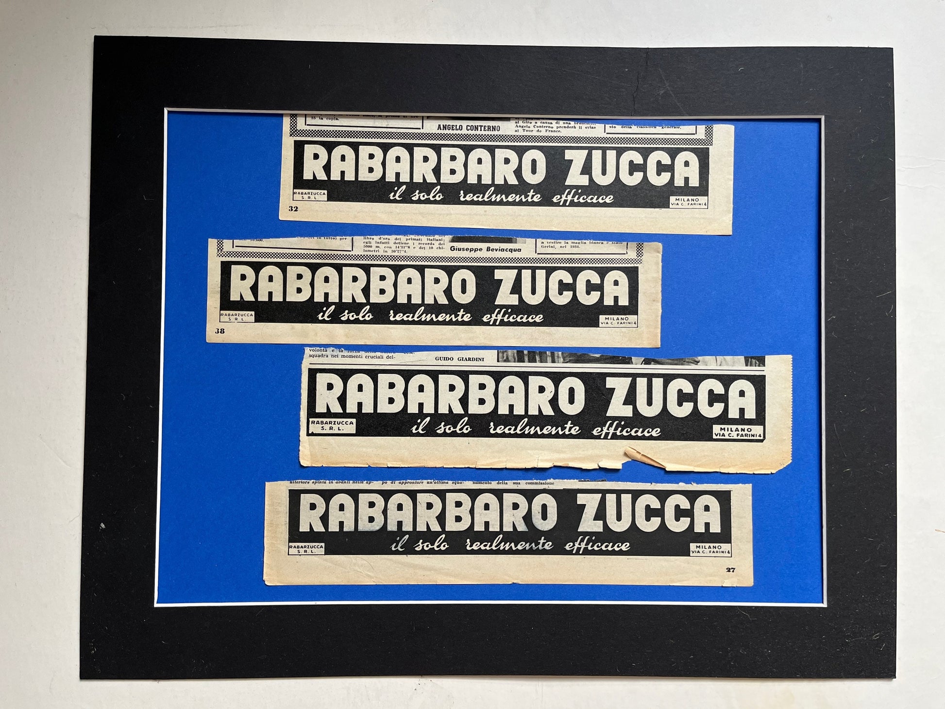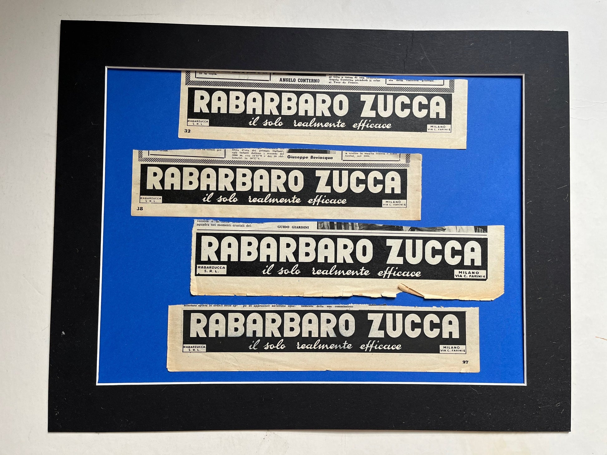 A great looking piece of artwork for the lounge or study. Four original 1950s Rabarbaro Zucca drinks advertisement logos cut and mounted onto blue card and ready for framing. This is an original print and not a scanned copy. A superb piece of artwork and an excellent gift Mount measures 44cm x 35.5cm Please check out our other listings, we have a wide selection of vintage prints.
