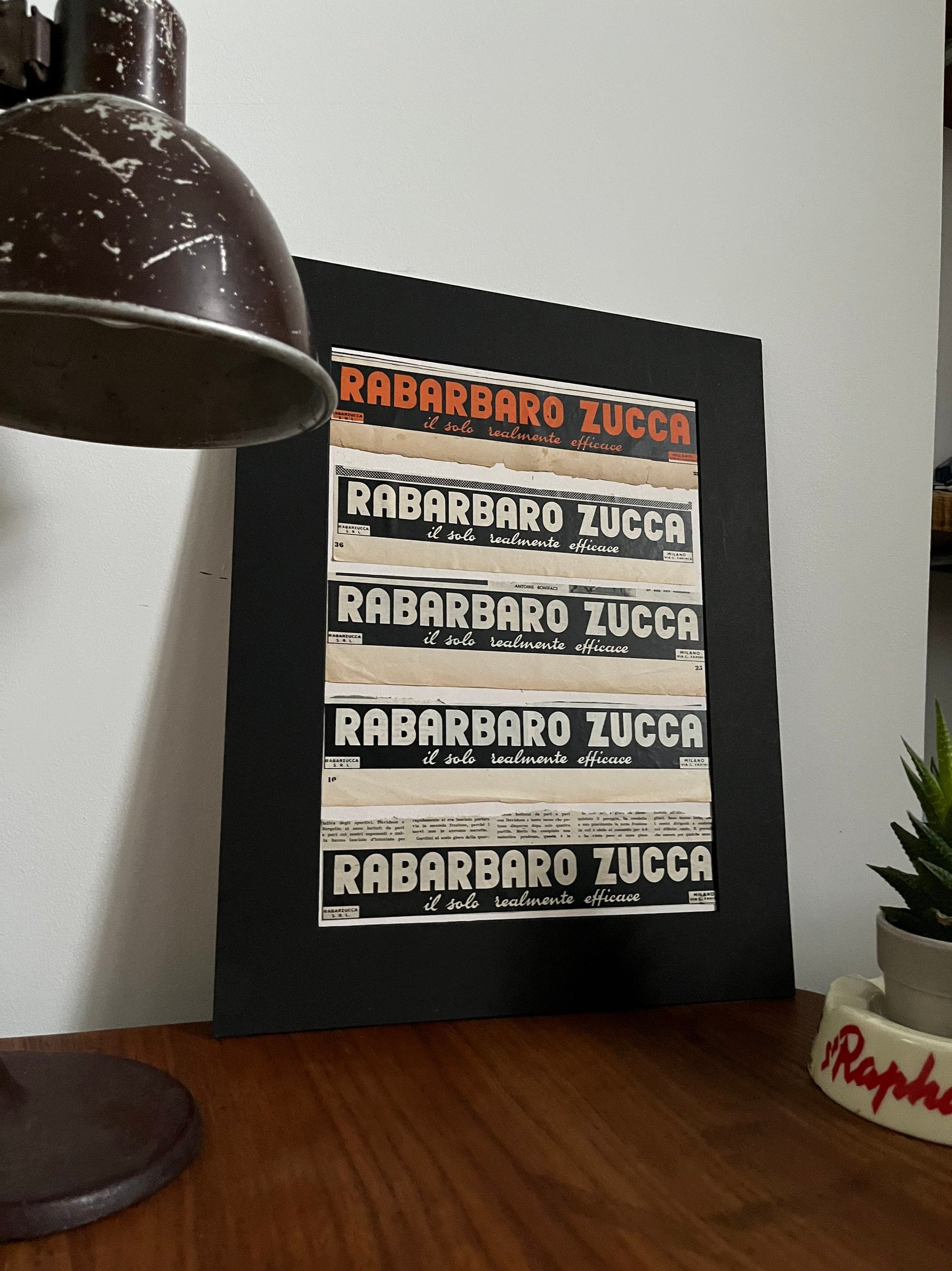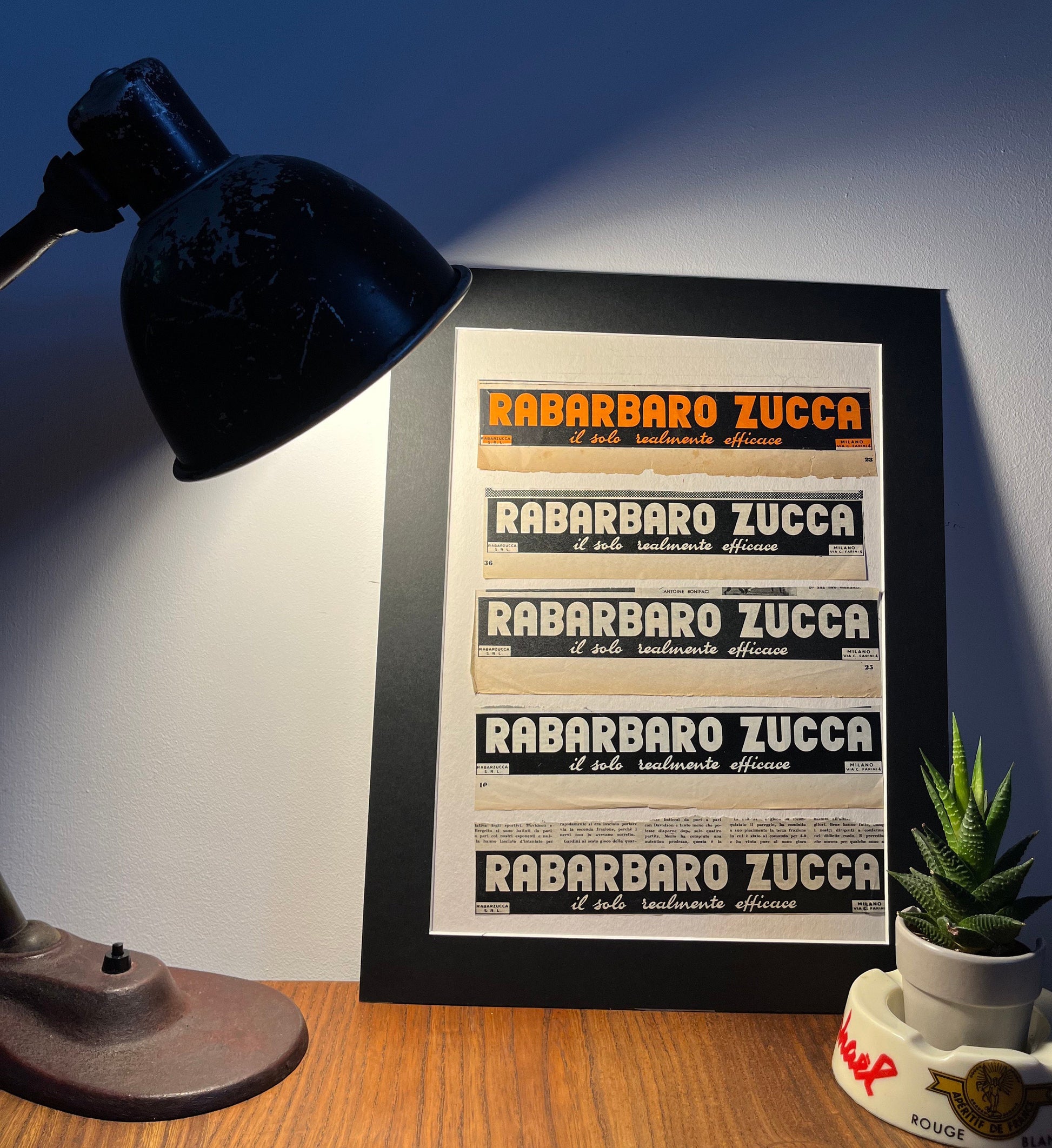 Five original 1950s Rabarbaro Zucca drinks advertisement logos cut and mounted onto cream card and ready for framing. This is an original print and not a scanned copy.. A superb piece of artwork and an excellent gift