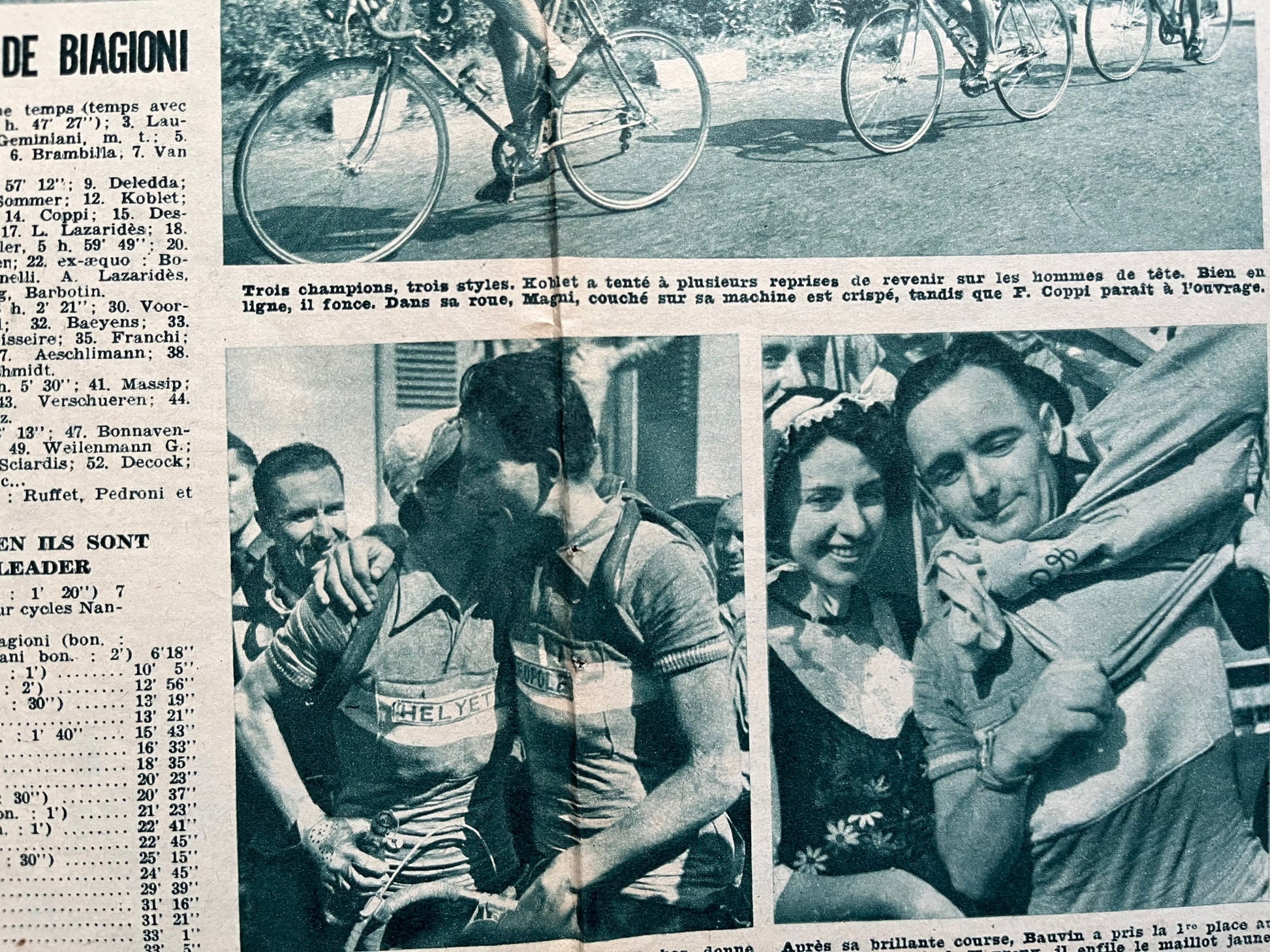 A complete one off print…. Iconic and very rare Original 1952 cycling magazine print featuring cycling legend Fausto Coppi in Bianchi team kit riding in the Tour de France that year, which he eventually won.