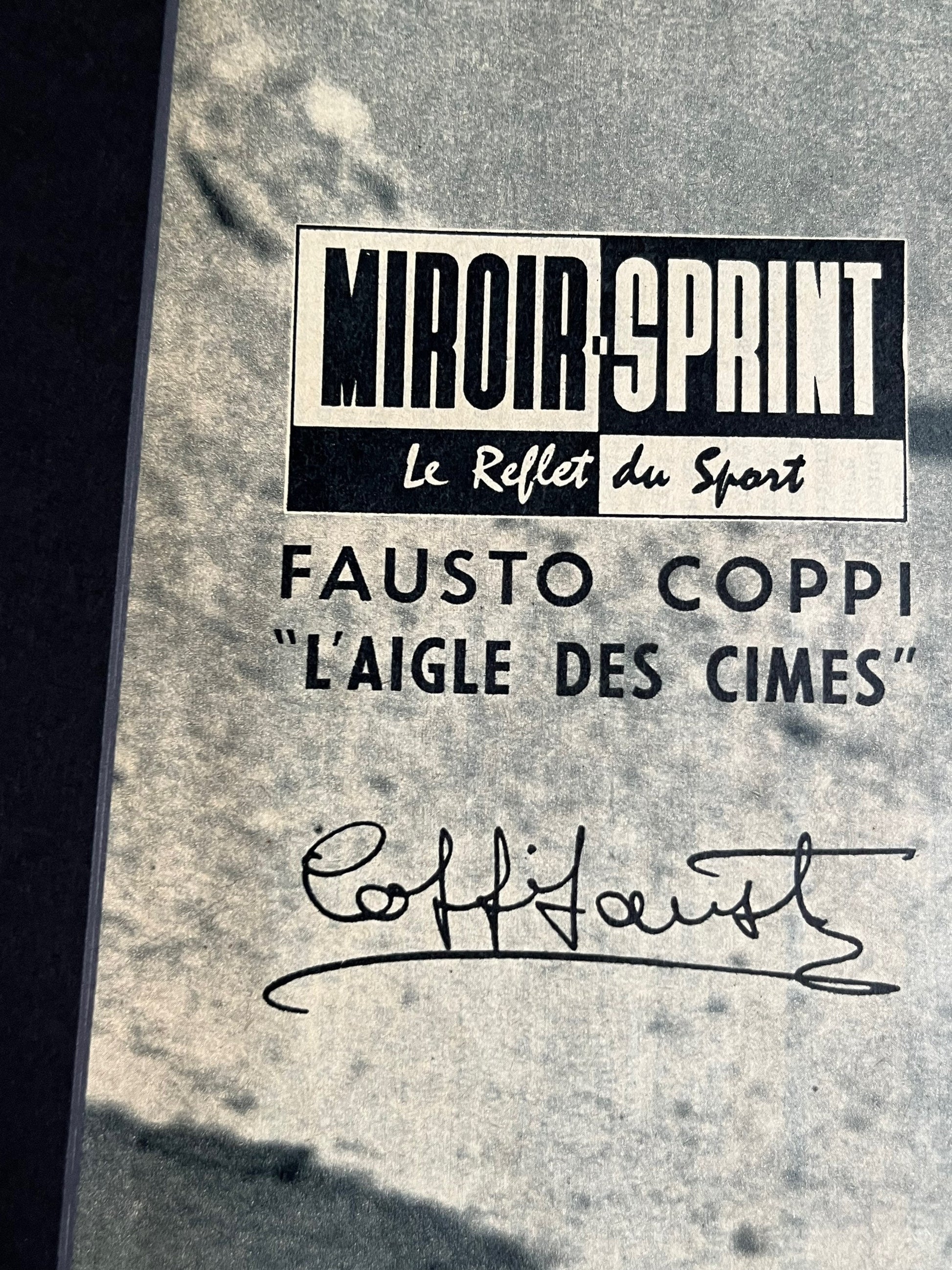 Iconic and very rare Original 1953 cycling magazine cover featuring cycling legend Fausto Coppi in Bianchi team kit in the Tour de France that year. Has a print if Coppi’s signature.