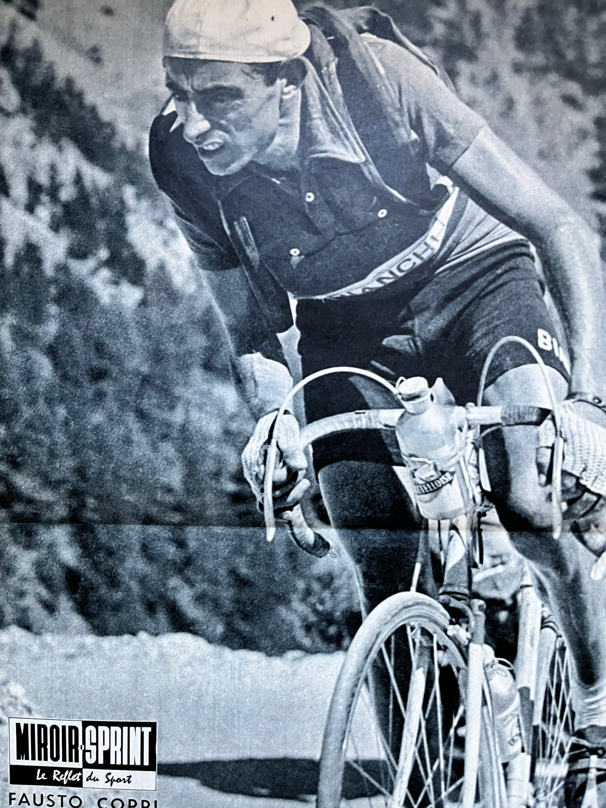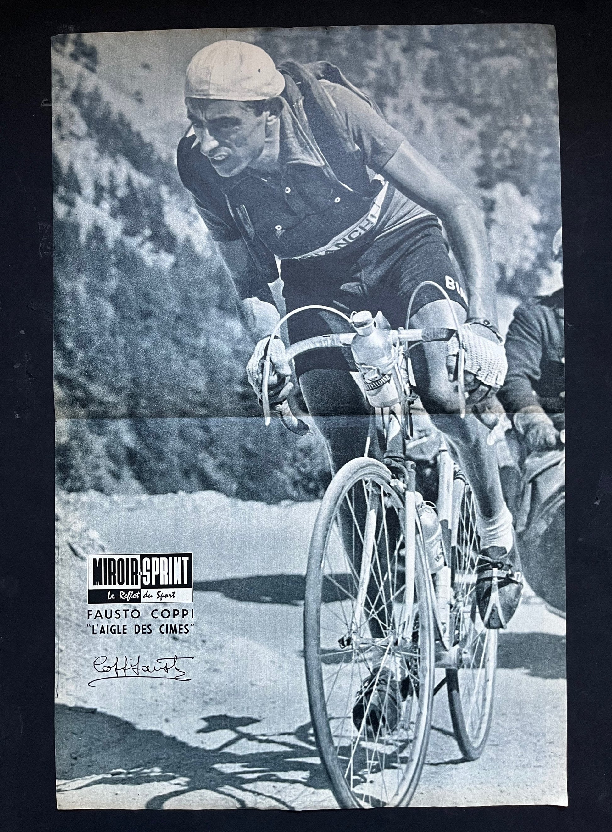 Iconic and very rare Original 1953 cycling magazine cover featuring cycling legend Fausto Coppi in Bianchi team kit in the Tour de France that year. Has a print if Coppi’s signature.