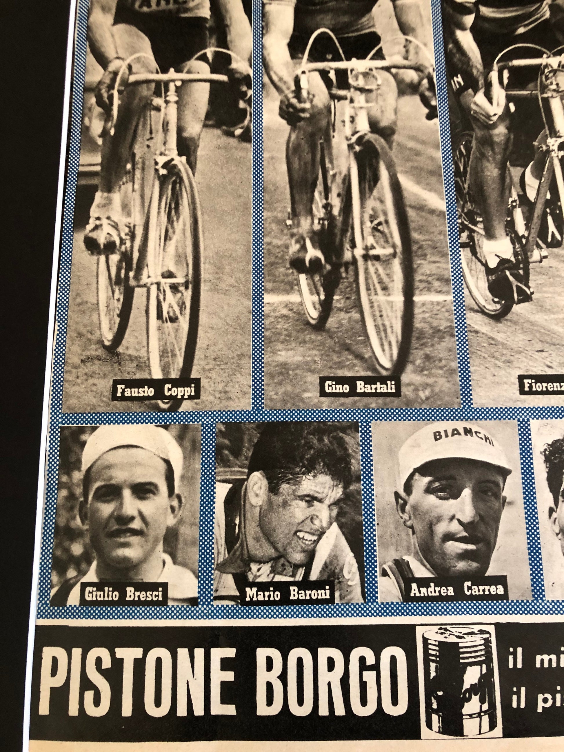 Very rare Original card mounted 1953 Italian cycling magazine cover featuring cycling legends and rivals Gino Bartali and Fausto Coppi. Would look excellent framed.