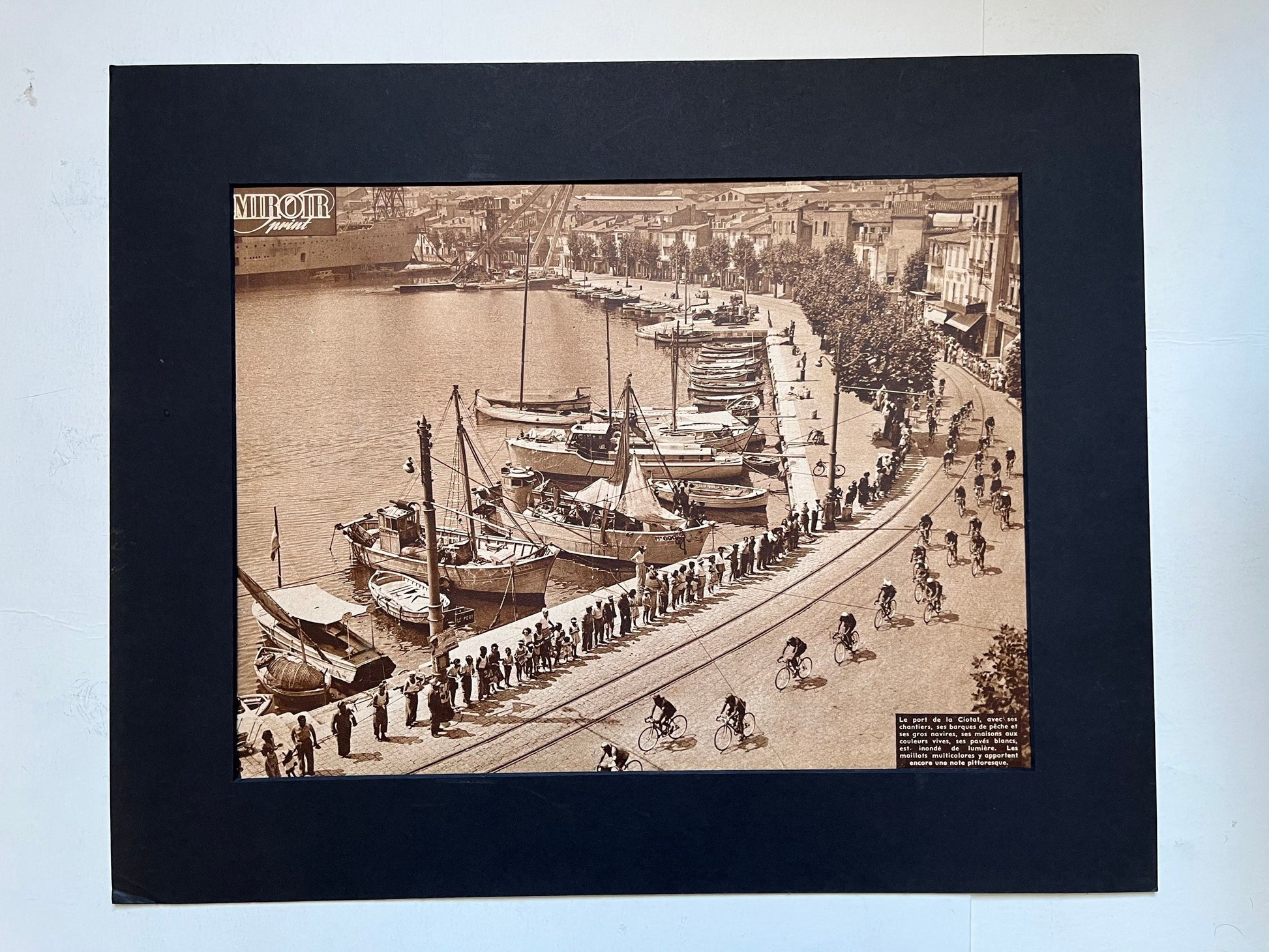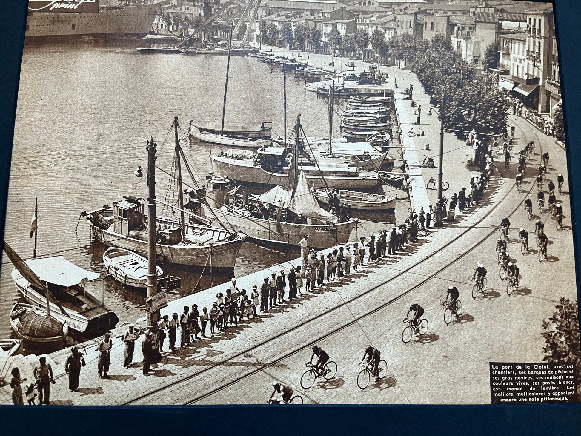 An awesome image! Very rare original french cycling magazine print of the Tour de France peloton passing through the Port de La Ciotat in Provence. Would look excellent framed.