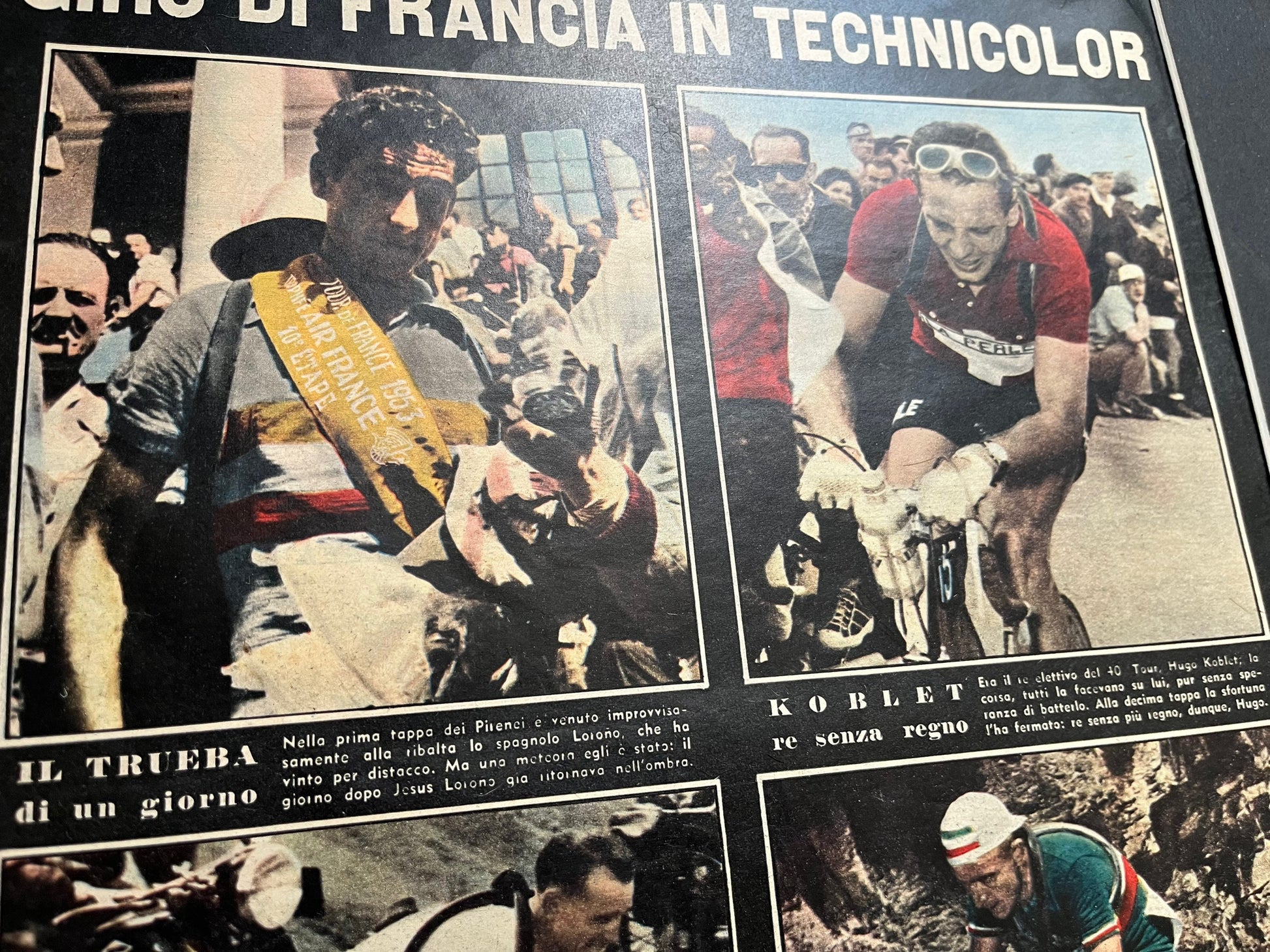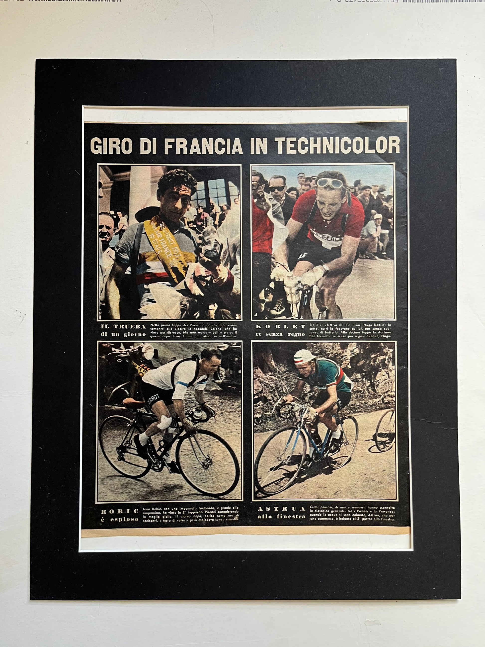 Very rare Original 1953 Italian cycling magazine print featuring four riders in the Giro di Francia / Tour de France.. A great piece of design, and would look great any room.