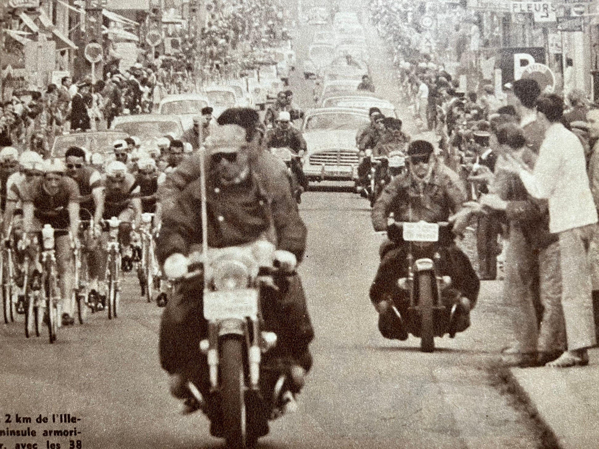 Iconic and very rare Original 1960 French cycling magazine print showing the Peloton entering the Porte de Bretagne.