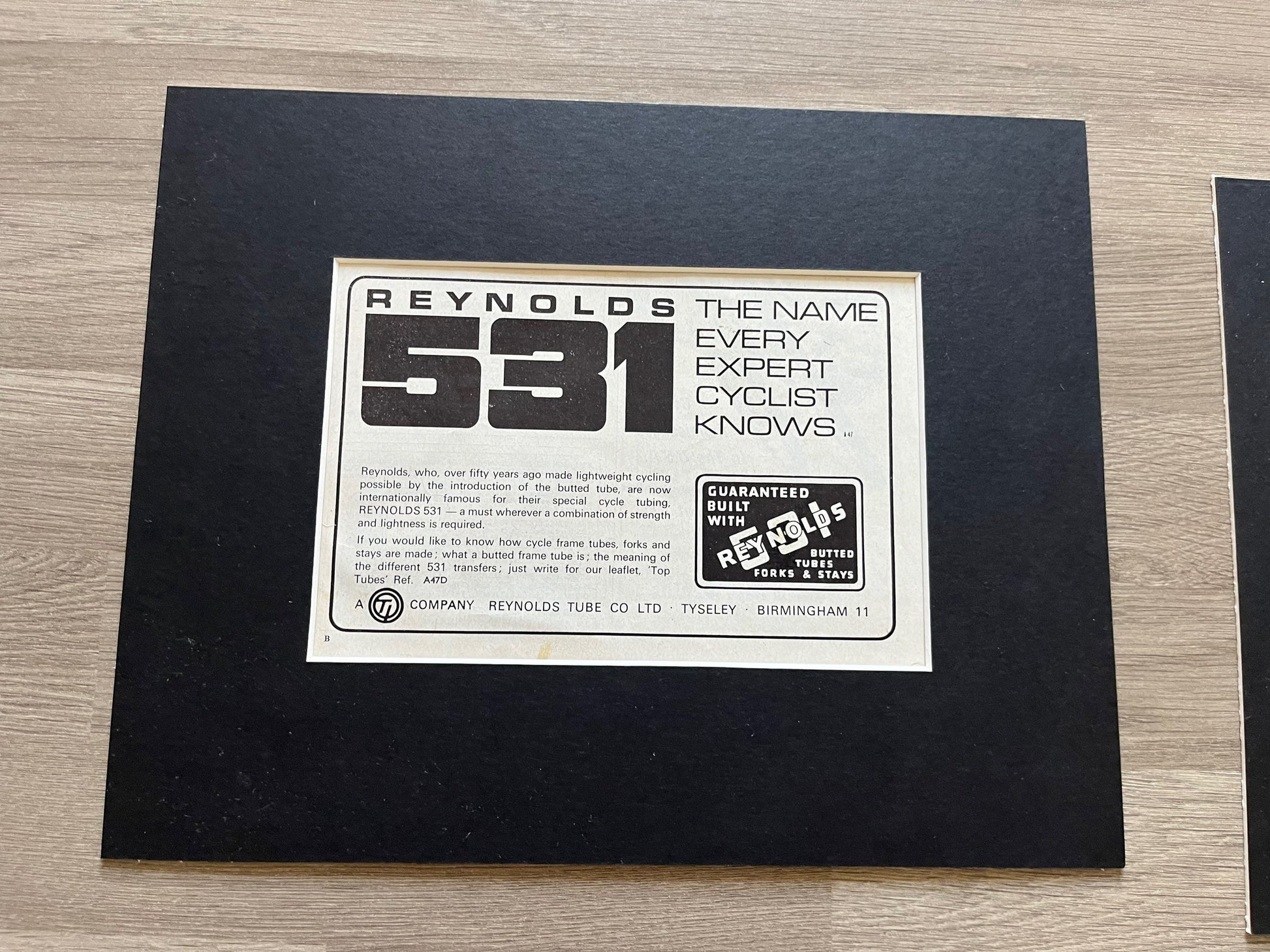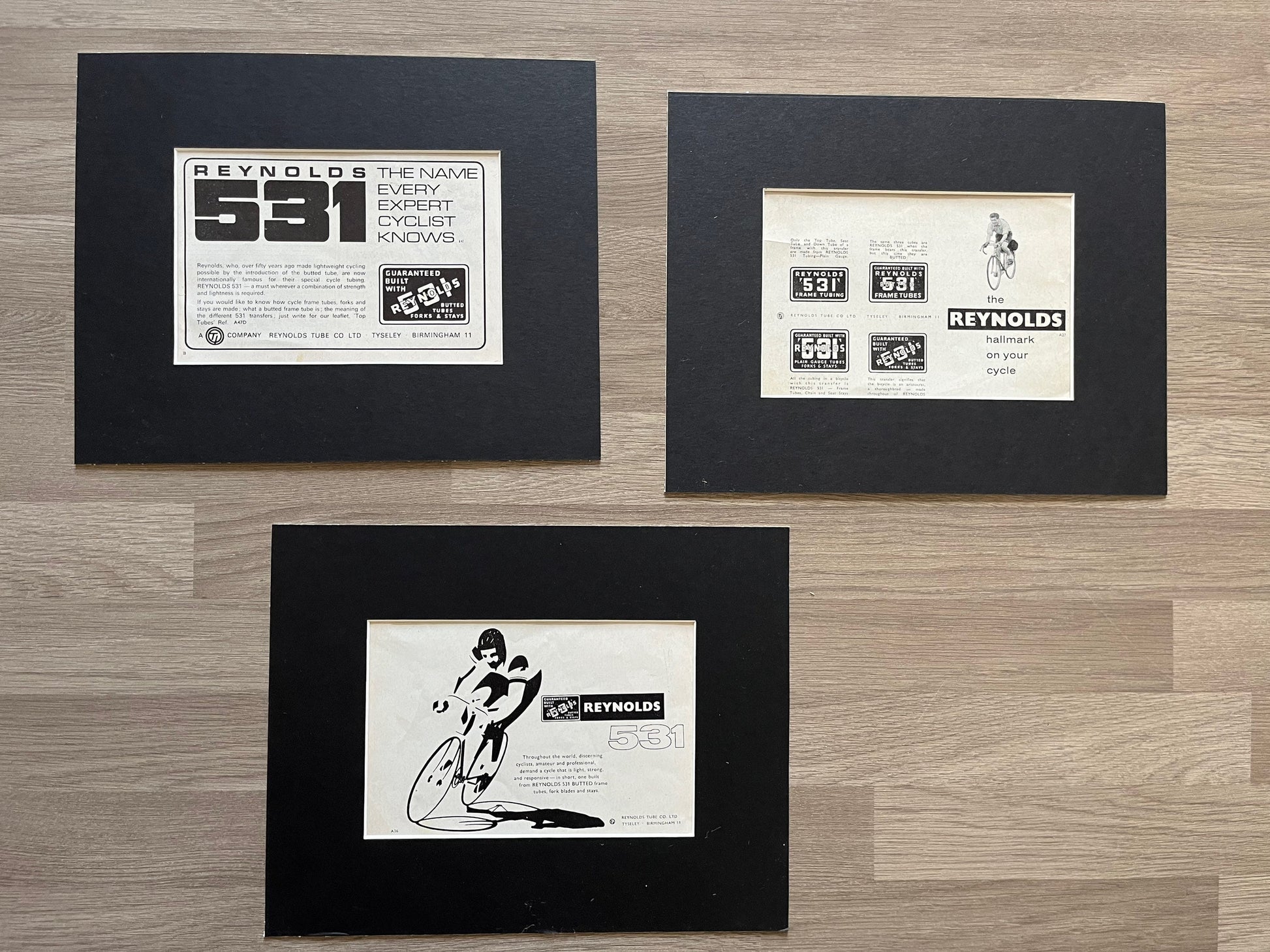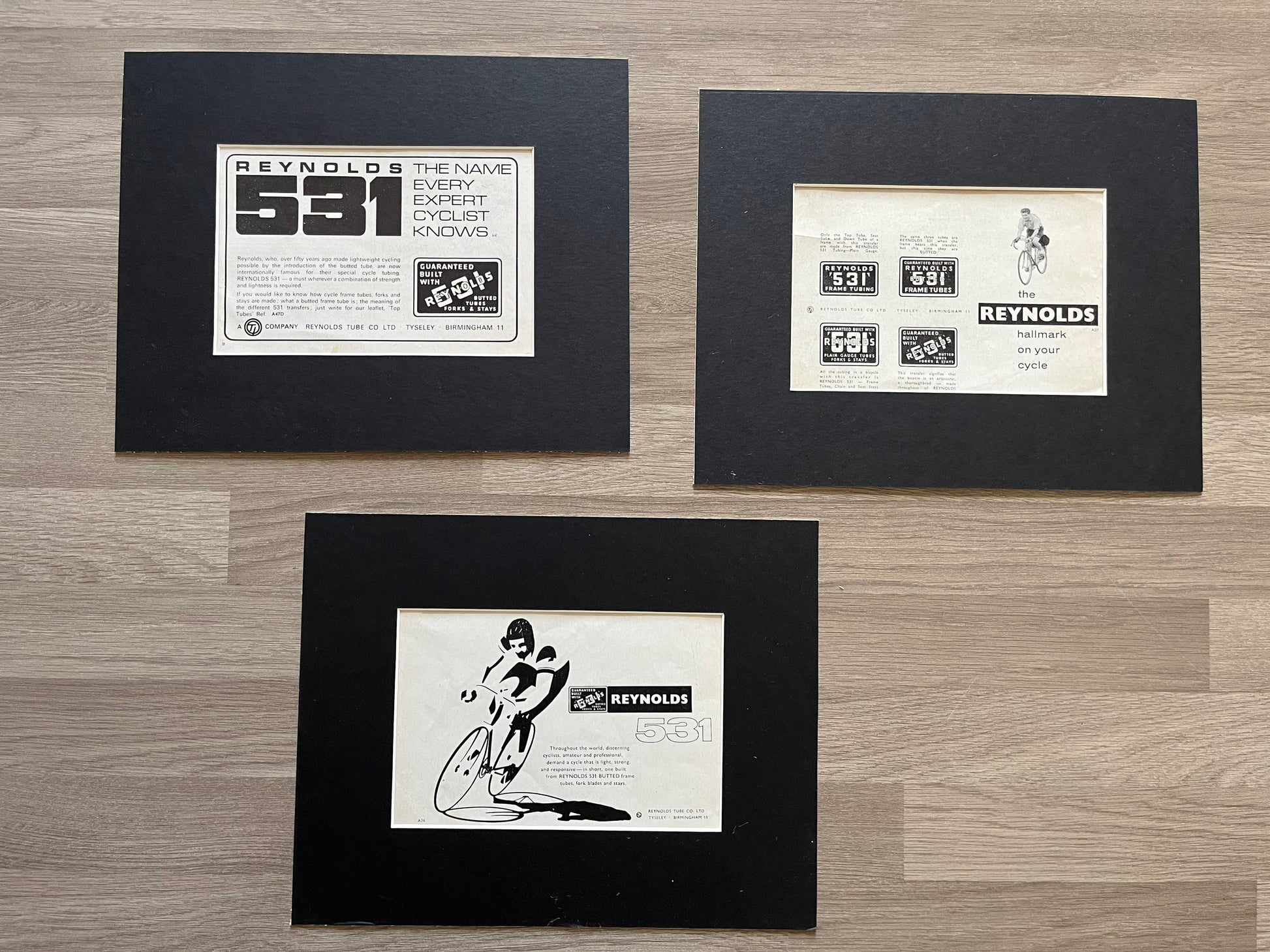 Three vintage Reynolds 531 advertisements card mounted and ready for framing.