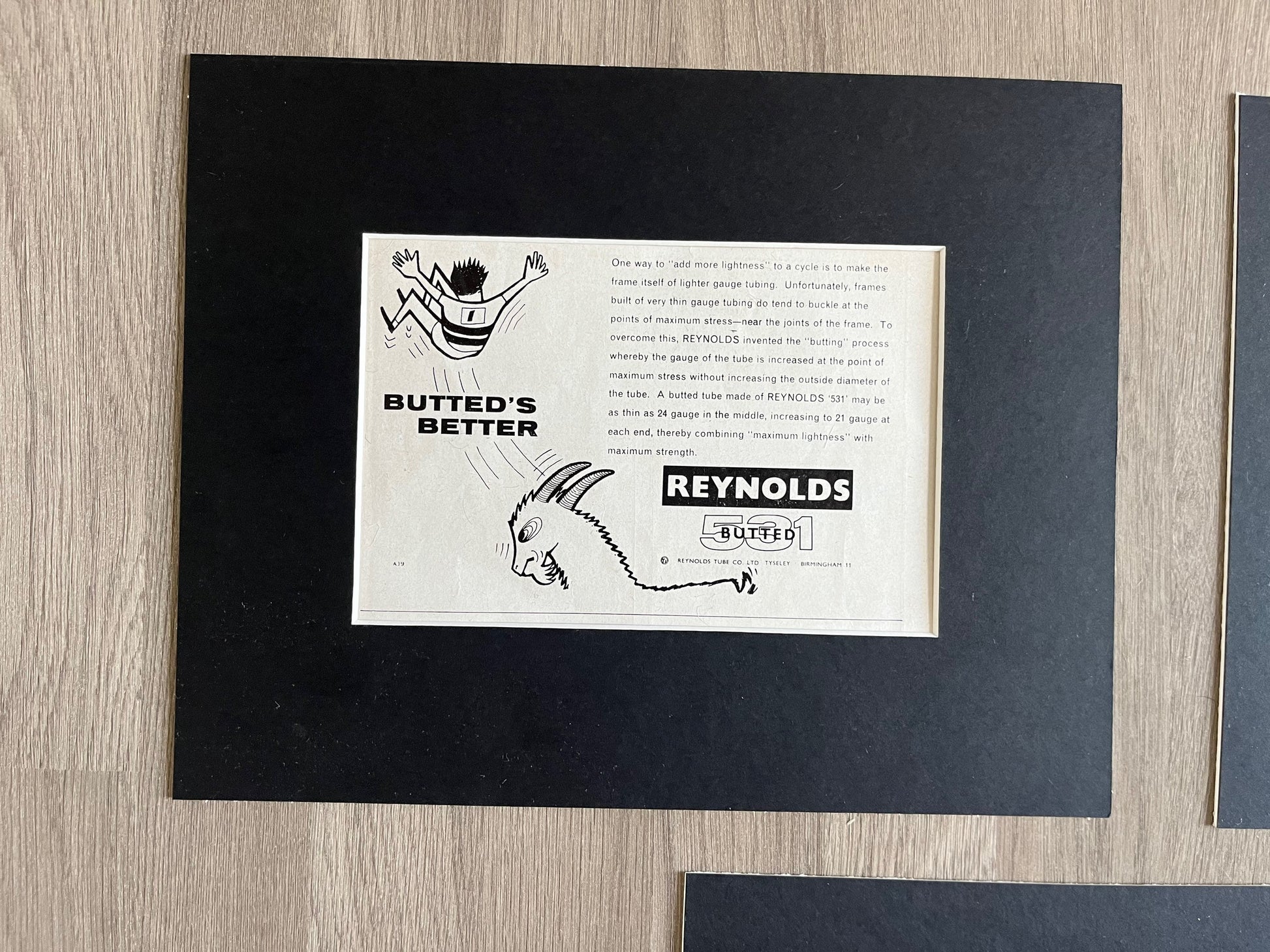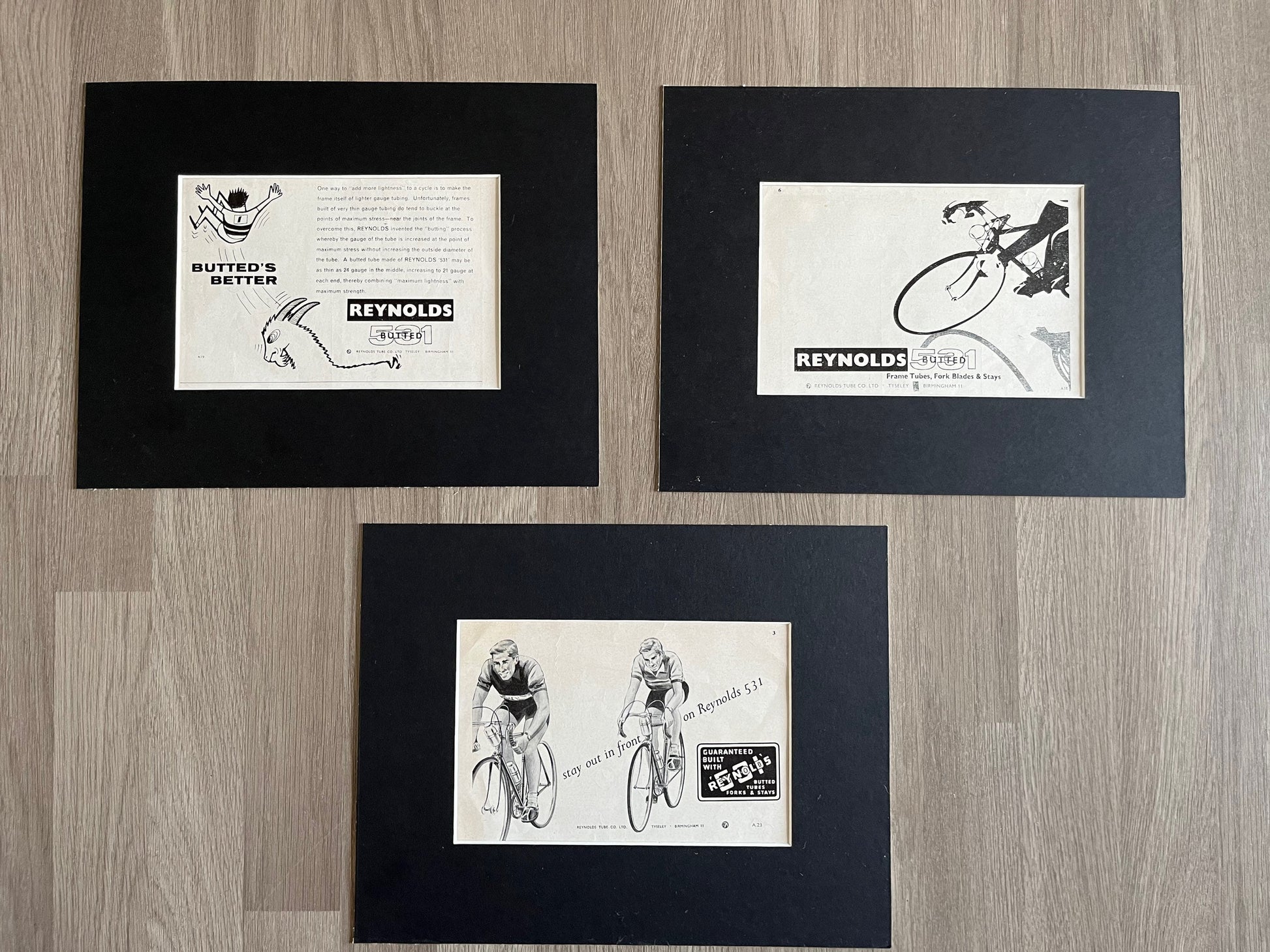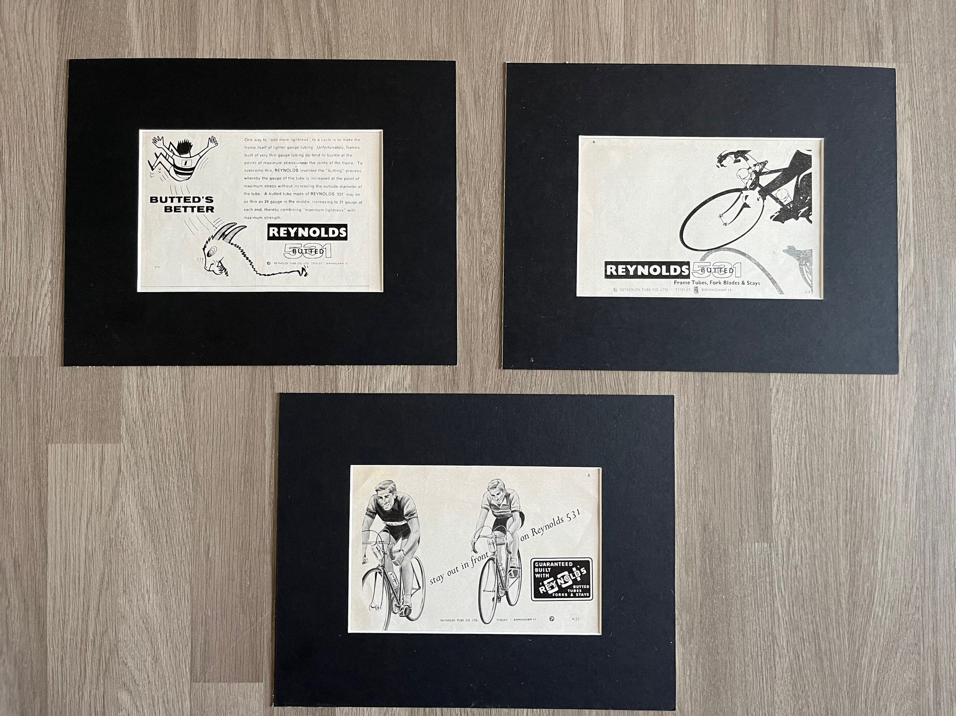 Three vintage Reynolds 531 advertisements card mounted and ready for framing.