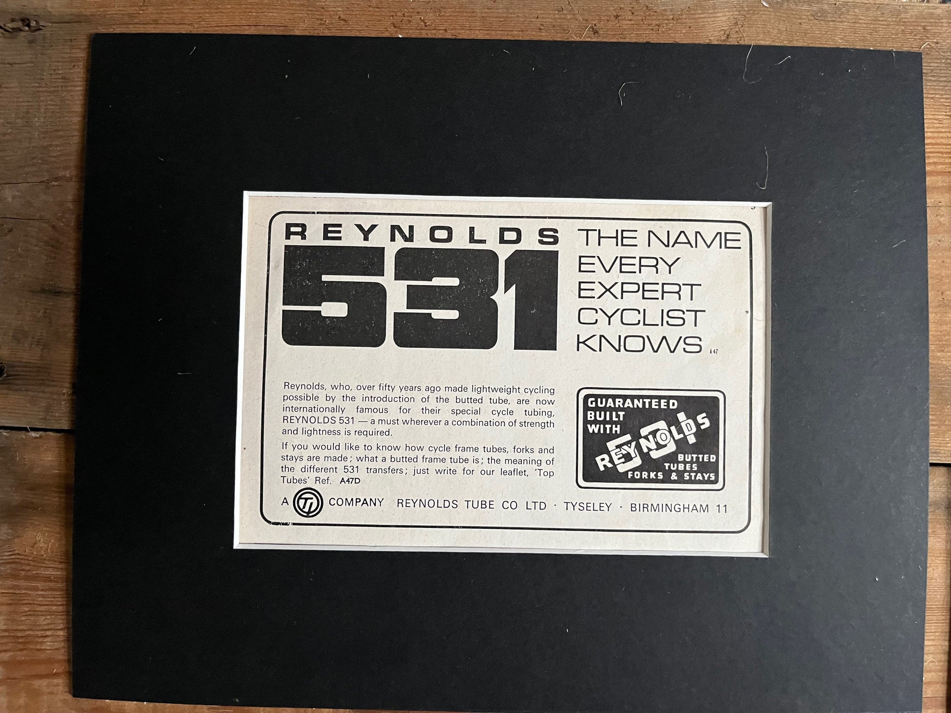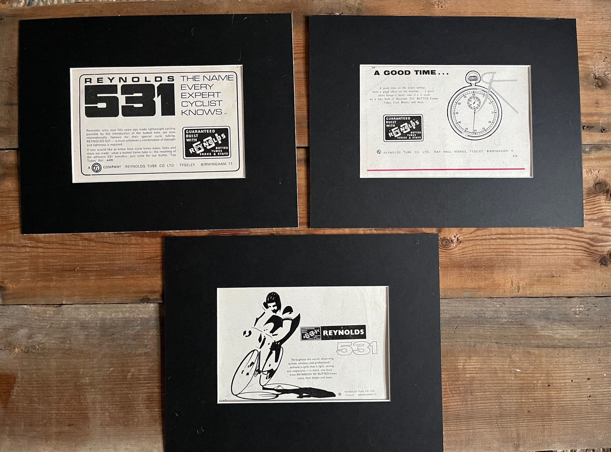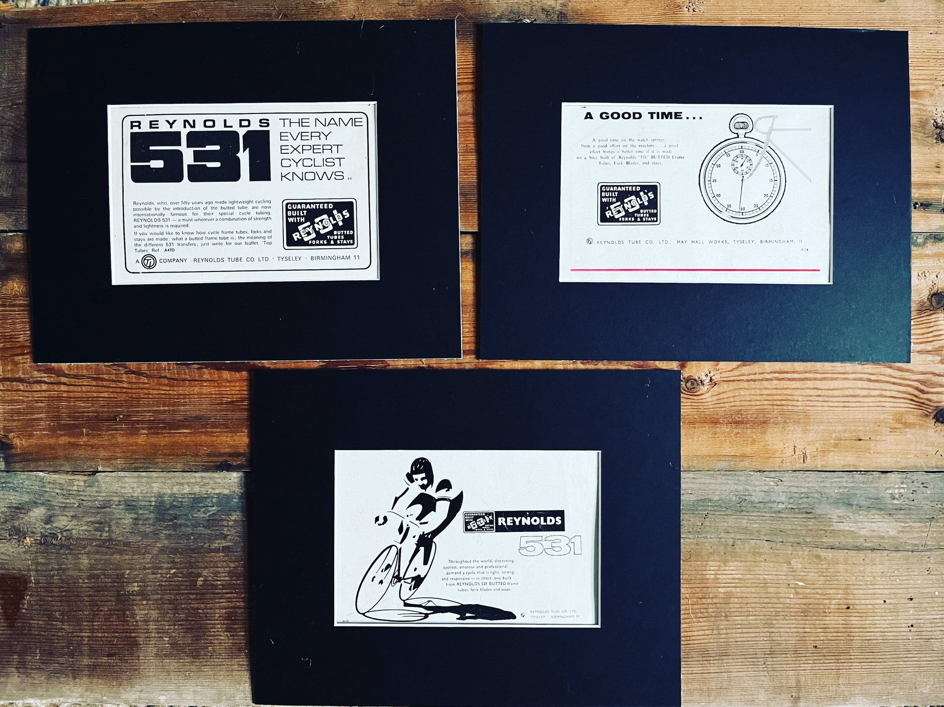 Three vintage Reynolds 531 advertisements card mounted and ready for framing.