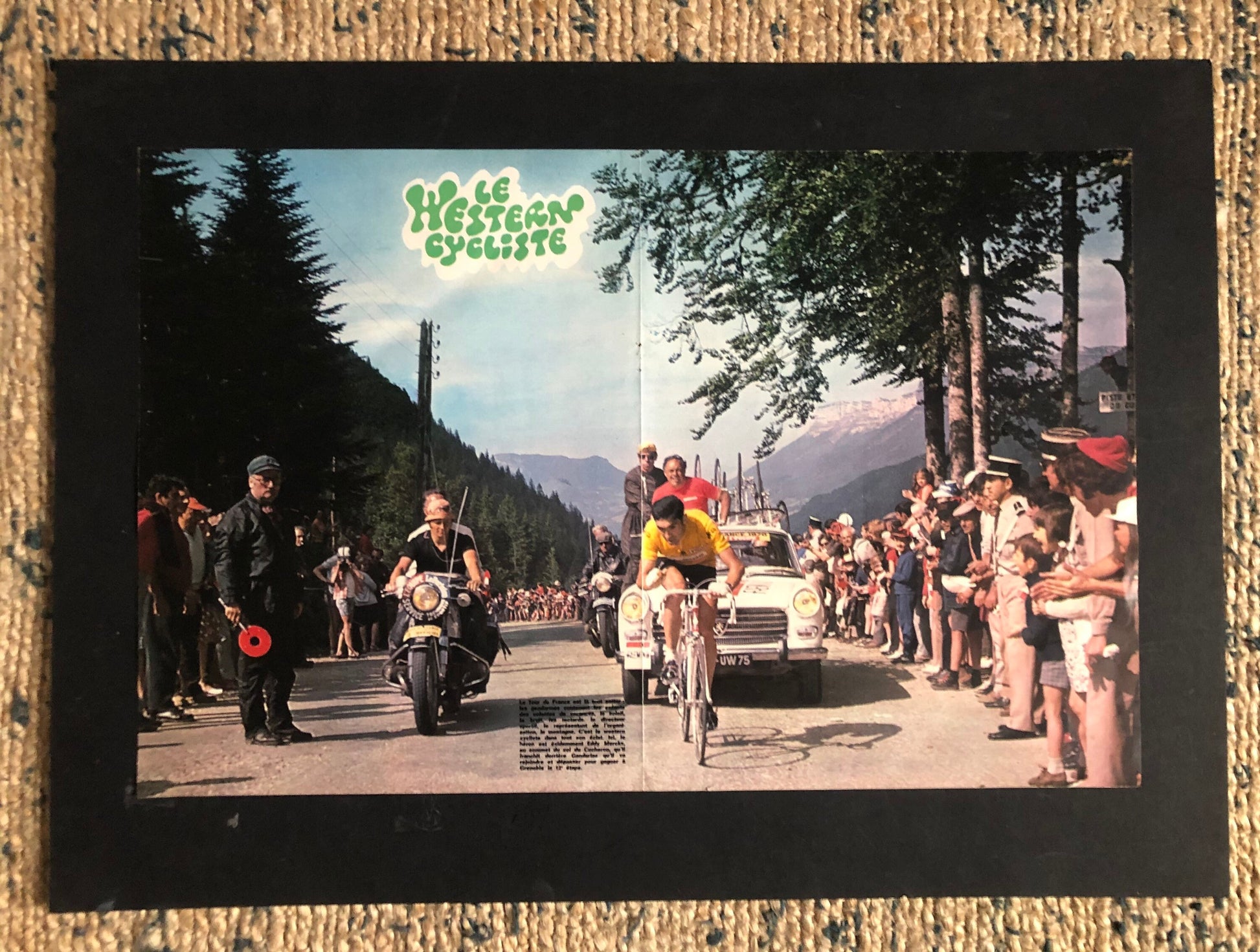 Very rare Original 1975 french cycling magazine print featuring cycling legend Eddy Merckx at the front of the peleton in the Tour de France that year. Would look excellent framed.