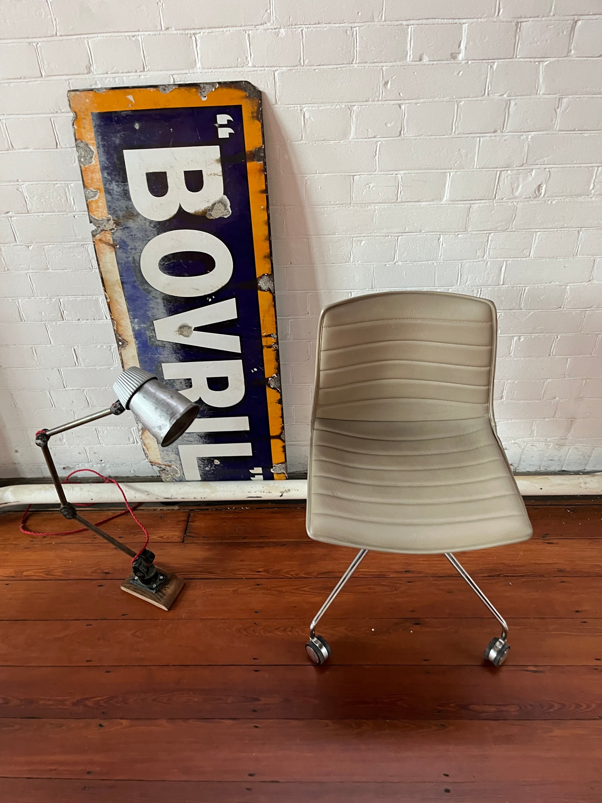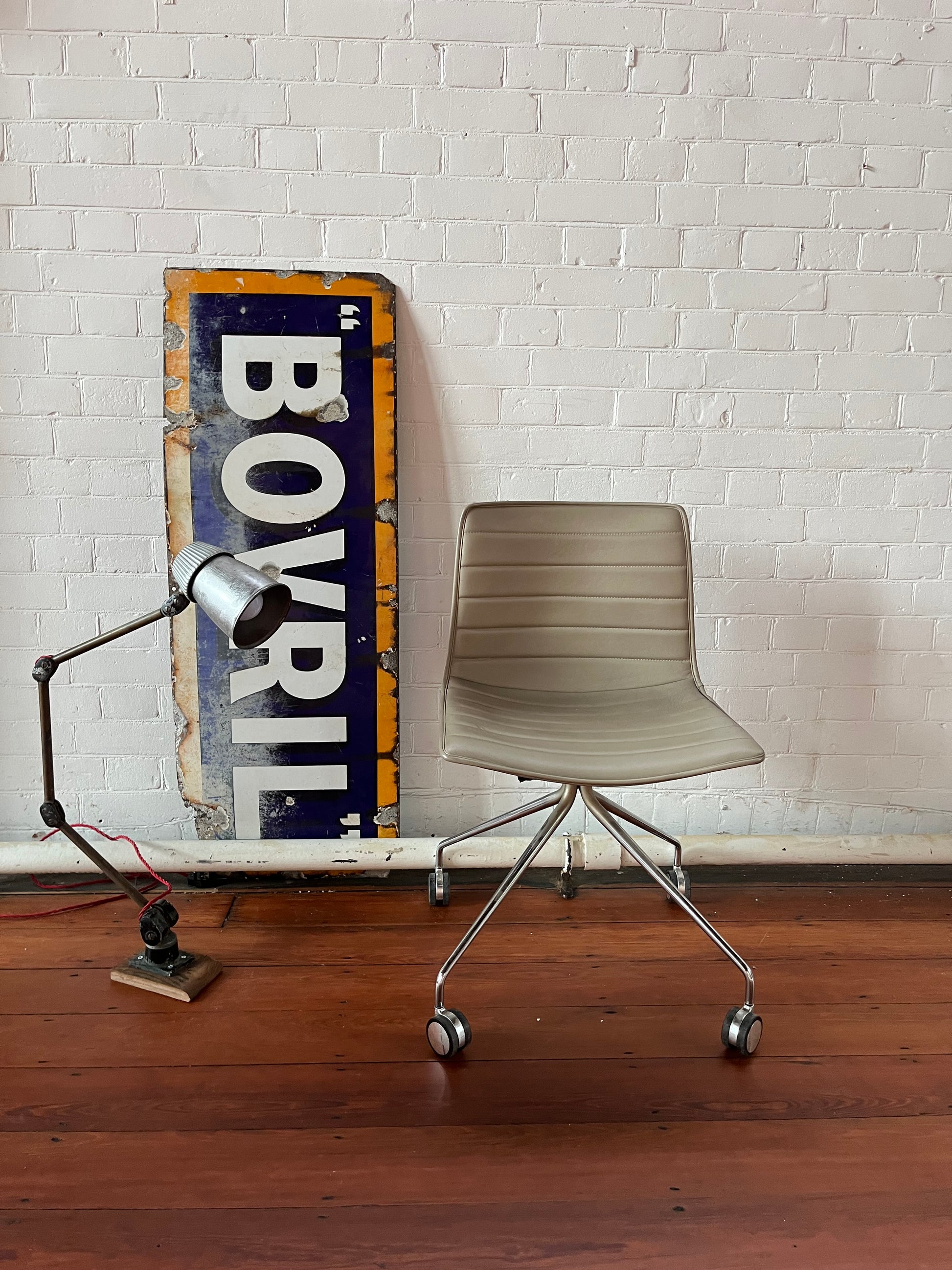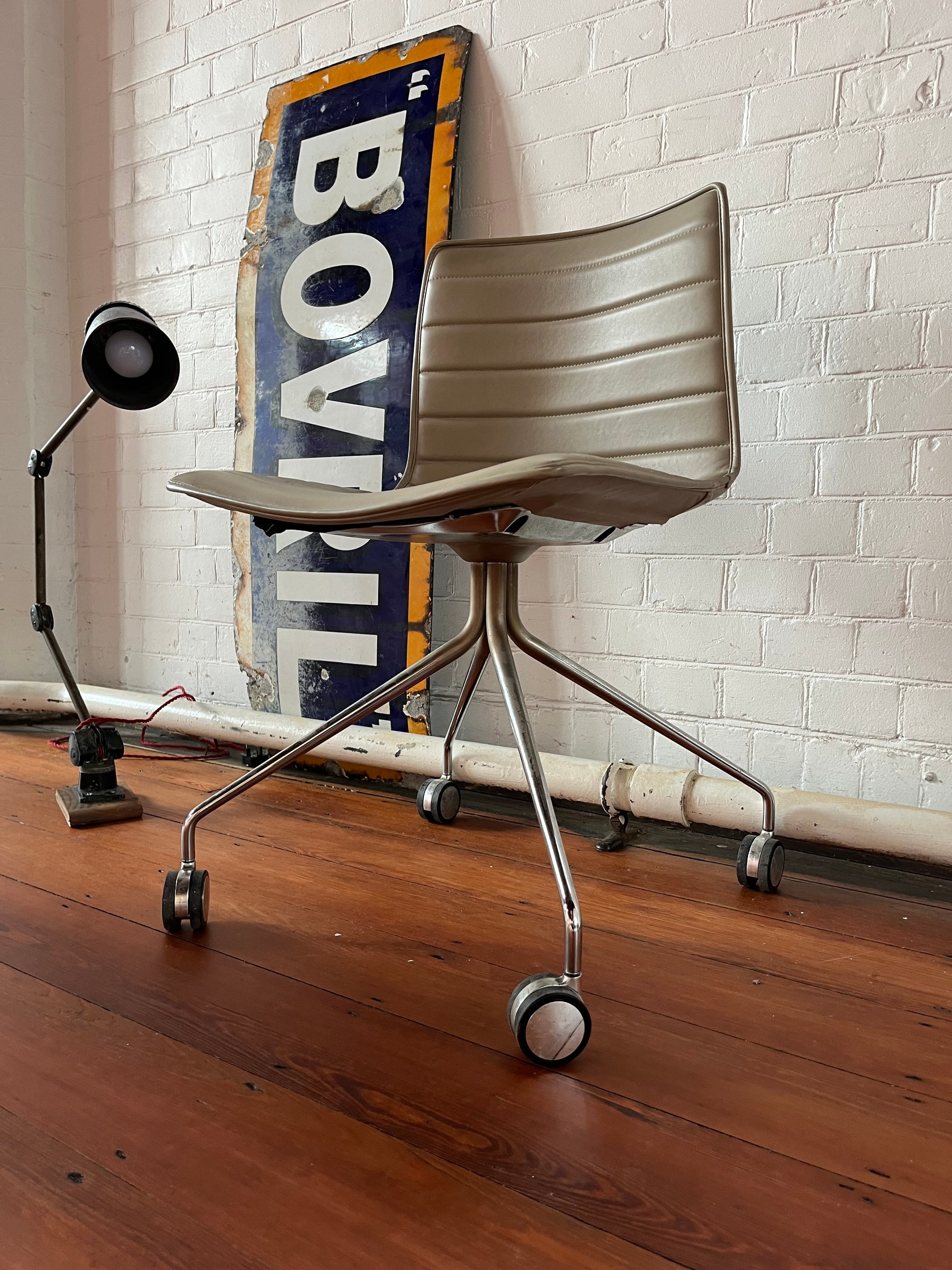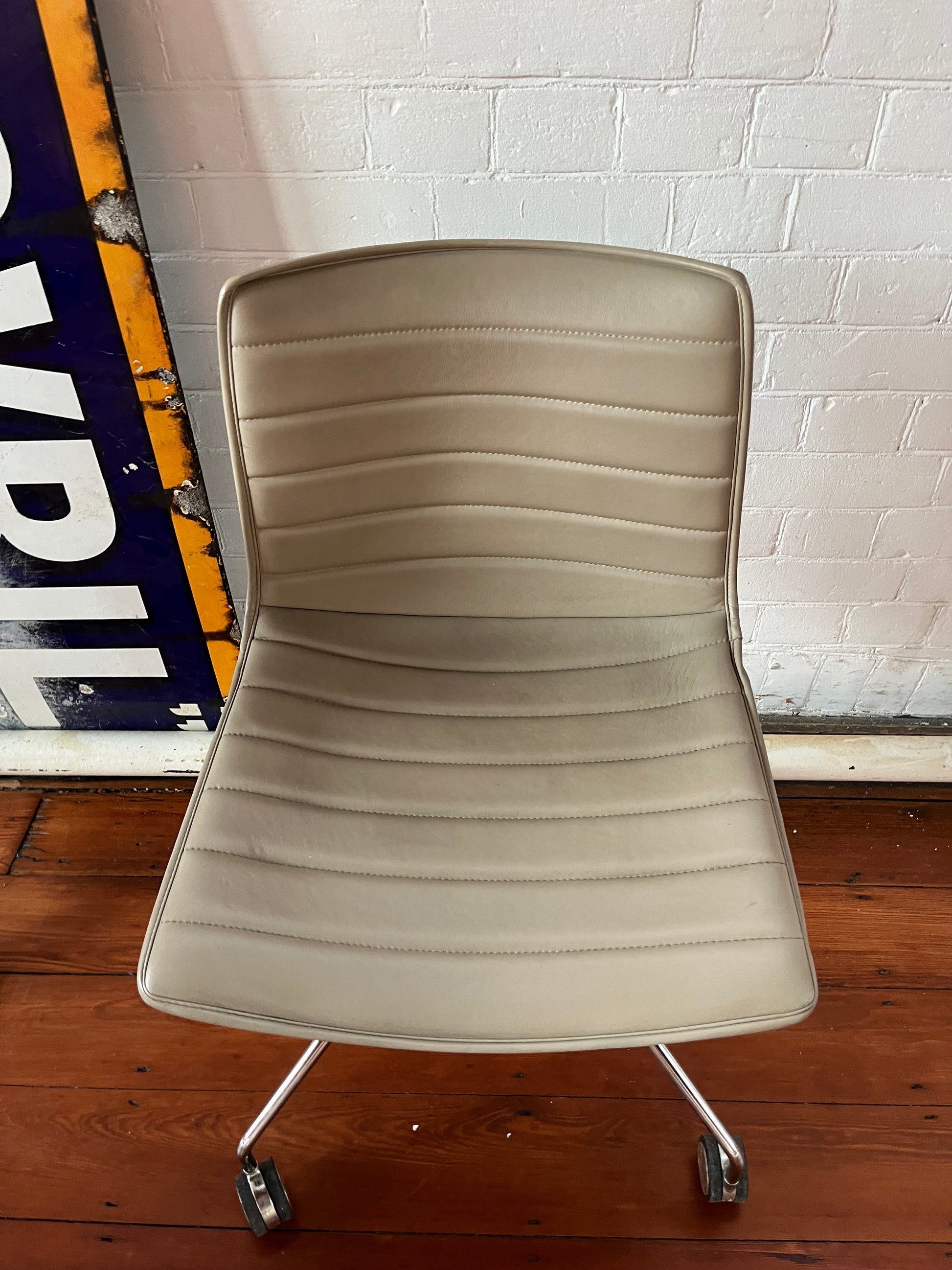 Mushroom coloured leather, on chrome base with wheels. Six are currently available.