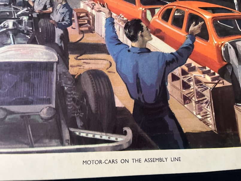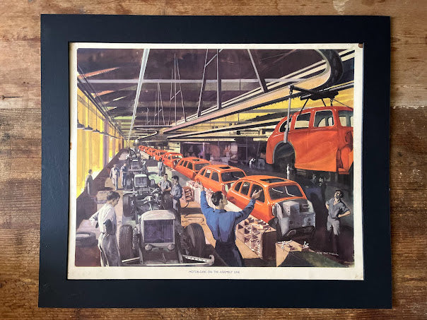 A great example of mid century 'industrial' art - a 1950s school poster depicting workers assembling cars on a production line. A stunning and very cool modernist image..