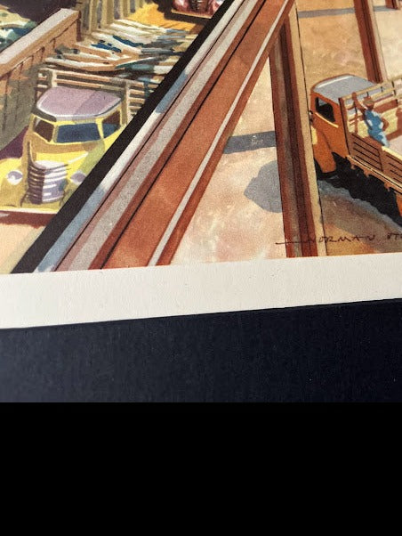A great example of mid century 'industrial' art - a 1950s school poster by Norman Howard depicting a working scene at a Pulp Mill in the United states. Beautiful sharp colourful artwork, will look great on any wall.! A stunning and very cool modernist image..