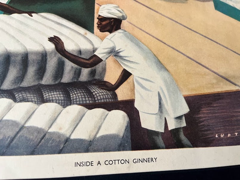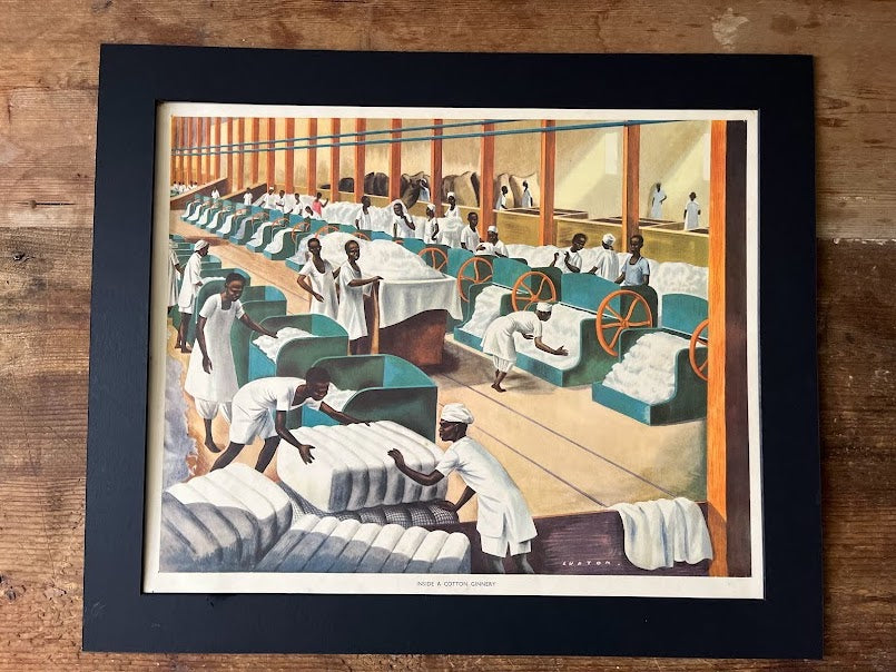 A great example of mid century 'industrial' art - a 1950s school poster depicting workers inside a cotton 'ginnery' in the West Indies.