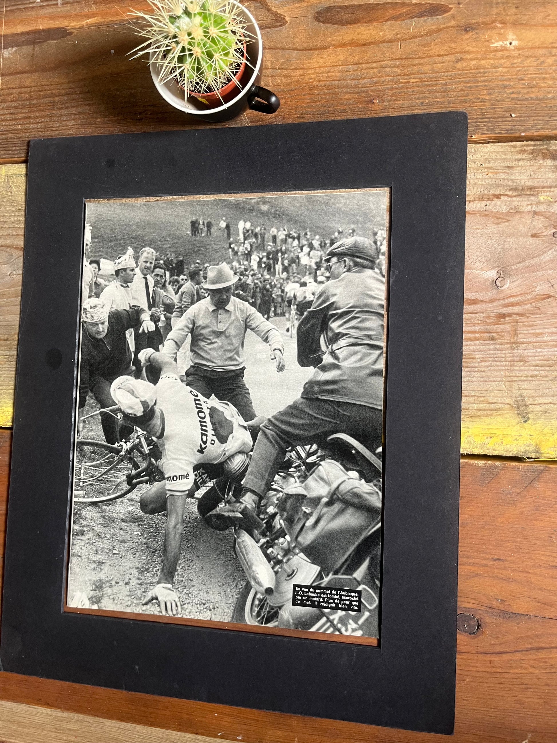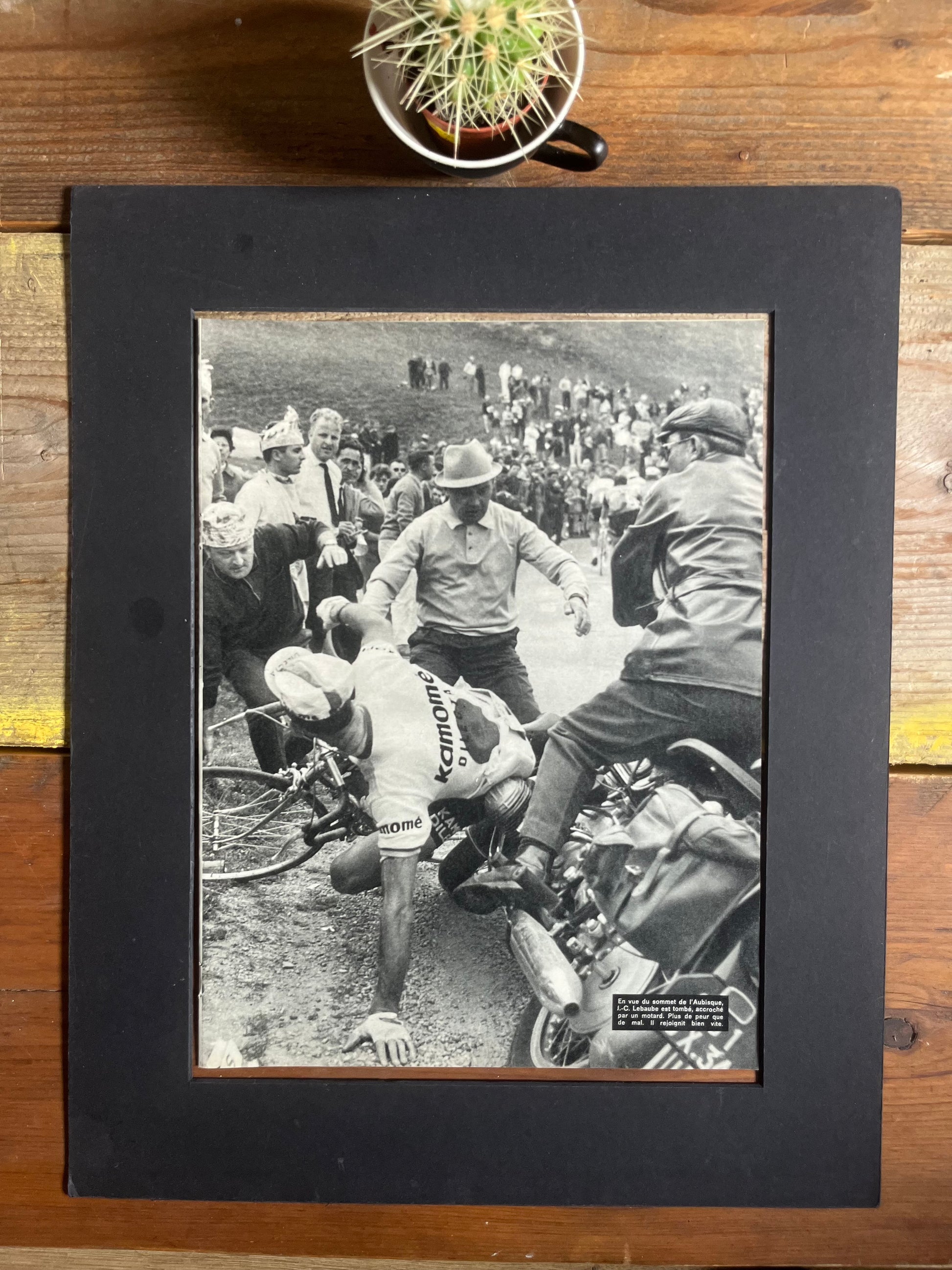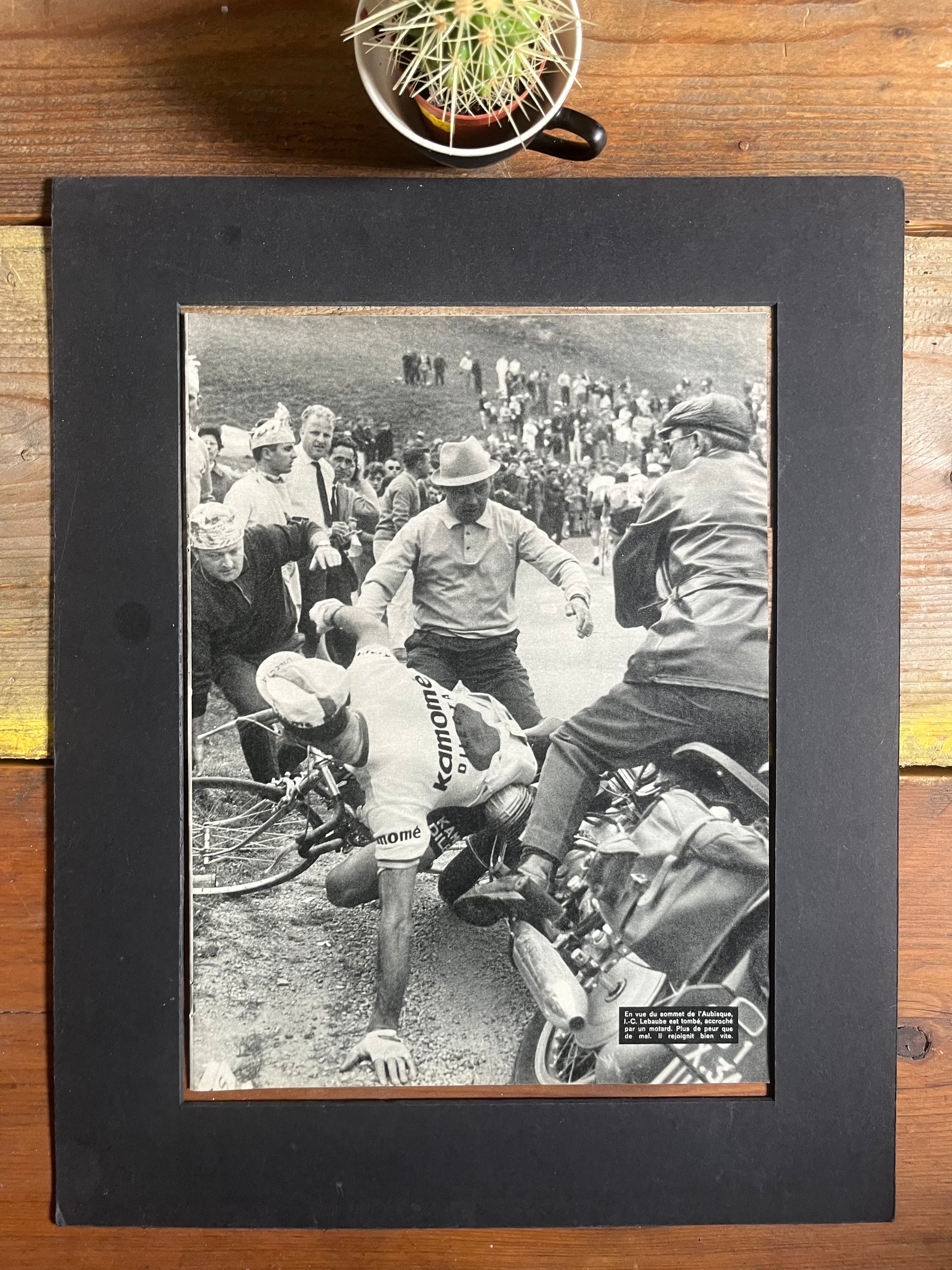 A one off piece of artwork and awesome image! Original 1966 french cycling magazine poster sfeaturing a rider colliding with a press motorcycle in the Tour de France that year.