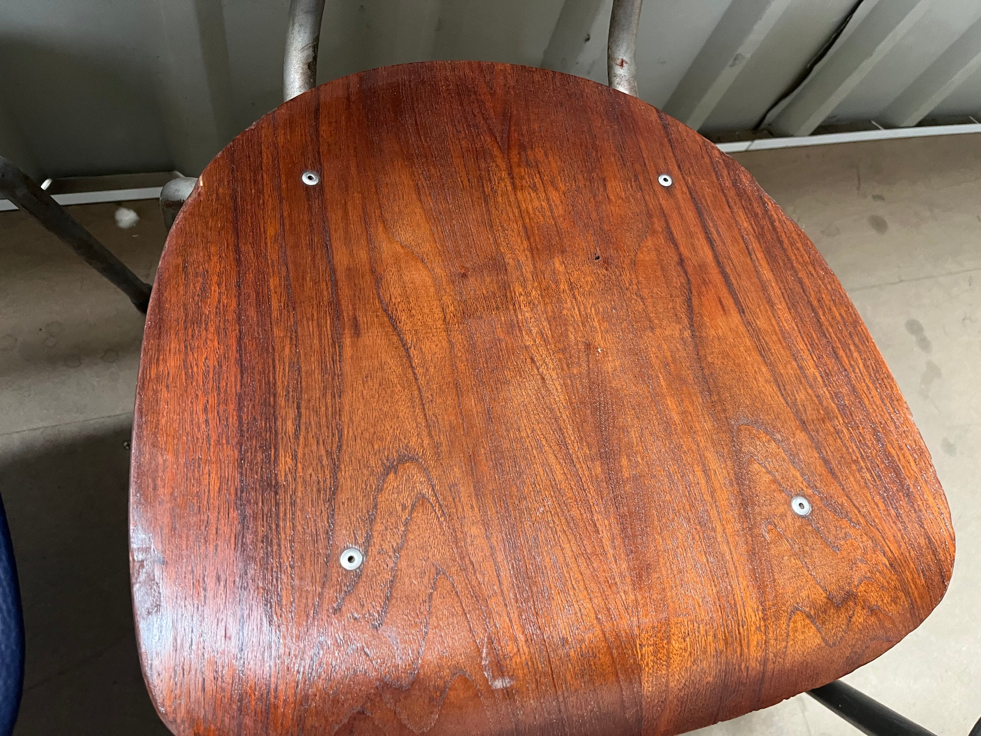 The chairs have been checked, cleaned, painted and waxed. They are otherwise unrestored with paint loss / patination to the metal legs. They are painted in contrasting colours.