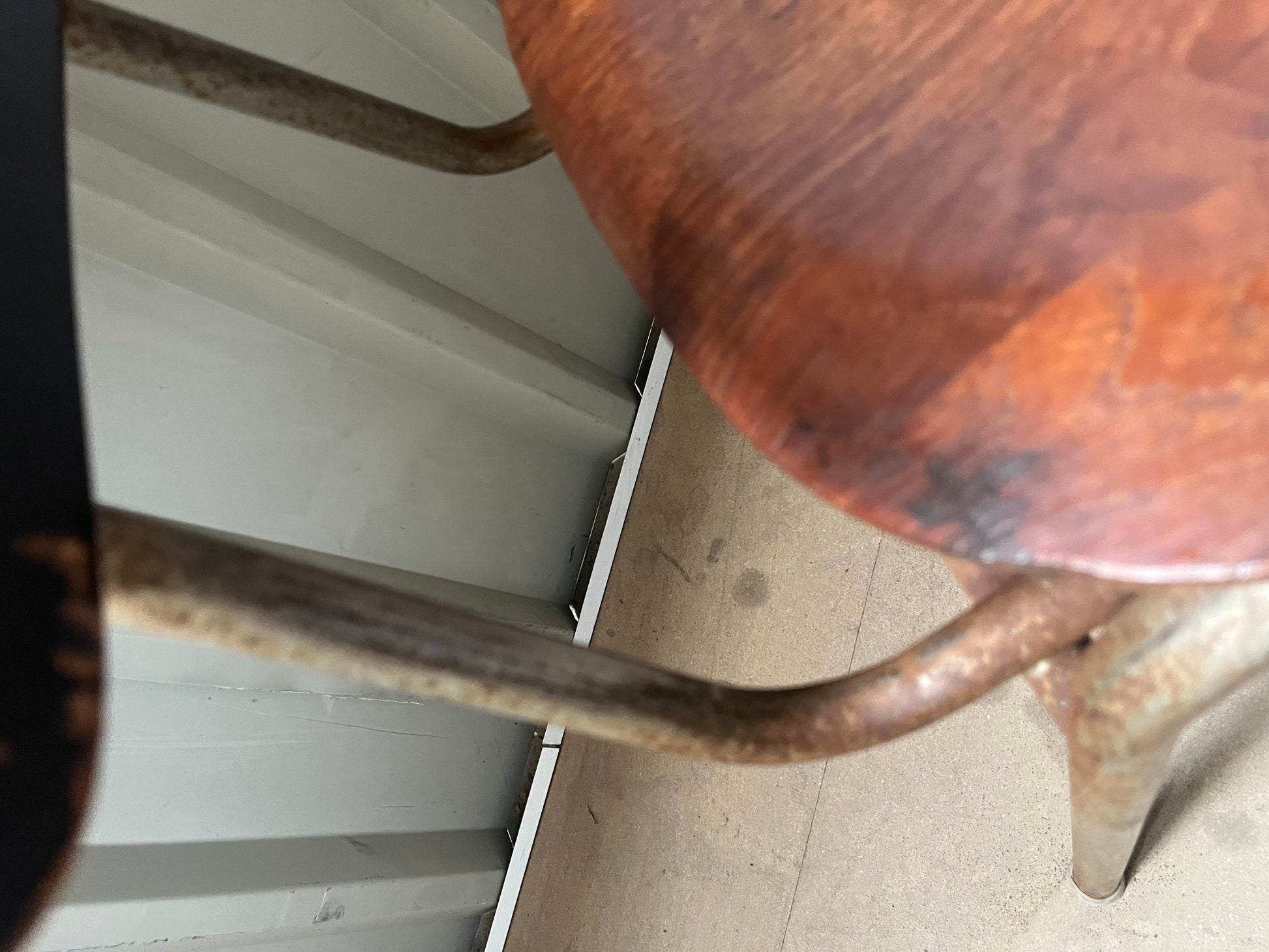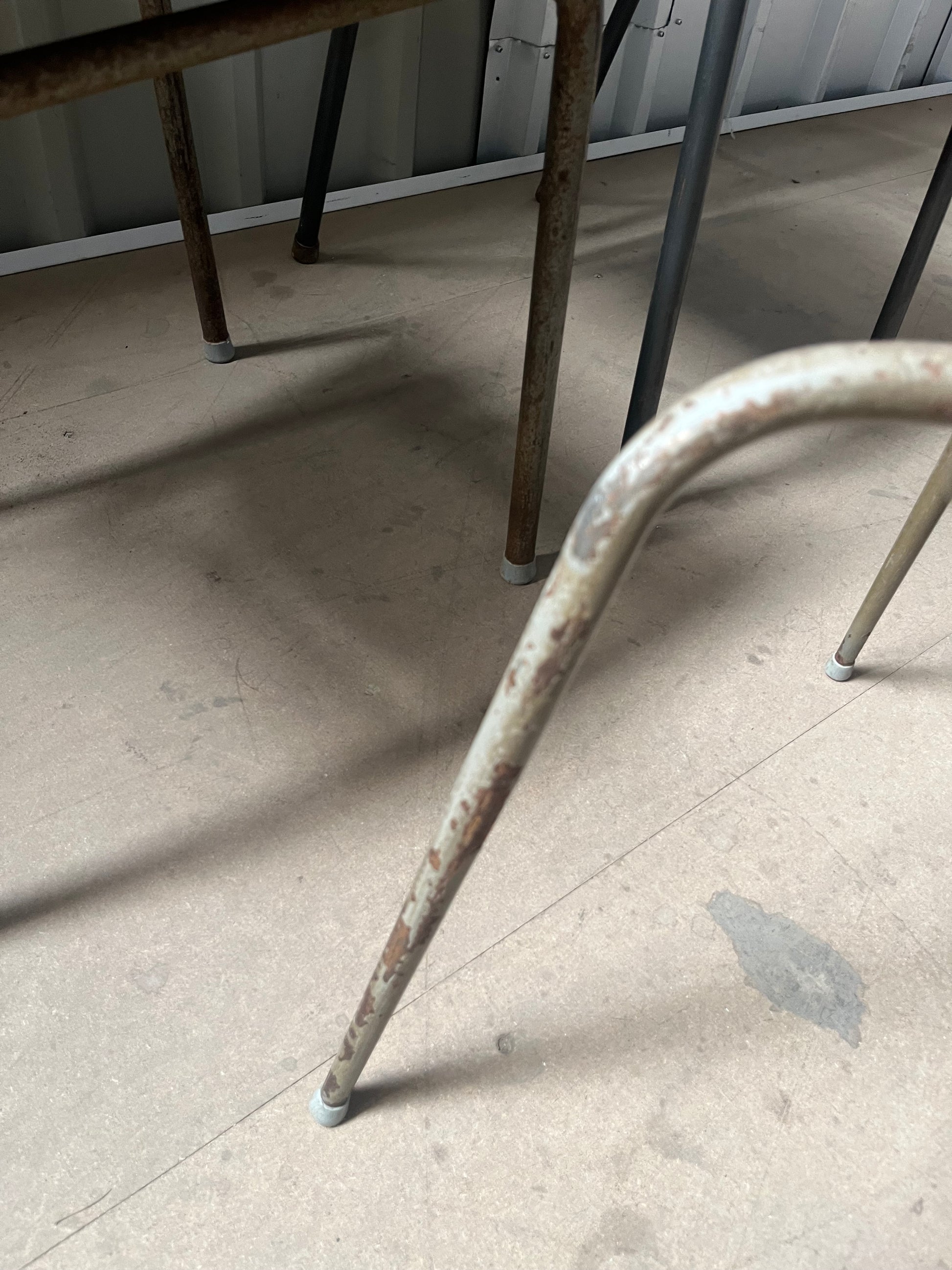 The chairs have been checked, cleaned, painted and waxed. They are otherwise unrestored with paint loss / patination to the metal legs. They are painted in contrasting colours.