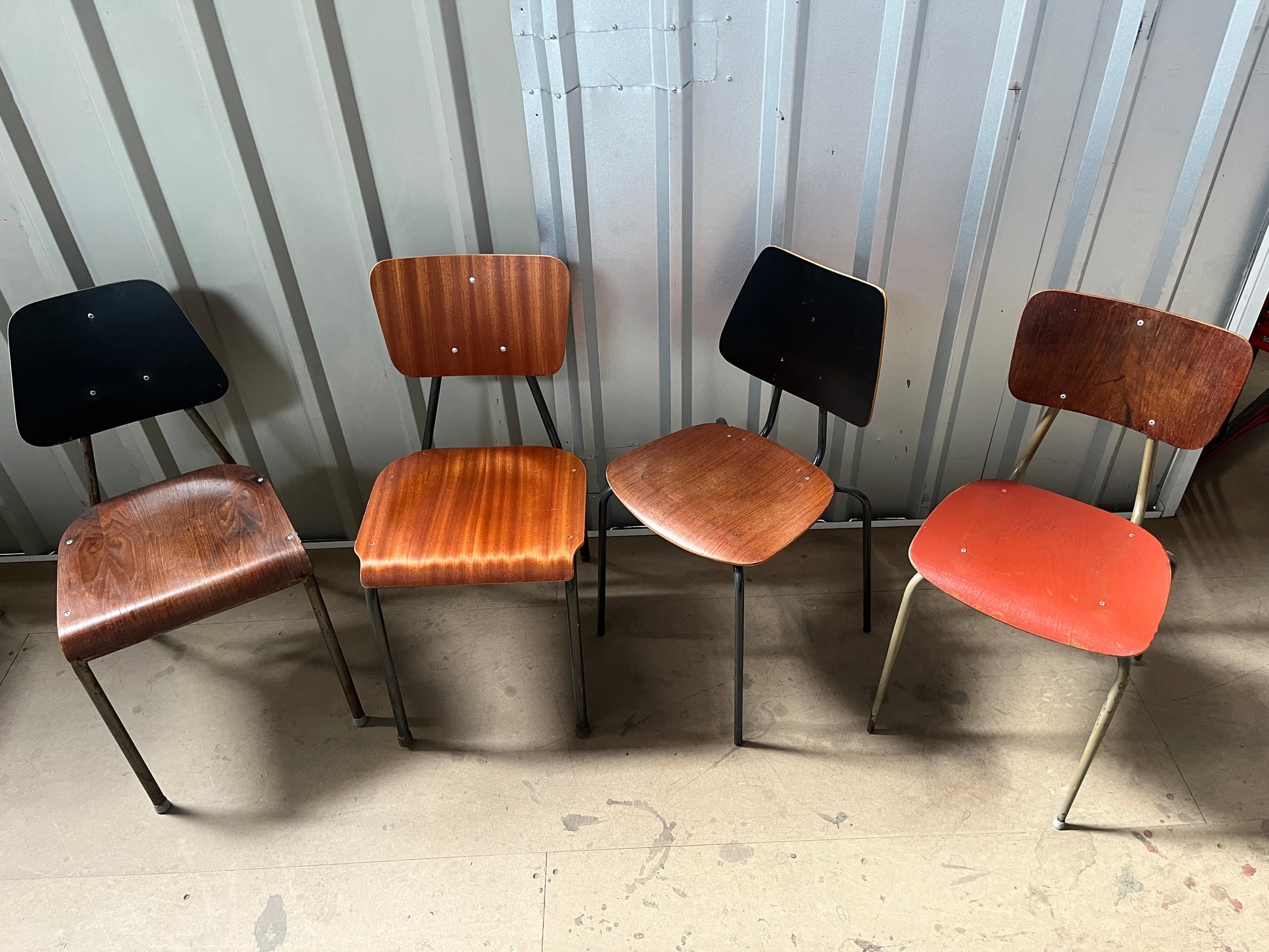 Totally unique set of four contrasting (Mismatched) Danish industrial design chairs, reclaimed from schools, and government buildings.