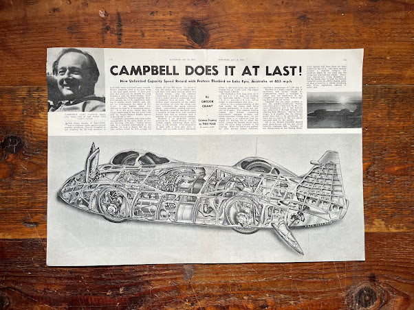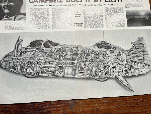 Original 1964 magazine print of a cutaway drawing of Donald Campbell's world speed record breaking car -Bluebird Proteus CN7 in which he broke the land speed record at 403mph at theLake Eyre salt flats in Australia. This is an original print and not a scanned copy. A stylish vintage piece of artwork for the lounge, workshop or study. and an excellent gift for the motoring enthusiast. Card mounted ready for framing. Pleases note that the black card surround is not included.
