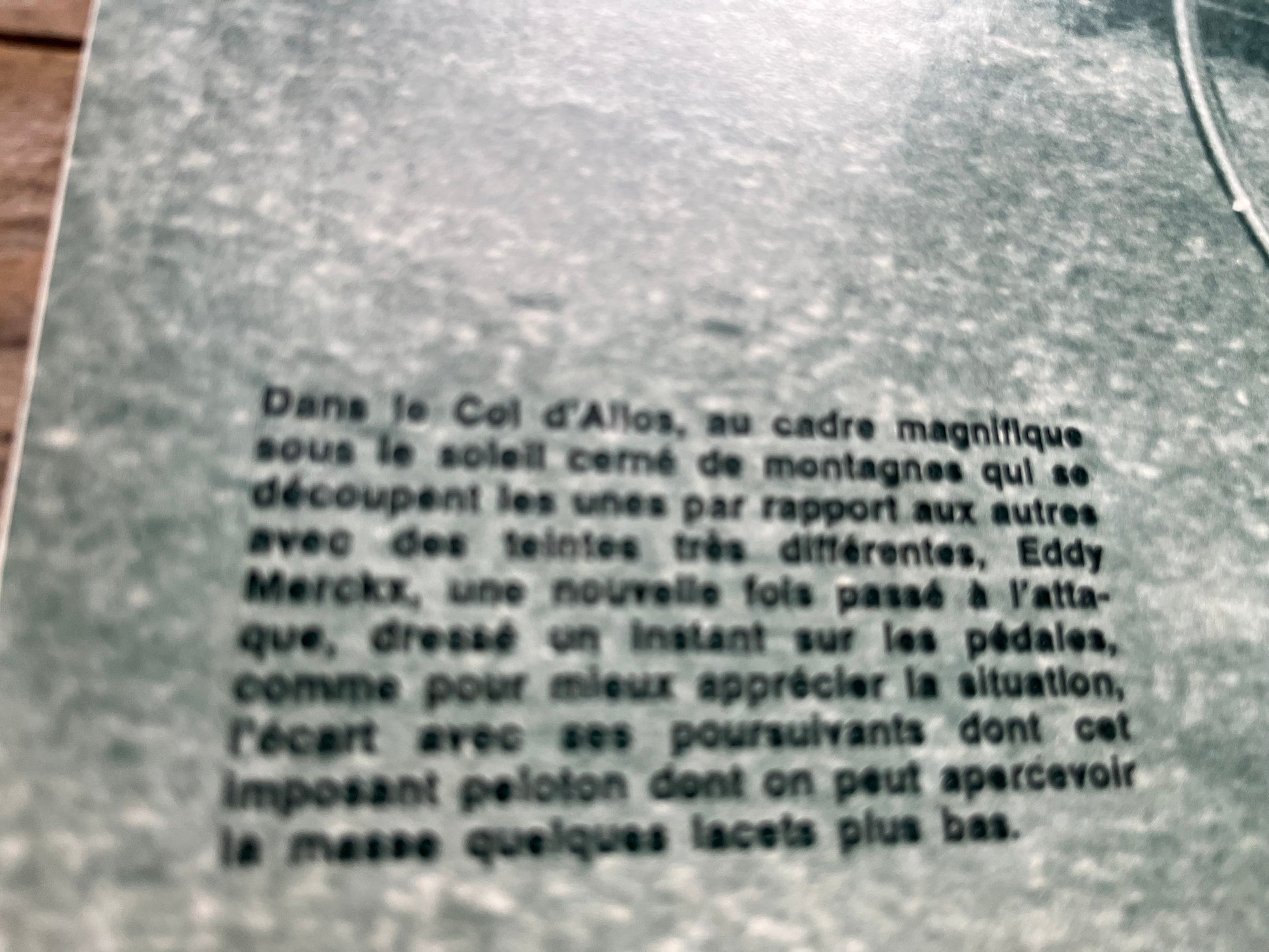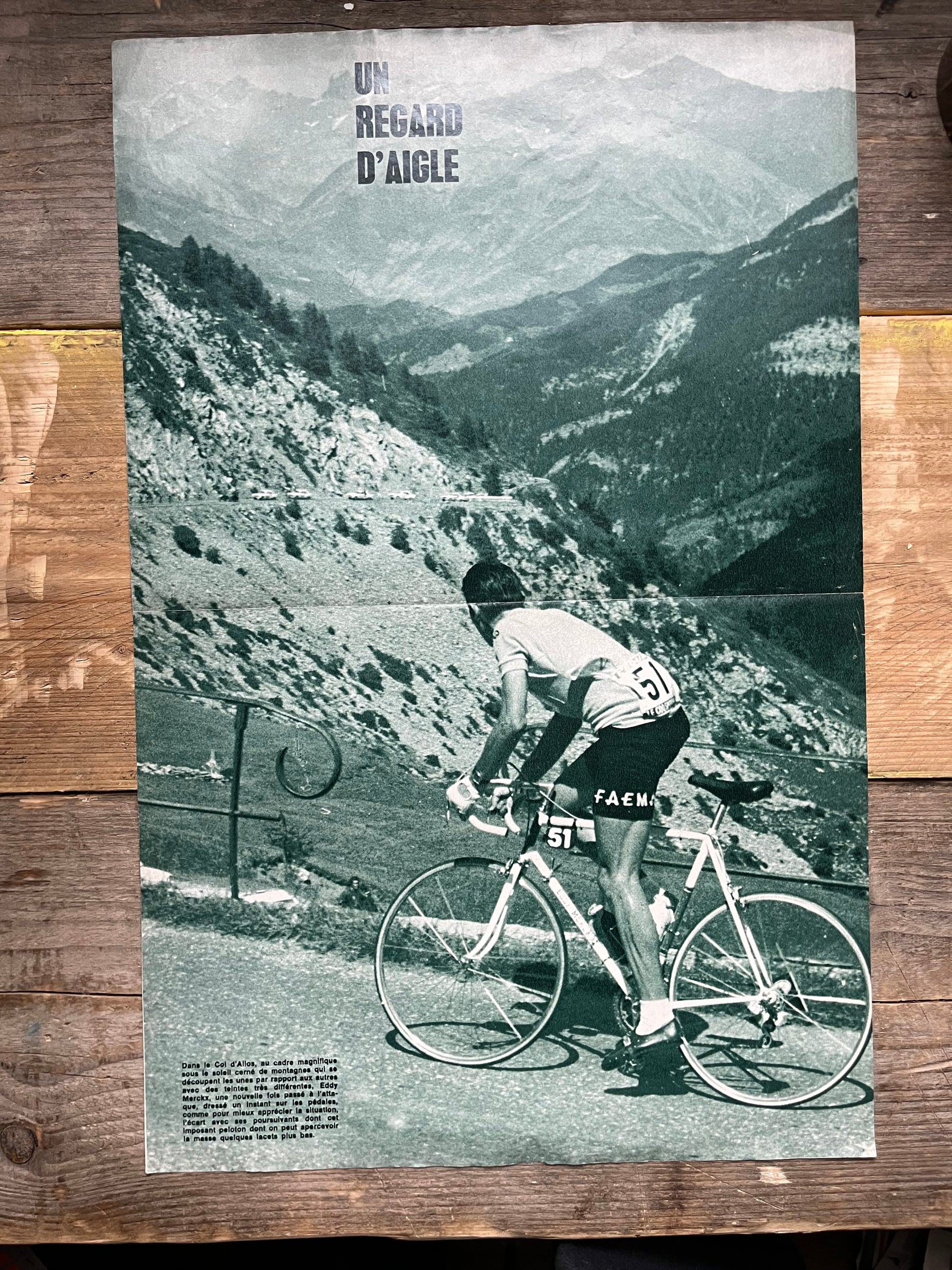 Rare original c1969 cycling magazine artwork featuring cycling legend Eddy Merckx riding in Faema team kit. This is an original print and not a copy.