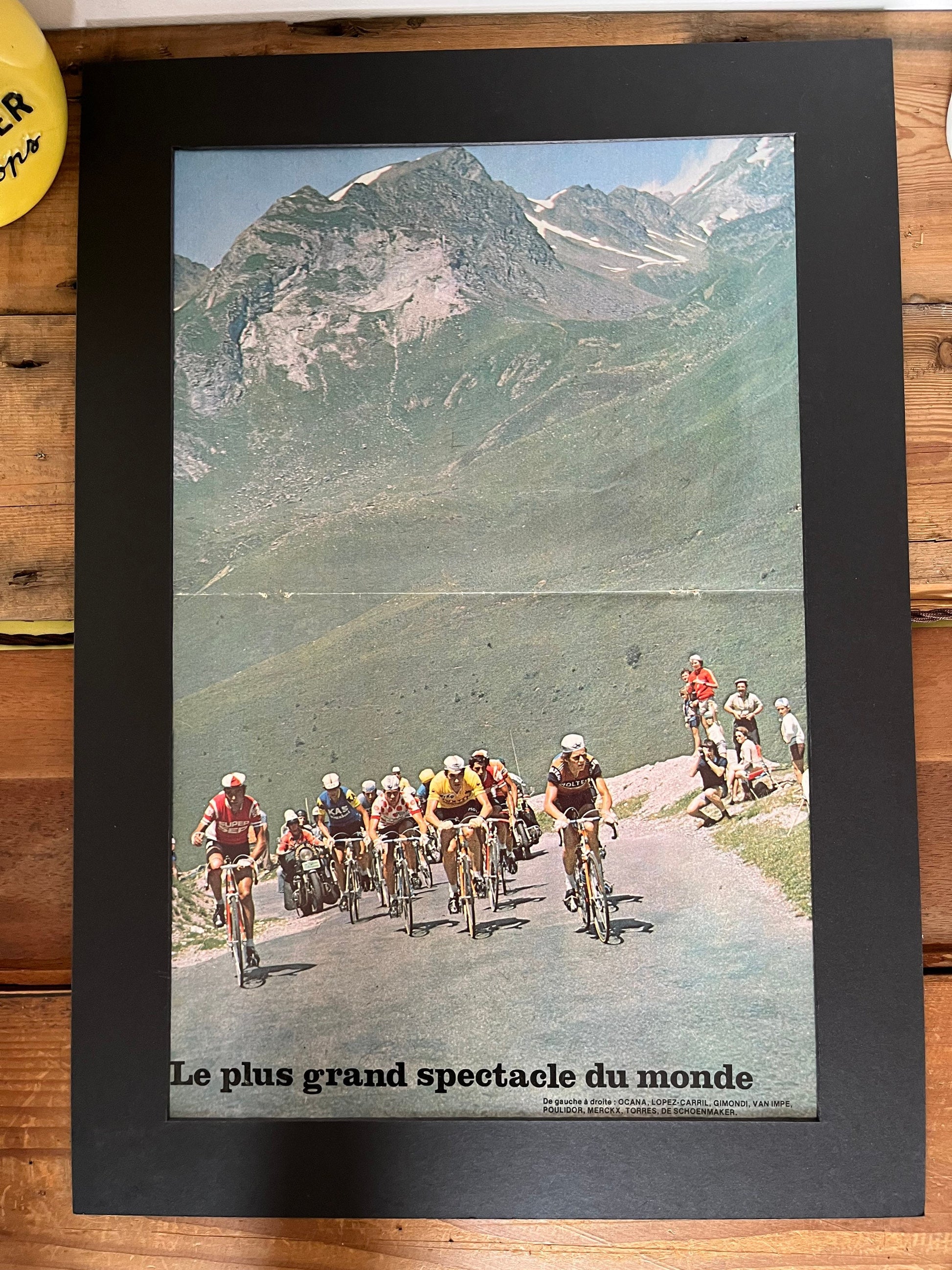 Very rare Original 1974 french cycling magazine print featuring cycling legend Eddy Merckx at the front of the peleton in the Tour de France that year. In the peloton are the greats of the era Luis Ocana, Felice Gimondi, Raymond Poulidor and Lucien Van Impe. Would look excellent framed.