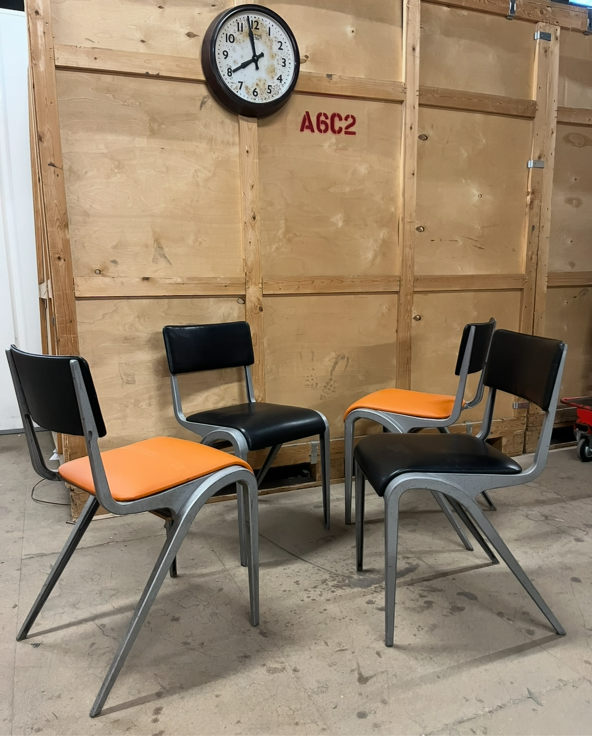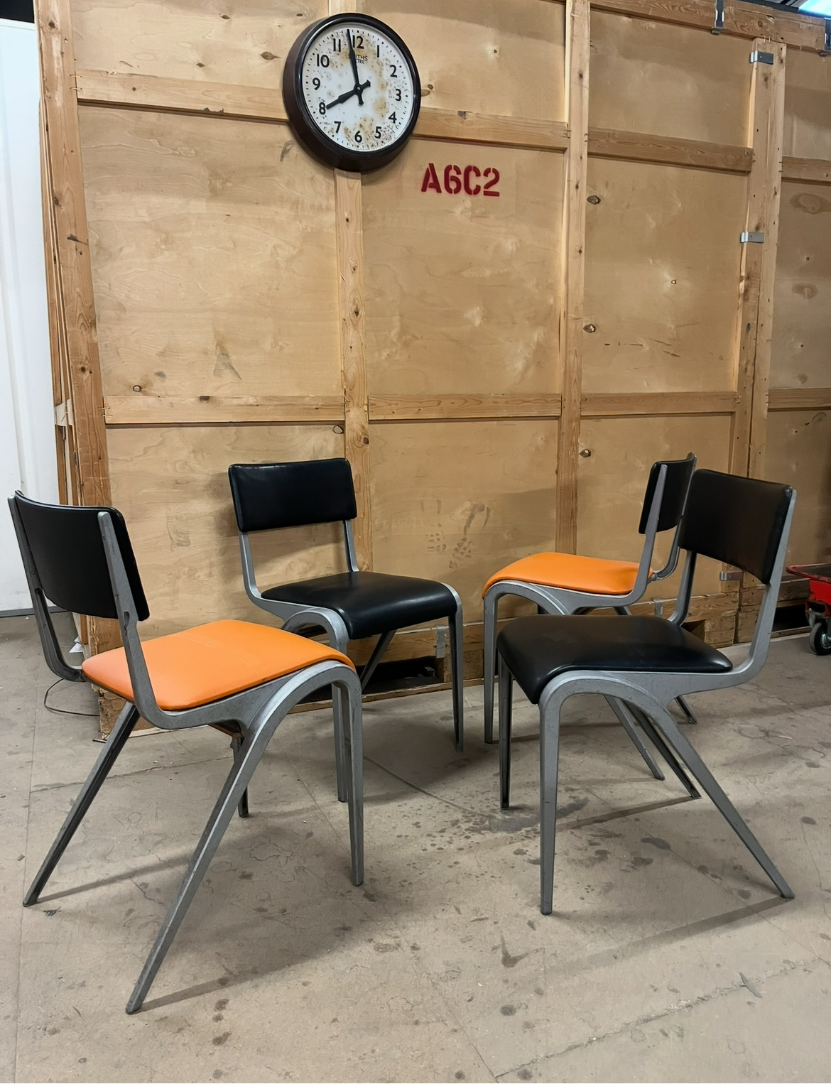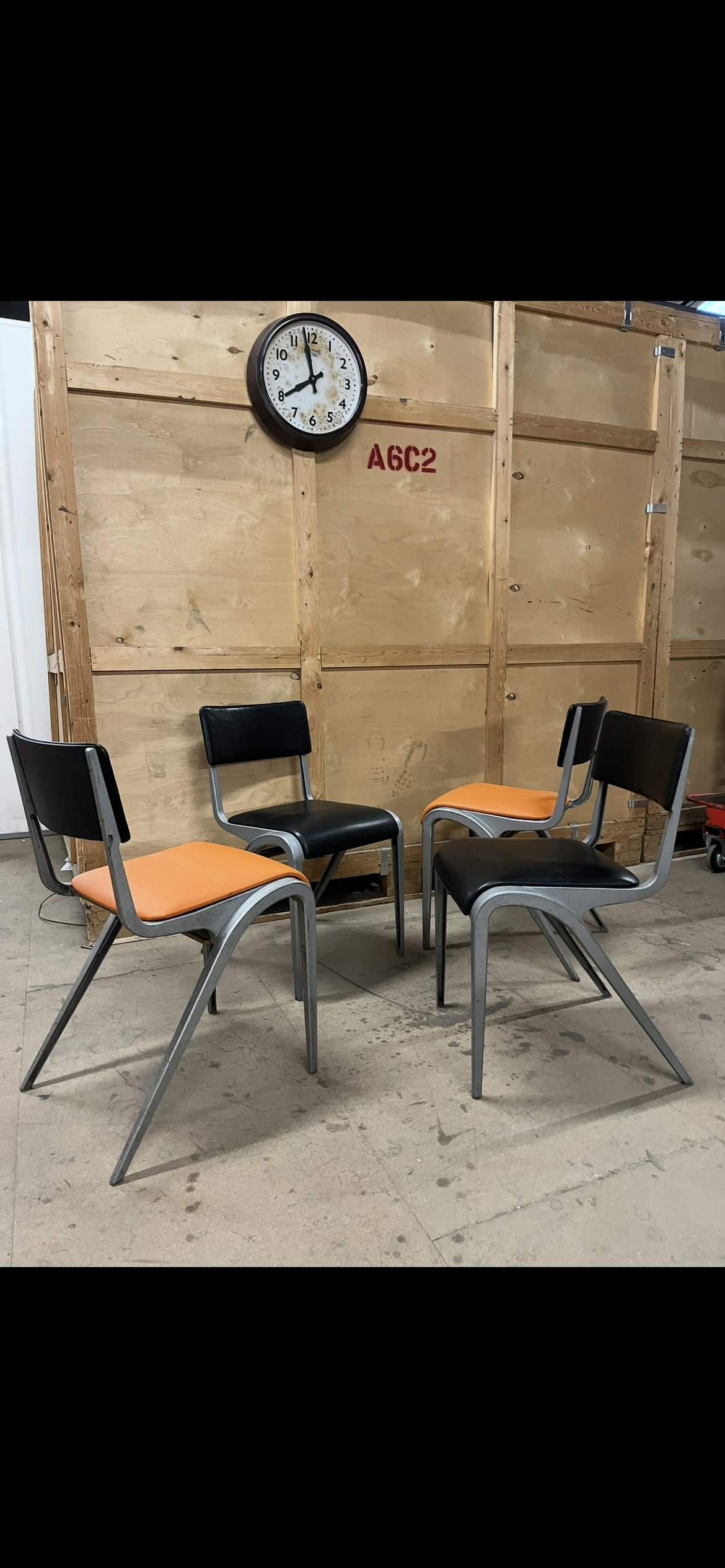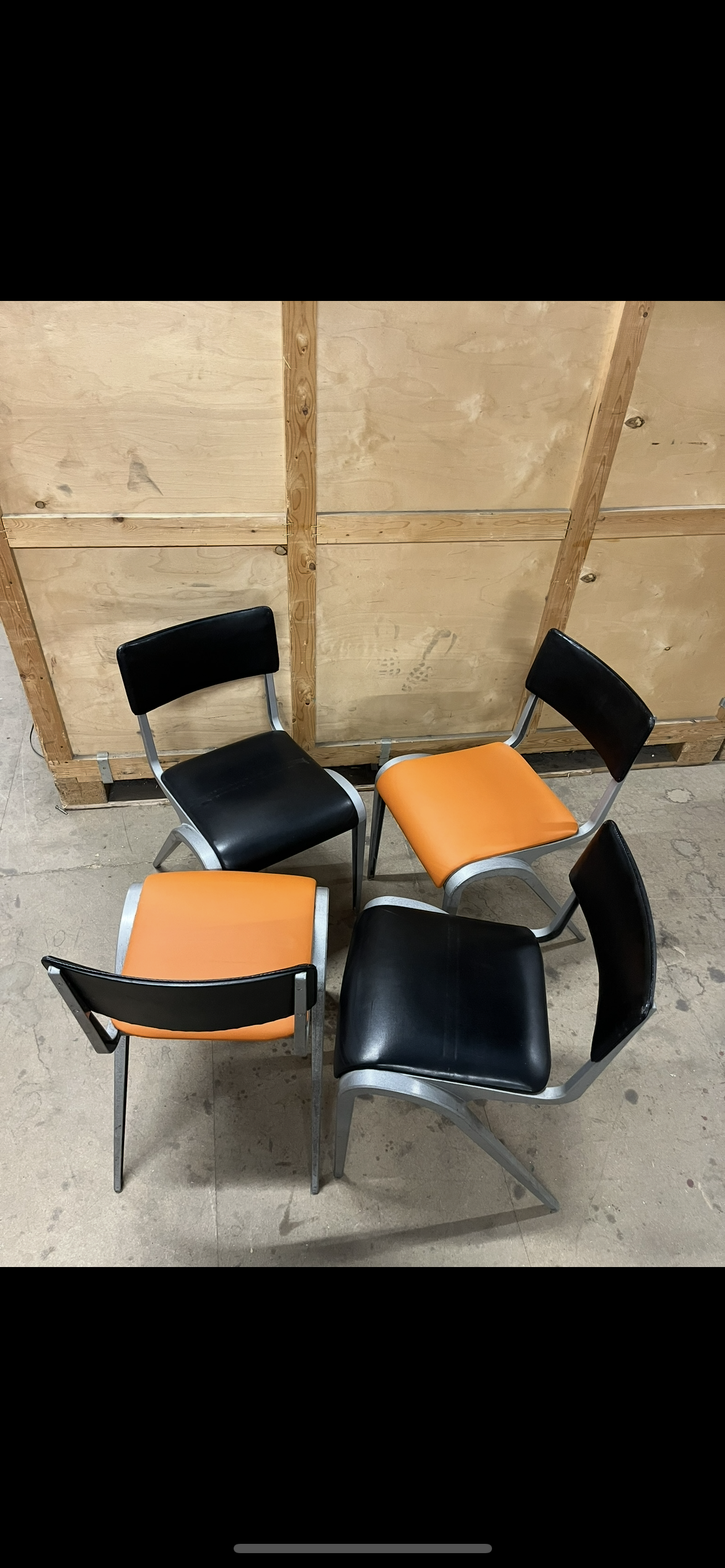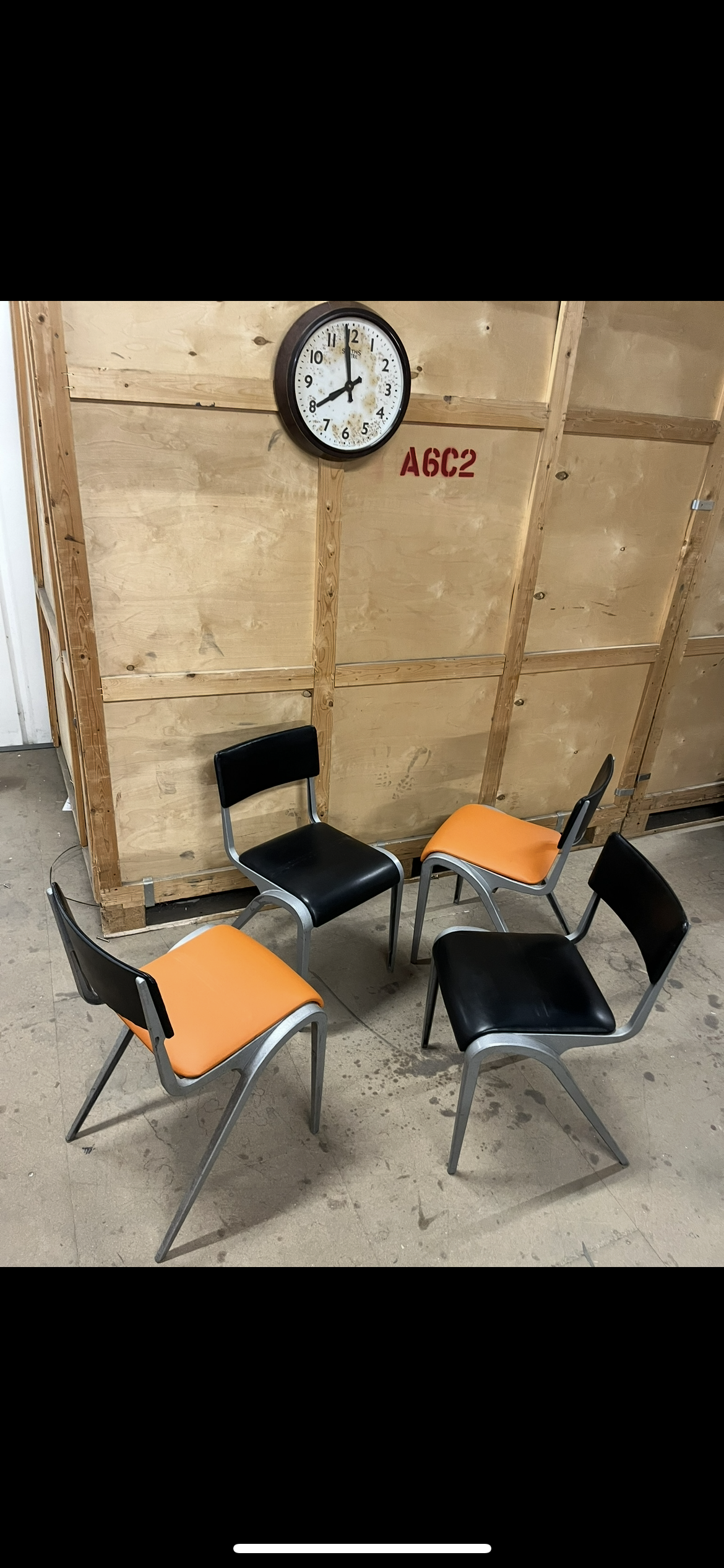 Beautiful aluminium swooping frames with faux leather cushions. Two black and two dark orange. These are becoming very hard to find now.
