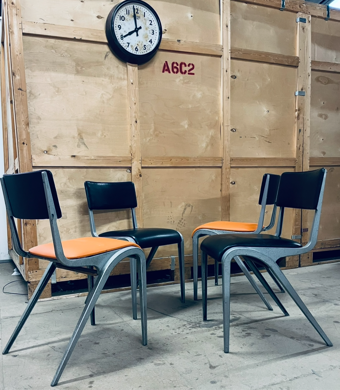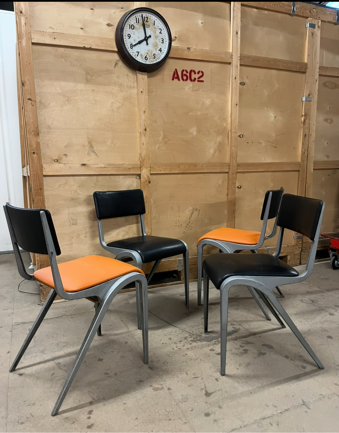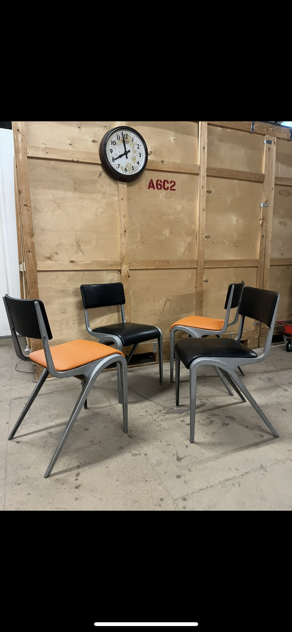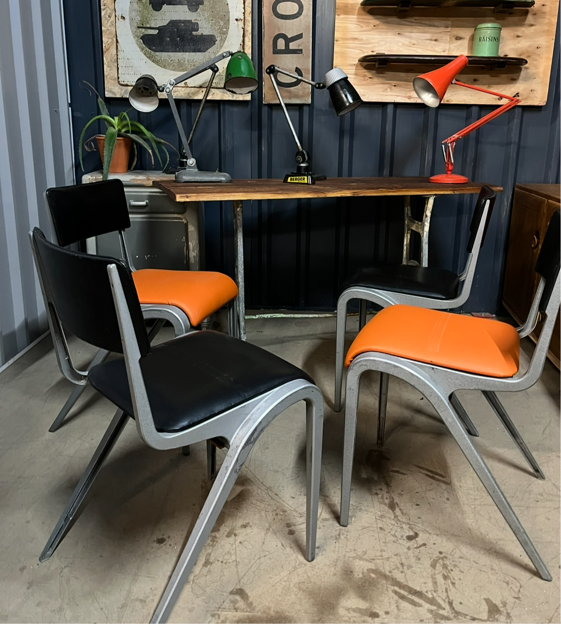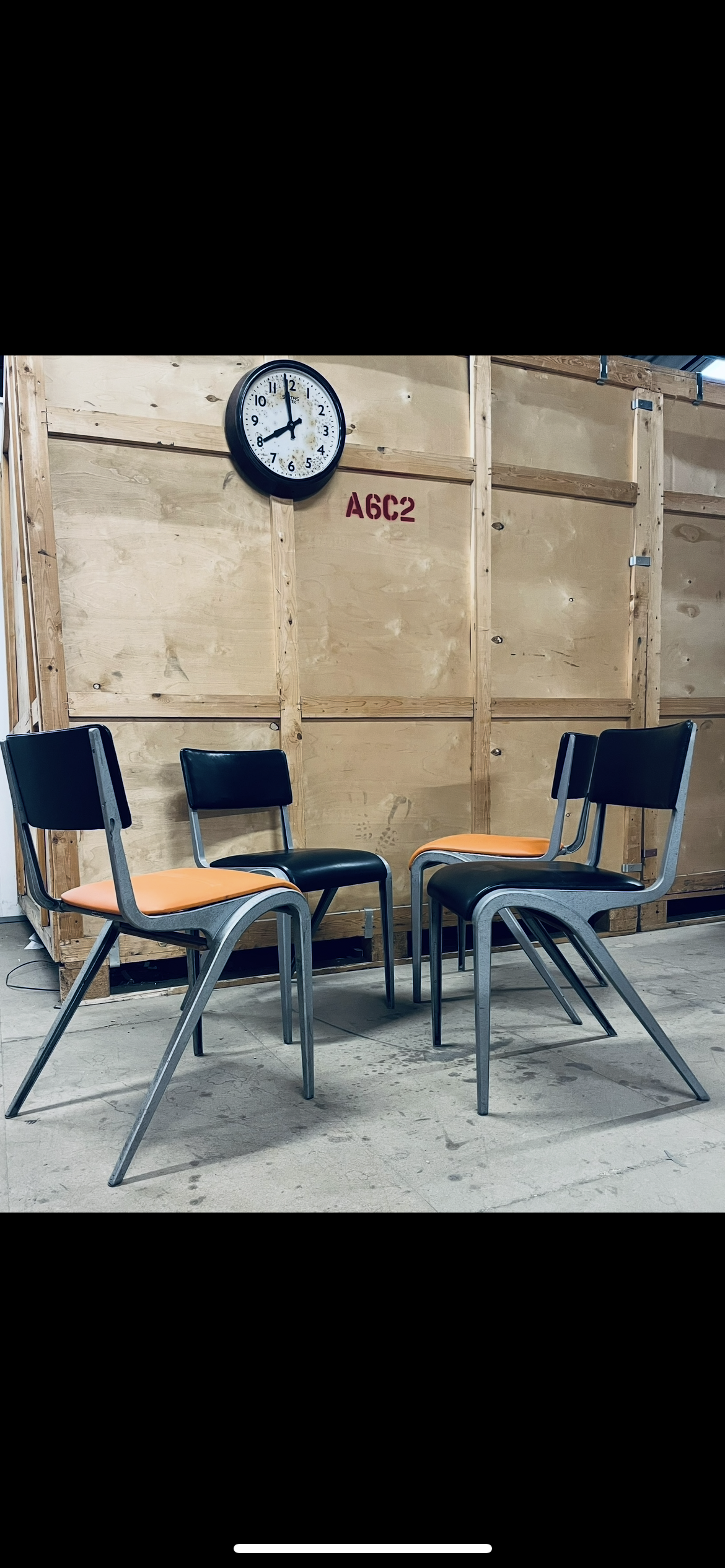 Beautiful aluminium swooping frames with faux leather cushions. Two black and two dark orange. These are becoming very hard to find now.