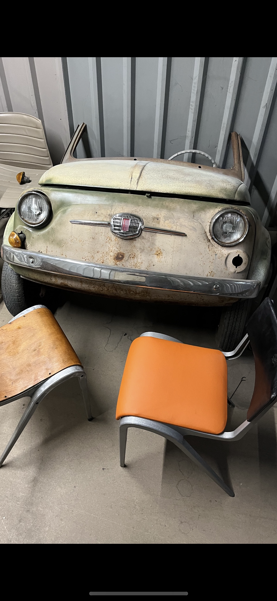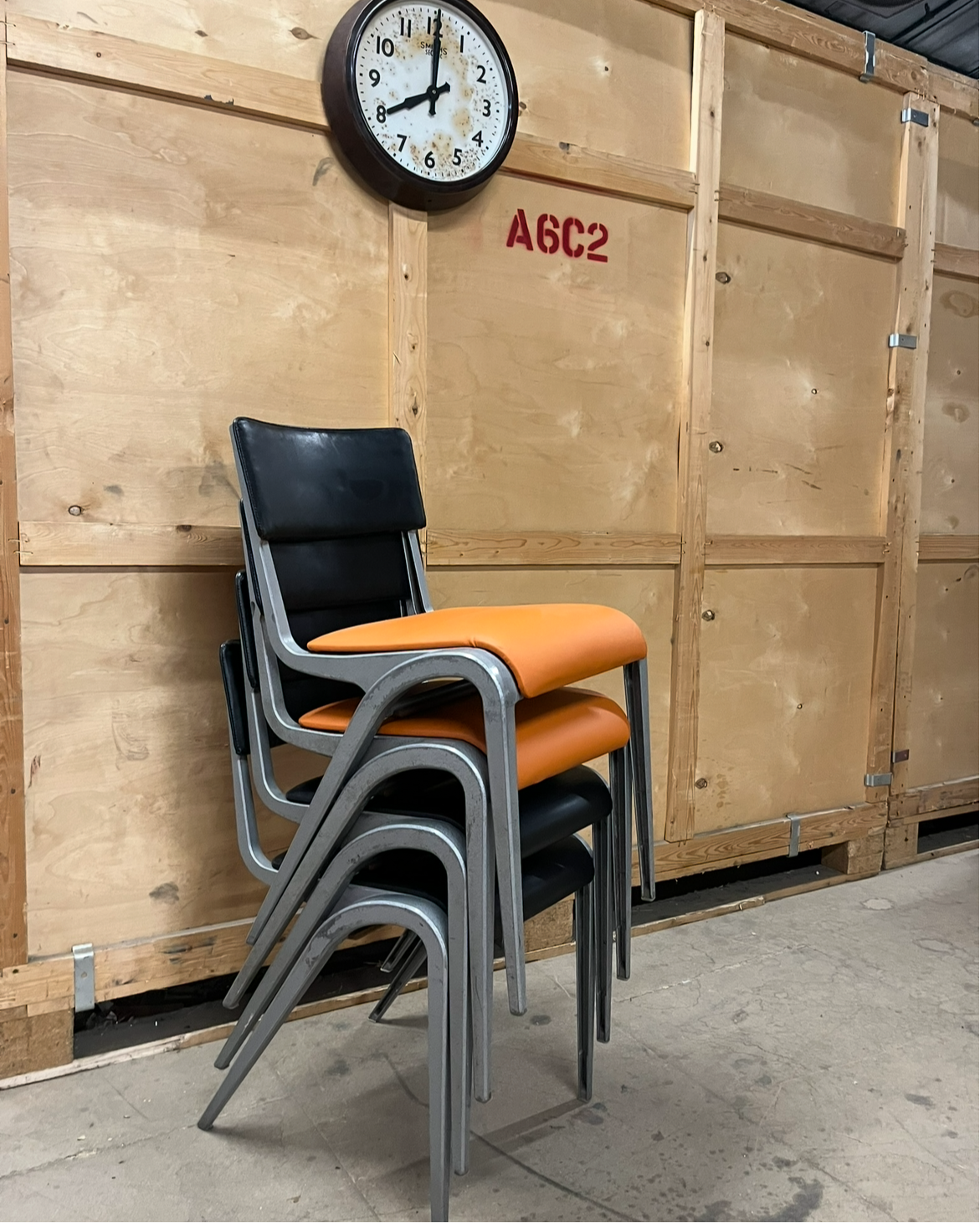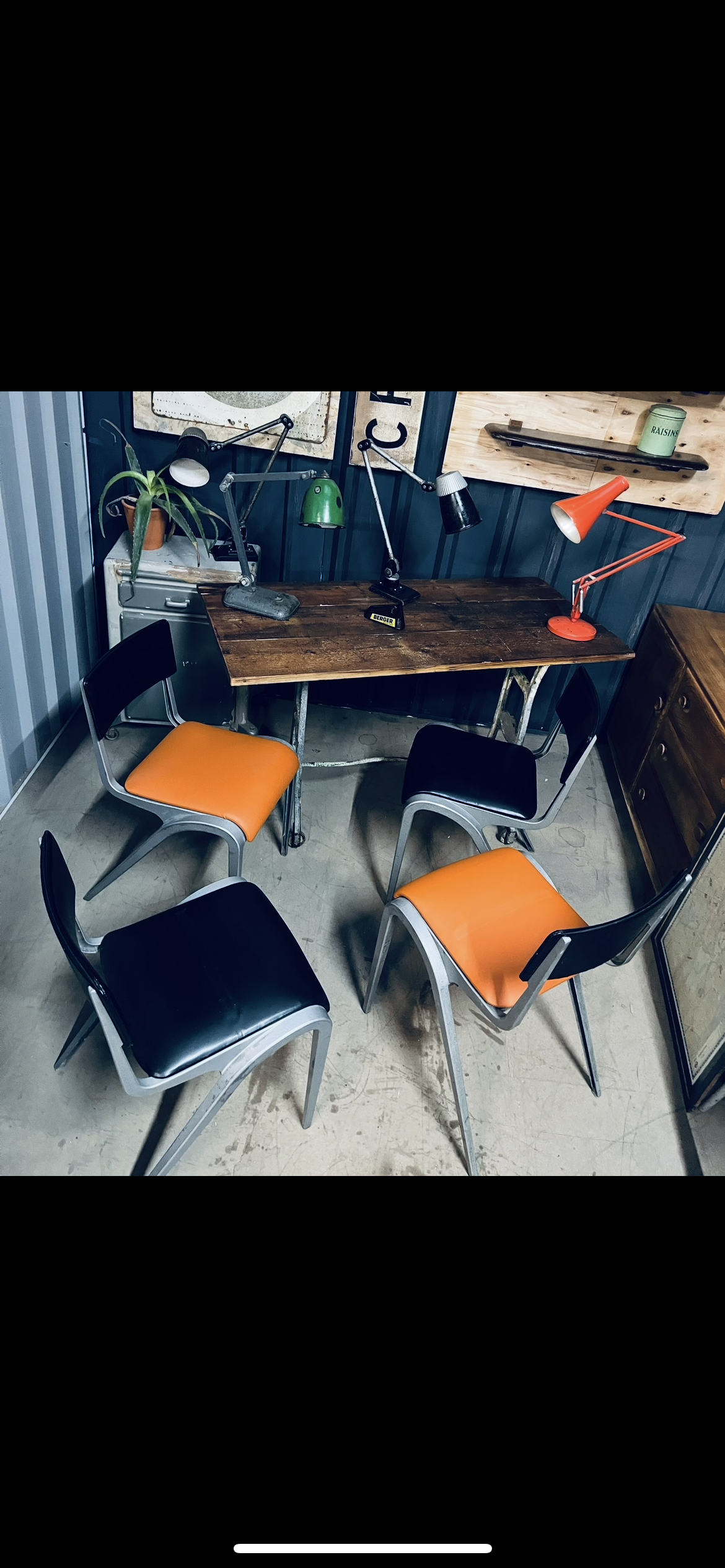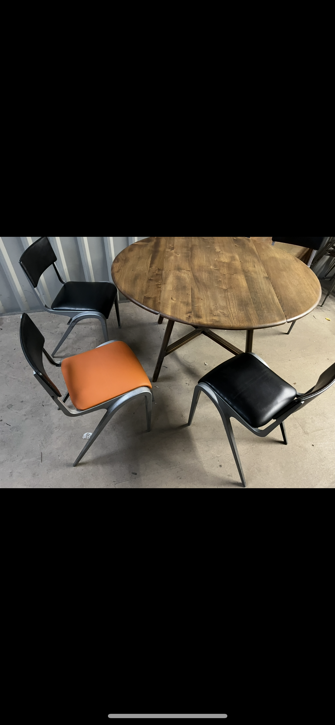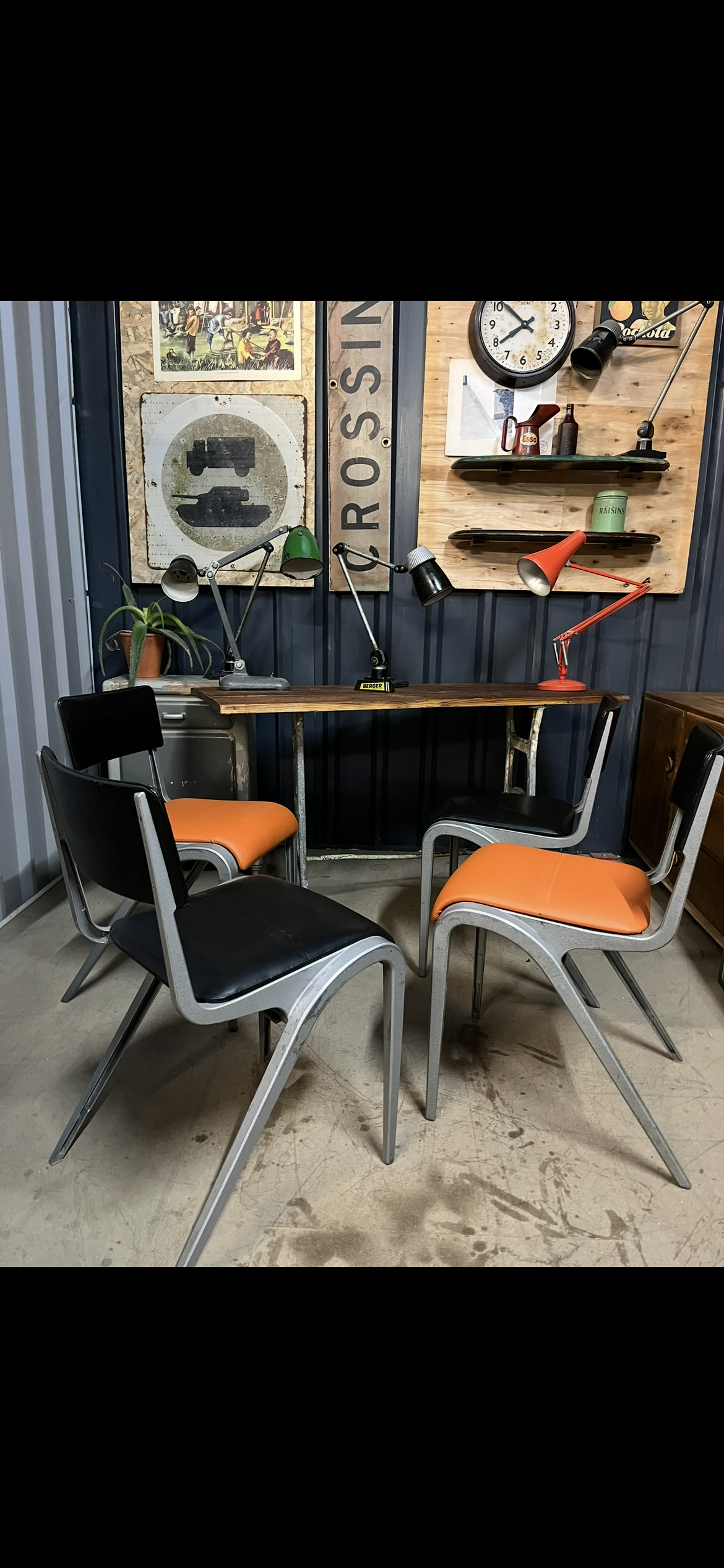 Beautiful aluminium swooping frames with faux leather cushions. Two black and two dark orange. These are becoming very hard to find now.