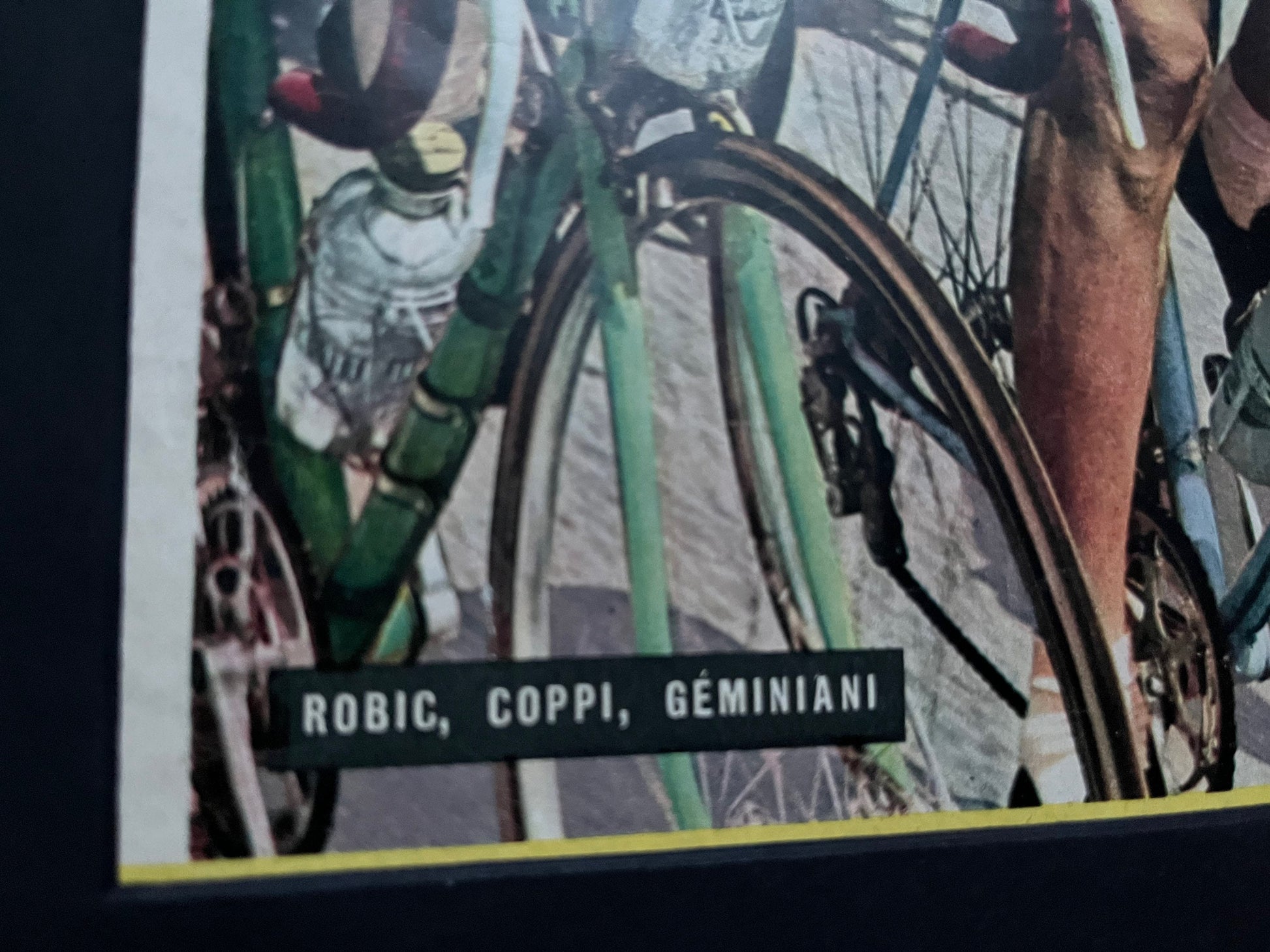 Iconic and very rare Original 1952 cycling magazine print featuring cycling legend Fausto Coppi in Bianchi racing kit riding alongside Raphael Geminiani and Jean Robic.