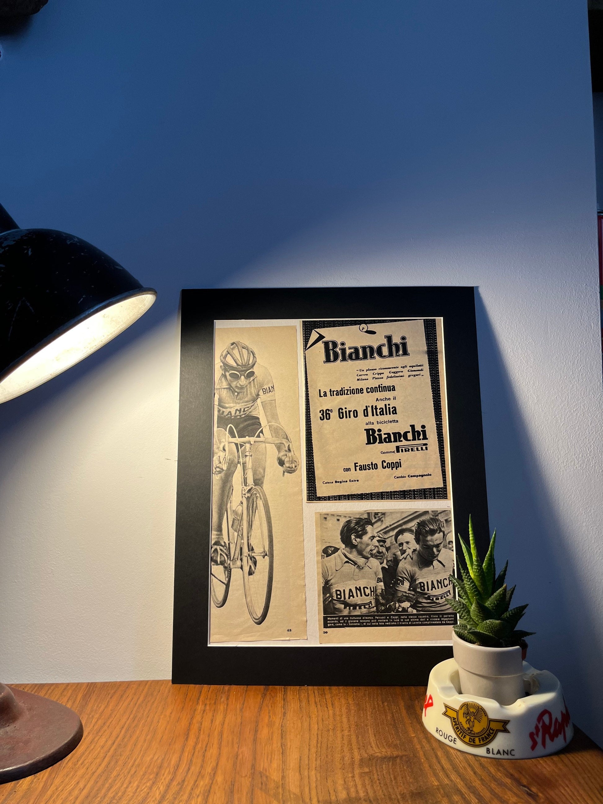 Original 1953 Fausto Coppi / Bianchi advertisements cut and mounted onto card and ready for framing. This is completely bespoke and has been created from several images. There is not is another one of these anywhere! All original prints and not a scanned copy.. A superb piece of artwork and an excellent gift
