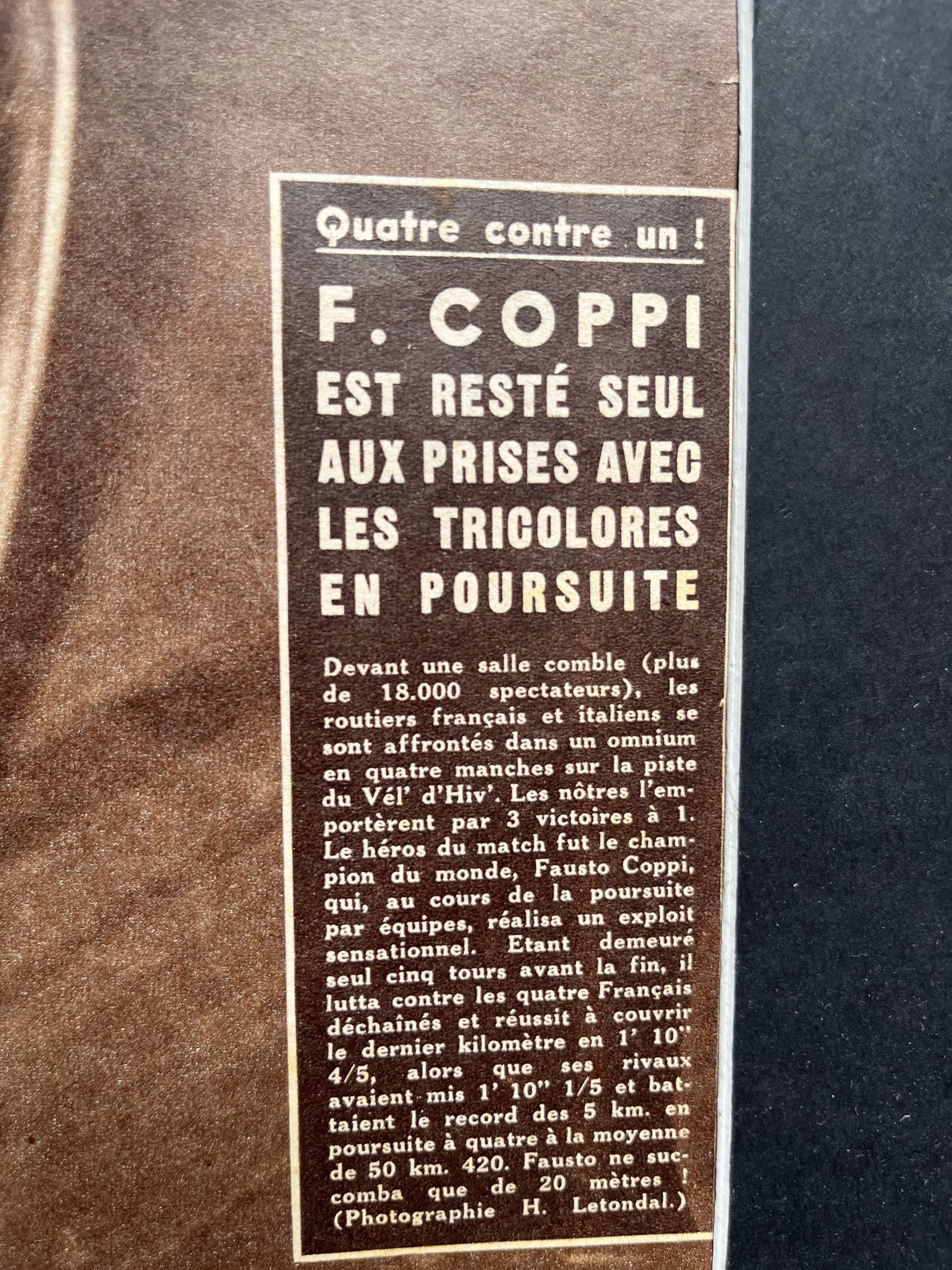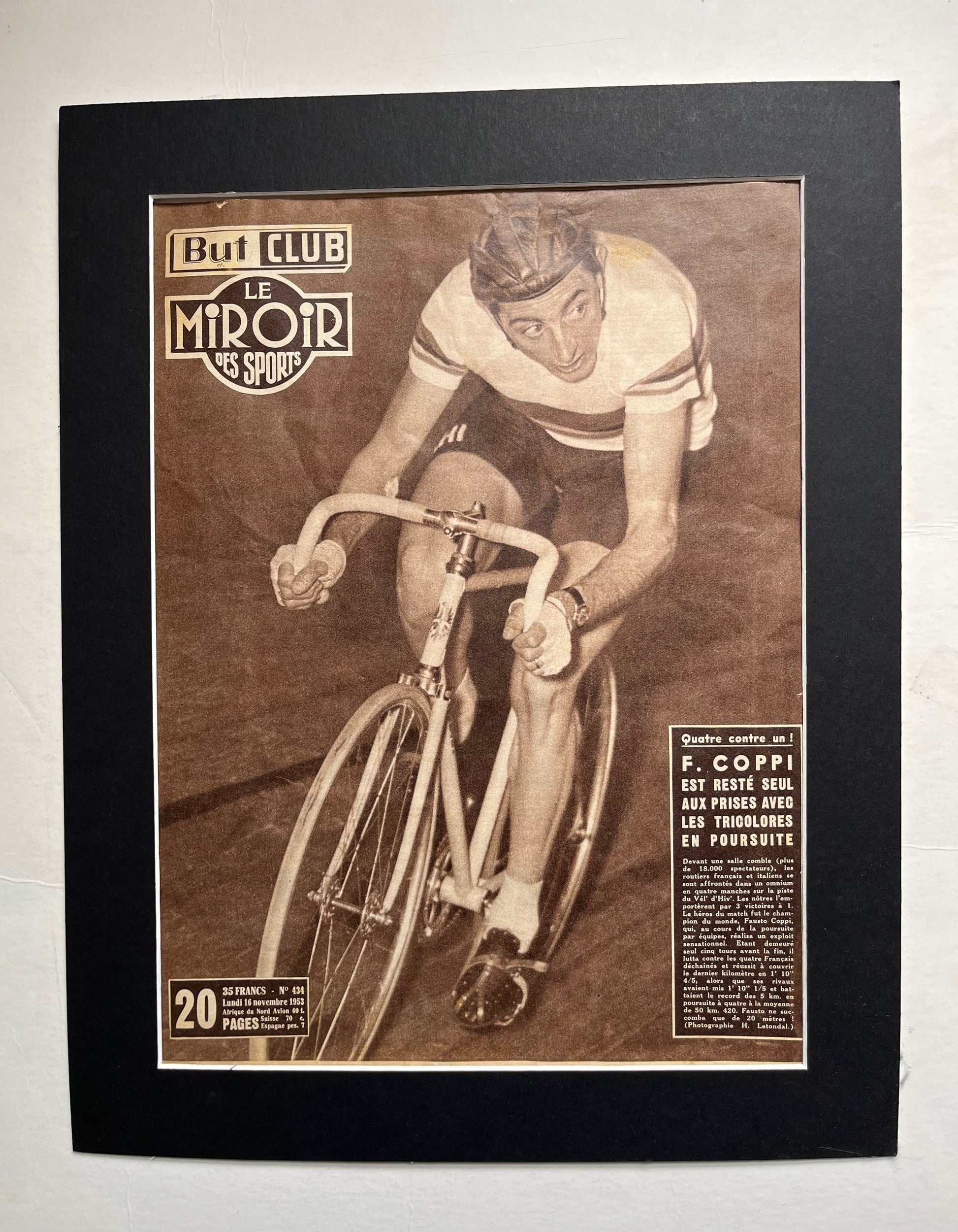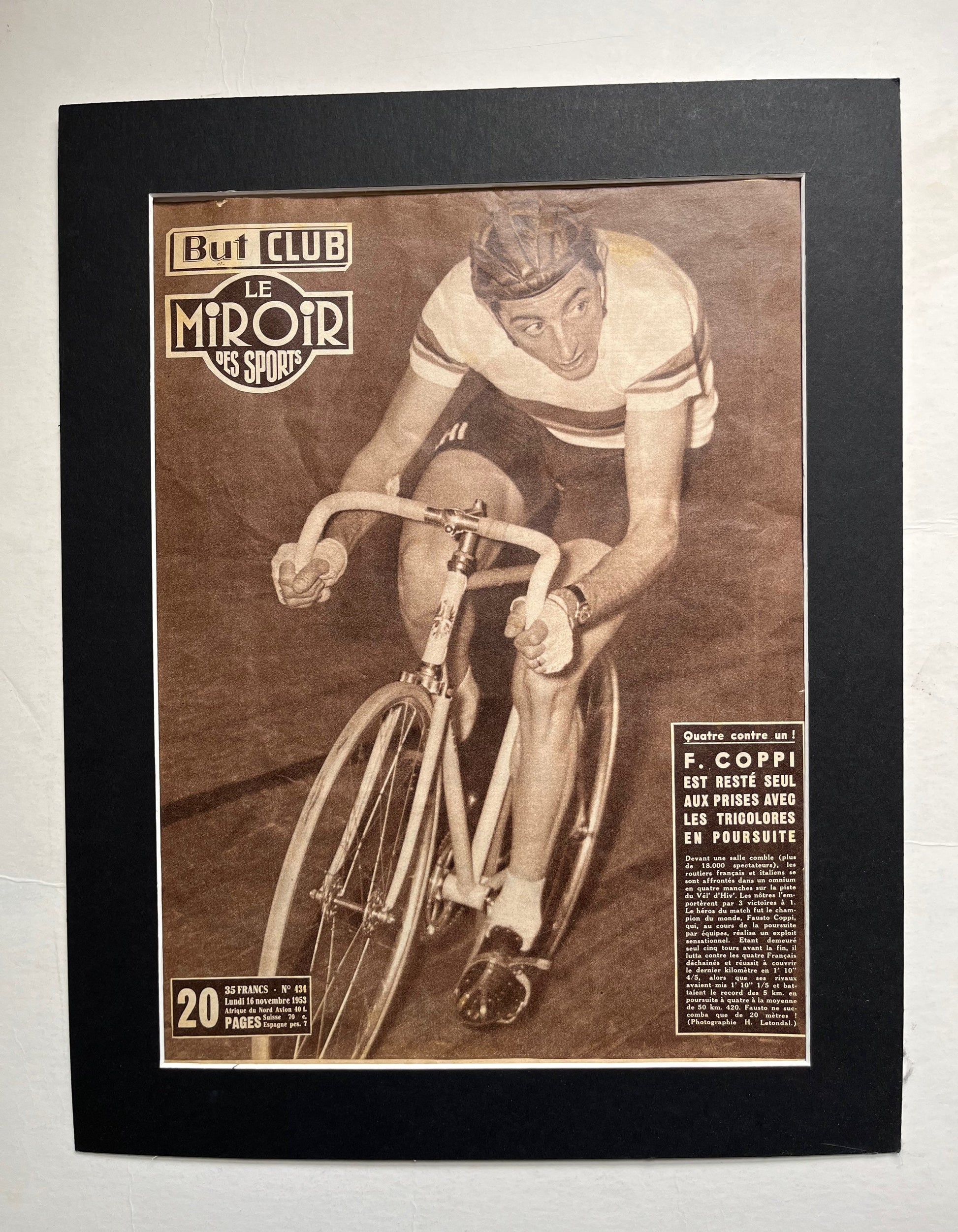 Iconic and very rare Original 1953 cycling magazine print featuring cycling legend Fausto Coppi in Bianchi racing kit.