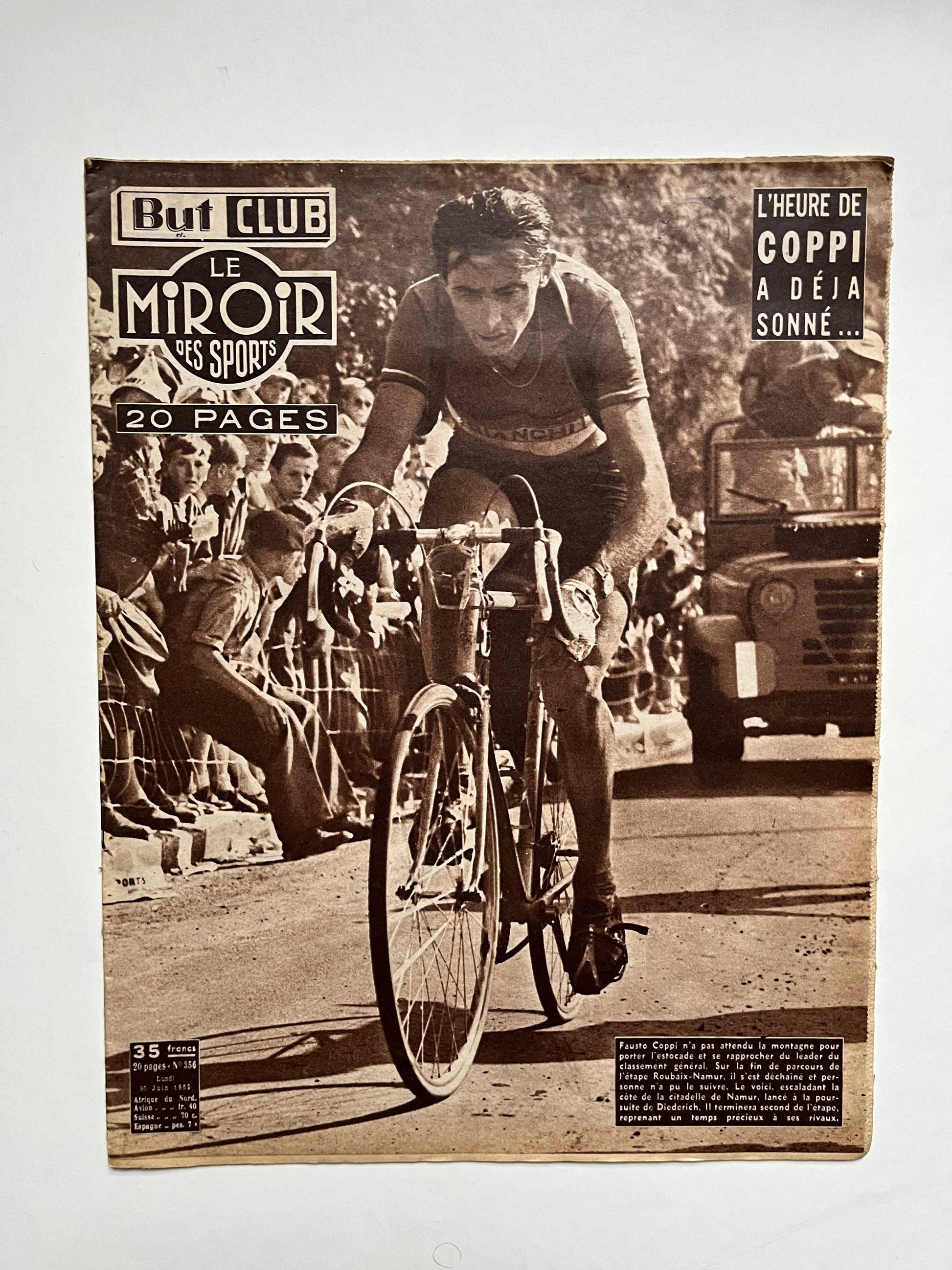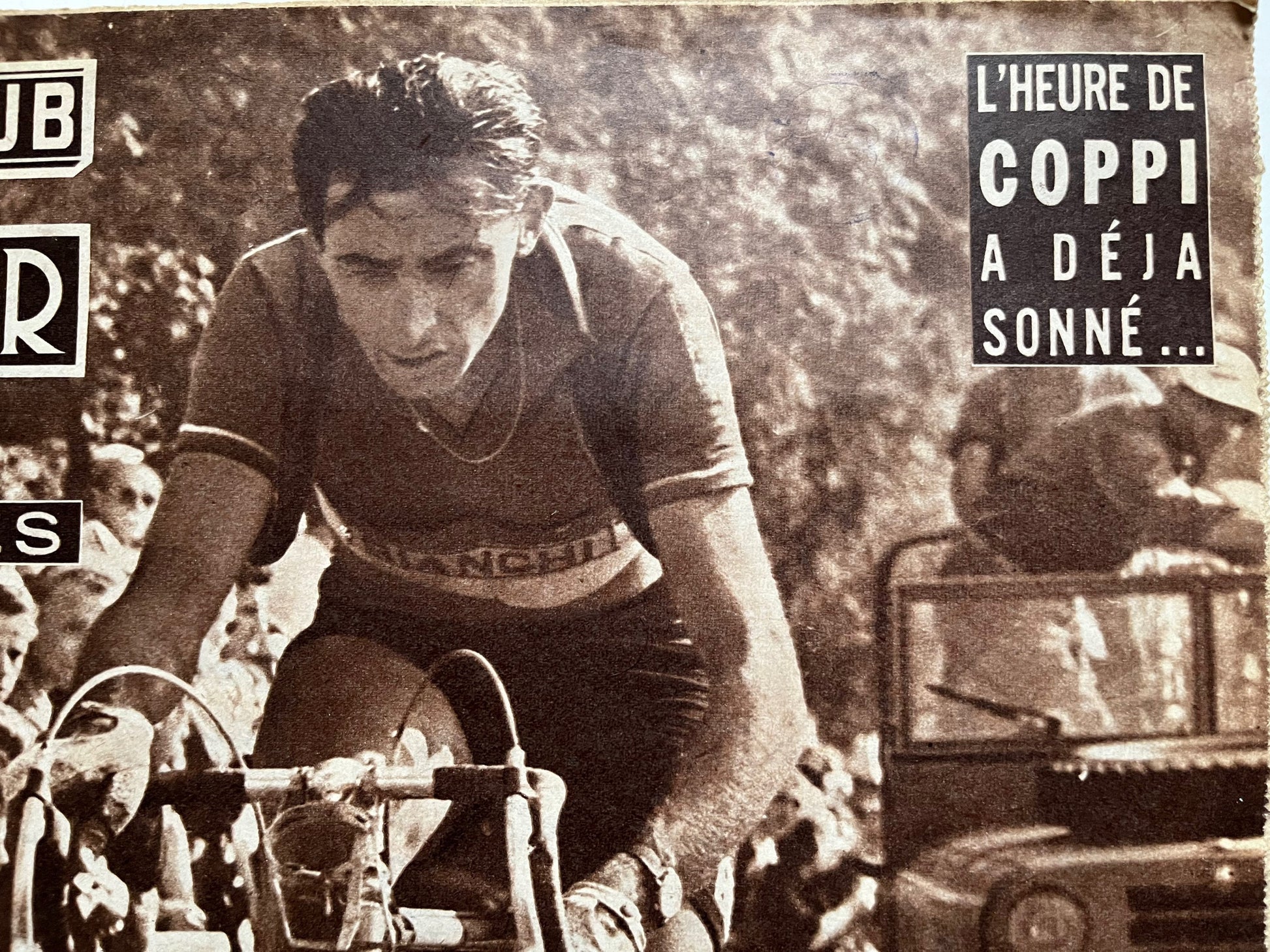Iconic and very rare Original 1953 cycling magazine print featuring cycling legend Fausto Coppi in Bianchi racing kit.
