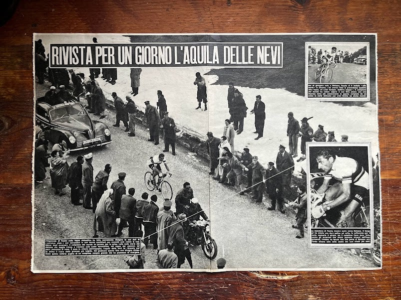 Iconic and very rare Italian magazine print of ‘il campionissimo’ cycling legend Fausto Coppi riding his Bianchi in the Giro D'Italia in 1952, which he won that year.