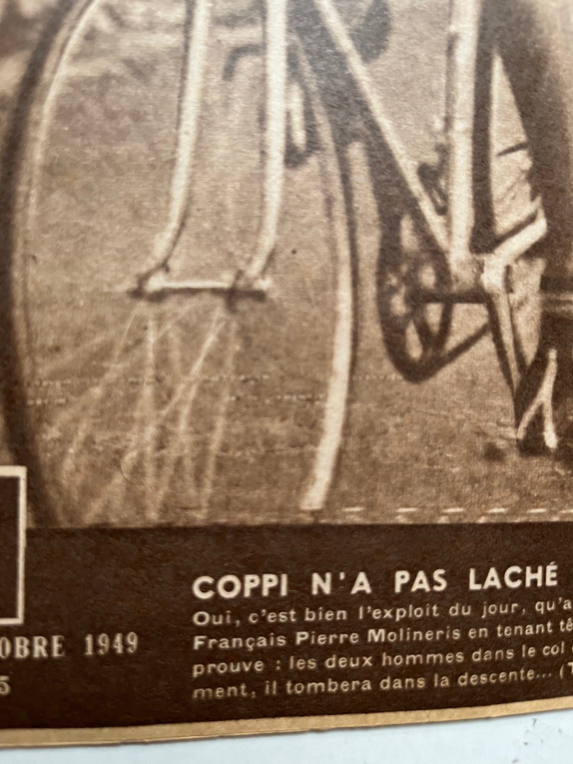 Iconic and very rare Original 1949 French cycling magazine print featuring cycling legend, “il campionissimo”Fausto Coppi leading Pierre Francois Mollineri.