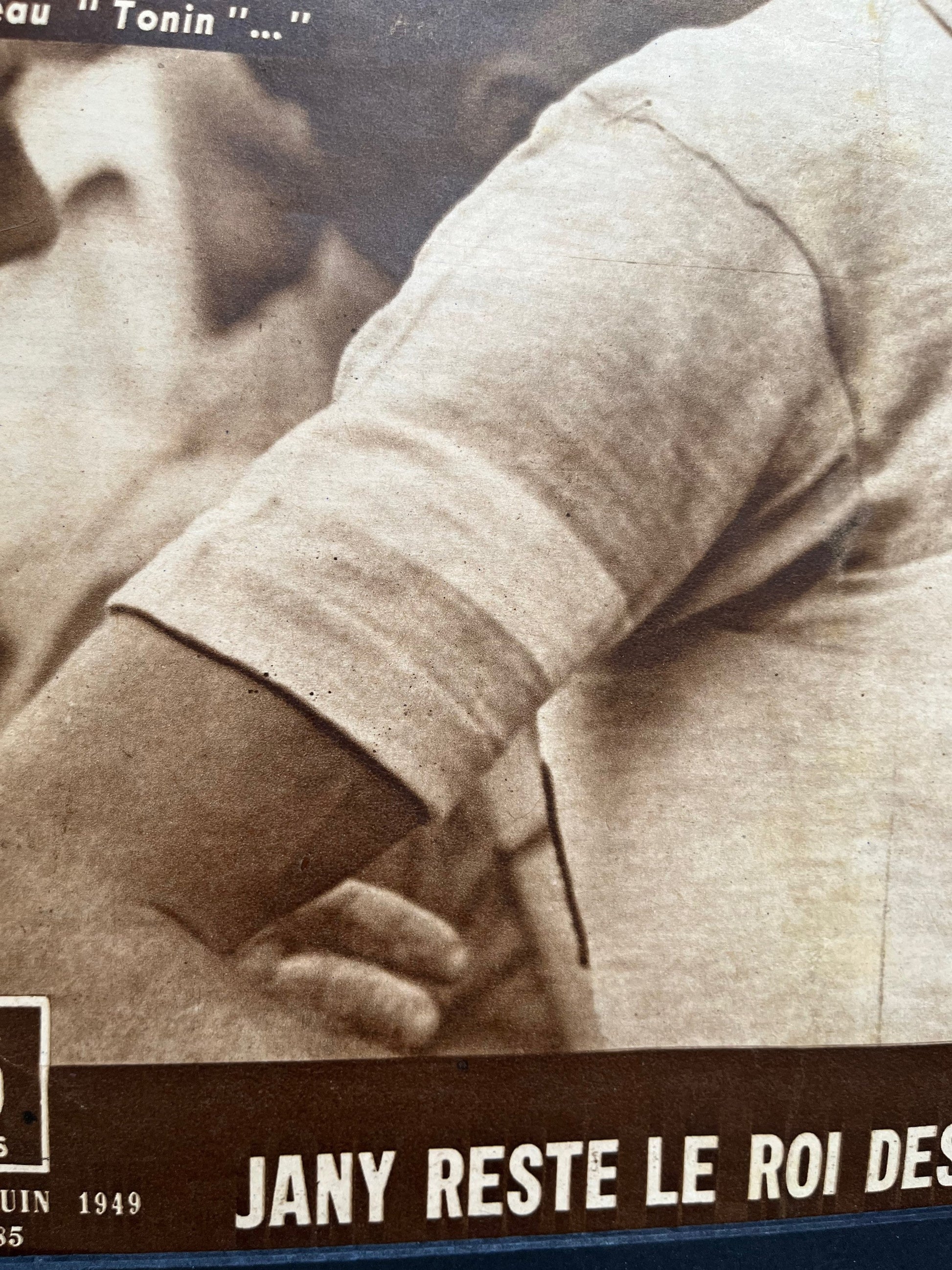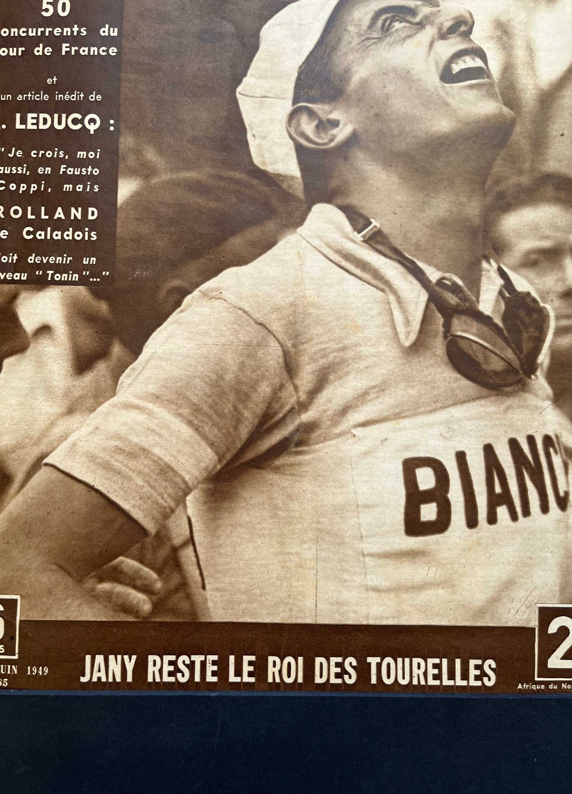 Very rare Original 1949 French cycling magazine cover featuring cycling legend Fausto Coppi in Bianchi racing kit in the Tour de France that year. An iconic image! Would look excellent framed.