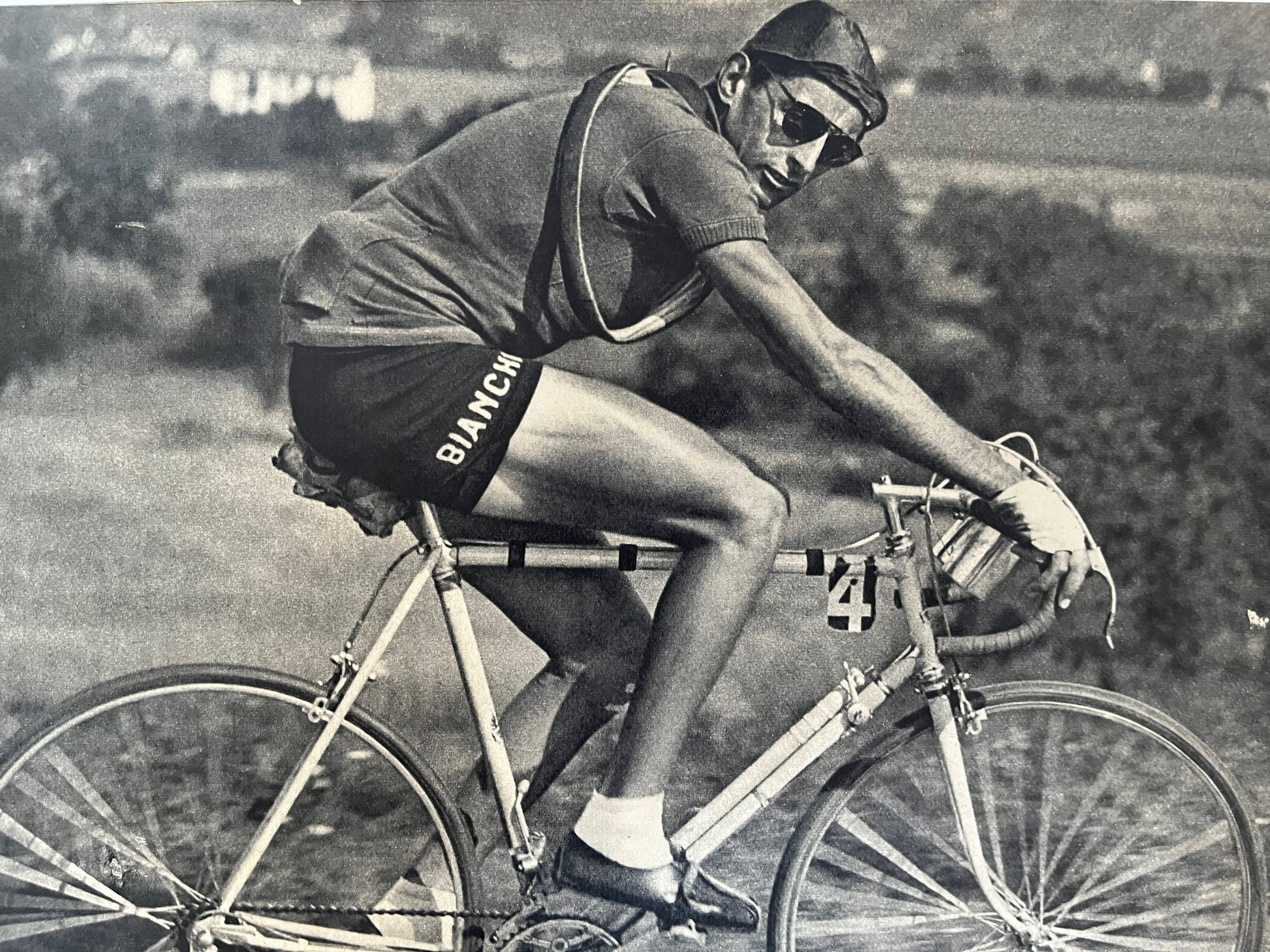 Iconic and very rare Italian magazine print of ‘il campionissimo’ cycling legend Fausto Coppi riding his Bianchi in the tour de France that year.