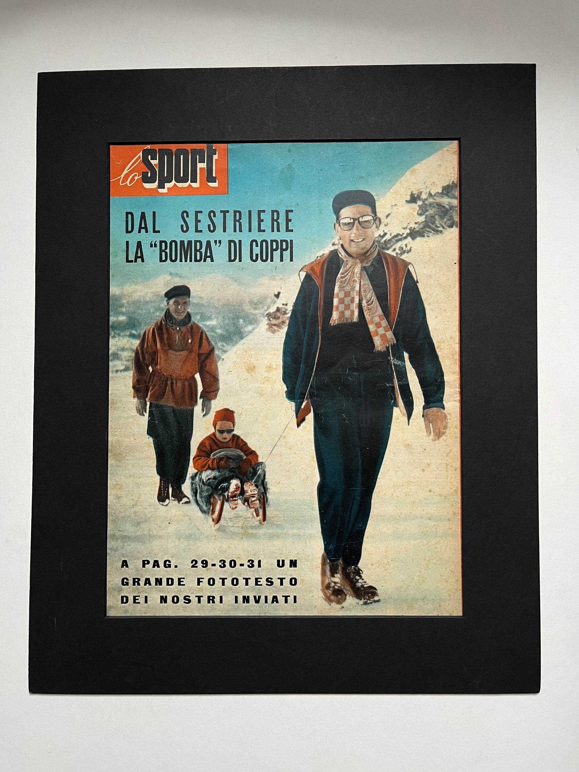 Iconic and very rare Italian magazine print of ‘il campionissimo’ cycling legend Fausto Coppi pulling his young son along on a sled in the Italian alps. A really cool image, showing Coppi not on a racing bicycle for a change.!