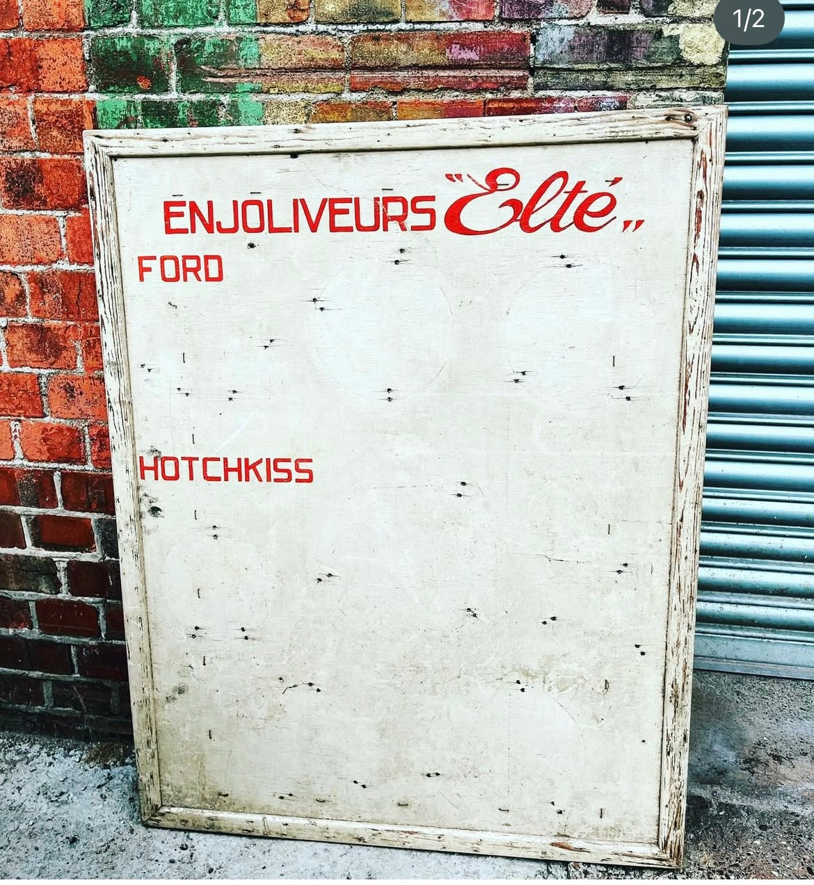 Vintage French display board / sign, for Ford and Hotchkiss hubcaps, circa 1950s.